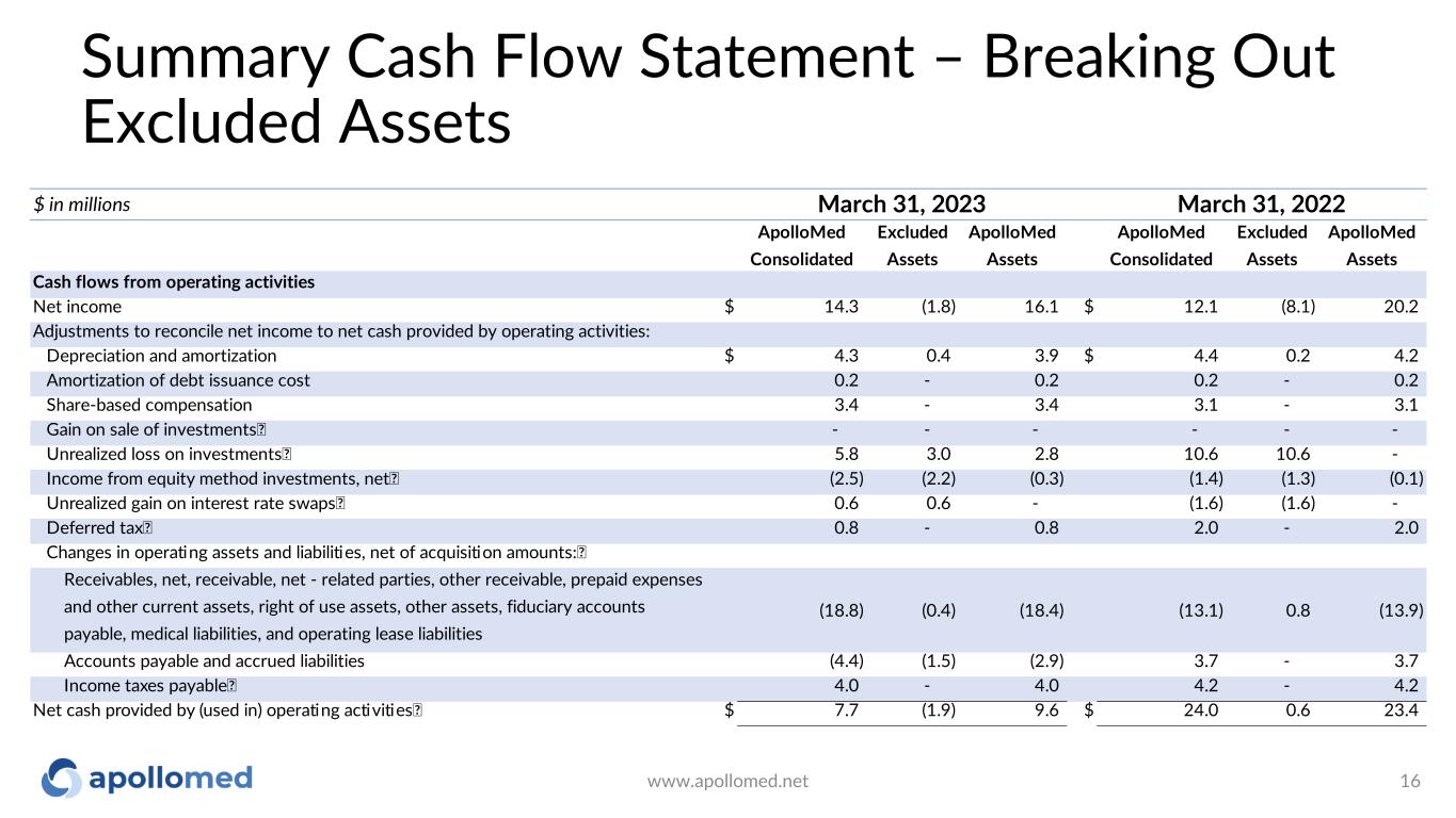 15 Summary Balance Sheet – Breaking Out Excluded Assets (continued) $ in millions ApolloMed Consolidated Excluded Assets ApolloMed Assets ApolloMed Consolidated Excluded Assets ApolloMed Assets Current liabilities Fiduciary payable, accounts payable and accrued liabilities $ 58.5 1.3 57.2 $ 57.7 2.8 54.9 Medical liabilities 101.4 - 101.4 84.3 - 84.3 Income taxes payable - 1.1 (1.1) - - - Dividend payable 0.7 - 0.7 0.7 - 0.7 Finance and operating lease liabilities 3.8 - 3.8 4.2 - 4.2 Current portion of long-term debt 0.6 0.6 - 0.6 0.6 - Total current liabilities 165.0 3.0 162.0 147.5 3.4 144.1 Non-current liabilities Deferred tax liability 3.7 0.9 2.8 3.0 0.9 2.1 Finance and operating lease liabilities , net of current portion 19.3 - 19.3 21.2 - 21.2 Other long-term liabilities 21.8 - 21.8 20.3 - 20.3 Long-term debt, net of current portion and deferred financing costs 204.9 28.0 176.9 203.4 26.6 176.8 Total non-current liabilities 249.7 28.9 220.8 247.9 27.5 220.4 Total liabilities 414.7 31.9 382.8 395.4 30.9 364.5 Total mezzanine equity and stockholder's equity $ 577.9 134.3 433.6 $ 568.4 135.6 432.8 March 31, 2023 December 31, 2022