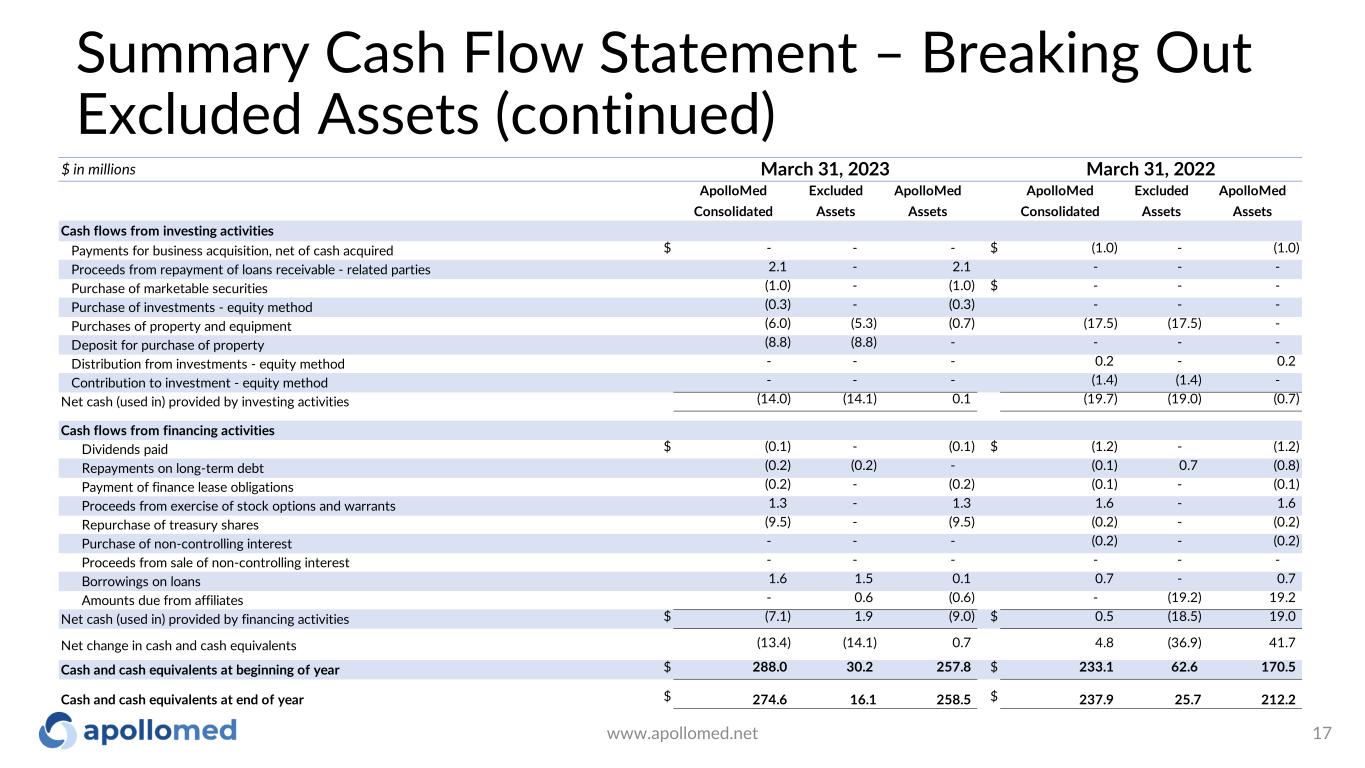 Summary Cash Flow Statement – Breaking Out Excluded Assets www.apollomed.net 16 $ in millions ApolloMed Consolidated Excluded Assets ApolloMed Assets ApolloMed Consolidated Excluded Assets ApolloMed Assets Cash flows from operating activities Net income $ 14.3 (1.8) 16.1 $ 12.1 (8.1) 20.2 Adjustments to reconcile net income to net cash provided by operating activities: Depreciation and amortization $ 4.3 0.4 3.9 $ 4.4 0.2 4.2 Amortization of debt issuance cost 0.2 - 0.2 0.2 - 0.2 Share-based compensation 3.4 - 3.4 3.1 - 3.1 Gain on sale of investments - - - - - - Unrealized loss on investments 5.8 3.0 2.8 10.6 10.6 - Income from equity method investments, net (2.5) (2.2) (0.3) (1.4) (1.3) (0.1) Unrealized gain on interest rate swaps 0.6 0.6 - (1.6) (1.6) - Deferred tax 0.8 - 0.8 2.0 - 2.0 Changes in operating assets and liabilities, net of acquisition amounts: Receivables, net, receivable, net - related parties, other receivable, prepaid expenses and other current assets, right of use assets, other assets, fiduciary accounts payable, medical liabilities, and operating lease liabilities (18.8) (0.4) (18.4) (13.1) 0.8 (13.9) Accounts payable and accrued liabilities (4.4) (1.5) (2.9) 3.7 - 3.7 Income taxes payable 4.0 - 4.0 4.2 - 4.2 Net cash provided by (used in) operating activities $ 7.7 (1.9) 9.6 $ 24.0 0.6 23.4 March 31, 2022March 31, 2023