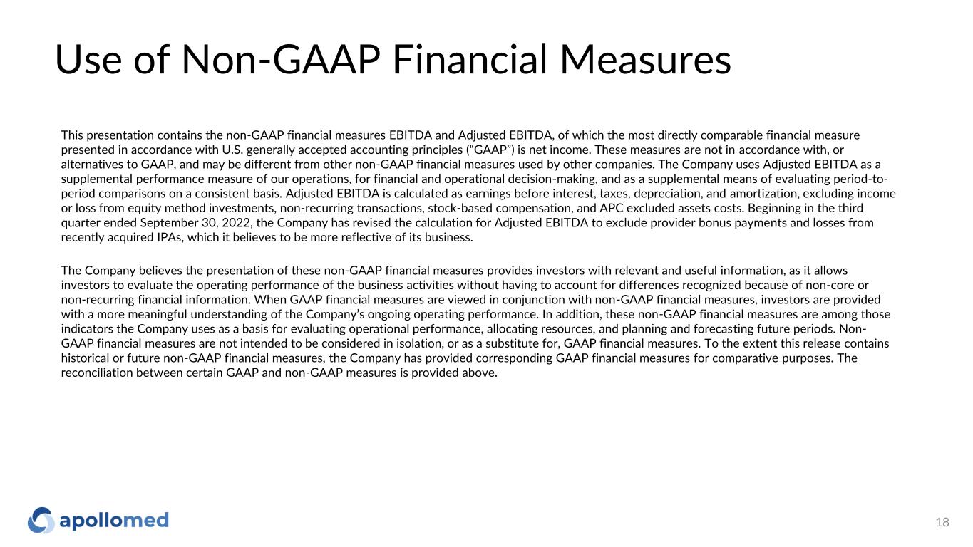 Use of Non-GAAP Financial Measures This presentation contains the non-GAAP financial measures EBITDA and Adjusted EBITDA, of which the most directly comparable financial measure presented in accordance with U.S. generally accepted accounting principles (“GAAP”) is net income. These measures are not in accordance with, or alternatives to GAAP, and may be different from other non-GAAP financial measures used by other companies. The Company uses Adjusted EBITDA as a supplemental performance measure of our operations, for financial and operational decision-making, and as a supplemental means of evaluating period-to- period comparisons on a consistent basis. Adjusted EBITDA is calculated as earnings before interest, taxes, depreciation, and amortization, excluding income or loss from equity method investments, non-recurring transactions, stock-based compensation, and APC excluded assets costs. Beginning in the third quarter ended September 30, 2022, the Company has revised the calculation for Adjusted EBITDA to exclude provider bonus payments and losses from recently acquired IPAs, which it believes to be more reflective of its business. The Company believes the presentation of these non-GAAP financial measures provides investors with relevant and useful information, as it allows investors to evaluate the operating performance of the business activities without having to account for differences recognized because of non-core or non-recurring financial information. When GAAP financial measures are viewed in conjunction with non-GAAP financial measures, investors are provided with a more meaningful understanding of the Company’s ongoing operating performance. In addition, these non-GAAP financial measures are among those indicators the Company uses as a basis for evaluating operational performance, allocating resources, and planning and forecasting future periods. Non- GAAP financial measures are not intended to be considered in isolation, or as a substitute for, GAAP financial measures. To the extent this release contains historical or future non-GAAP financial measures, the Company has provided corresponding GAAP financial measures for comparative purposes. The reconciliation between certain GAAP and non-GAAP measures is provided above. 18