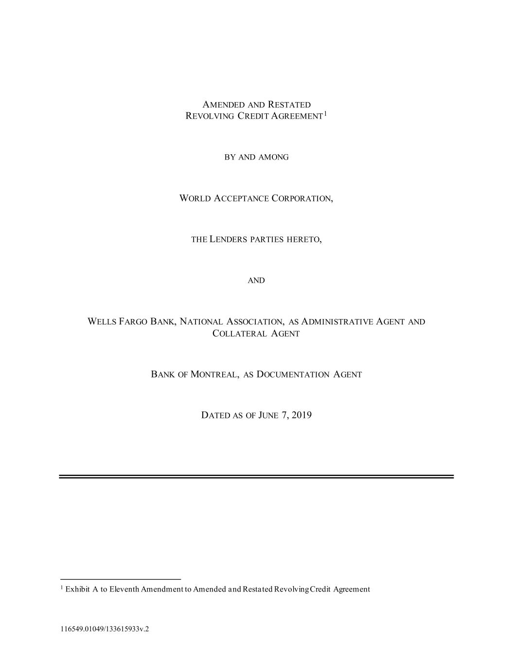 116549.01049/133615933v.2 AMENDED AND RESTATED REVOLVING CREDIT AGREEMENT1 BY AND AMONG WORLD ACCEPTANCE CORPORATION, THE LENDERS PARTIES HERETO, AND WELLS FARGO BANK, NATIONAL ASSOCIATION, AS ADMINISTRATIVE AGENT AND COLLATERAL AGENT BANK OF MONTREAL, AS DOCUMENTATION AGENT DATED AS OF JUNE 7, 2019 1 Exhibit A to Eleventh Amendment to Amended and Restated Revolving Credit Agreement