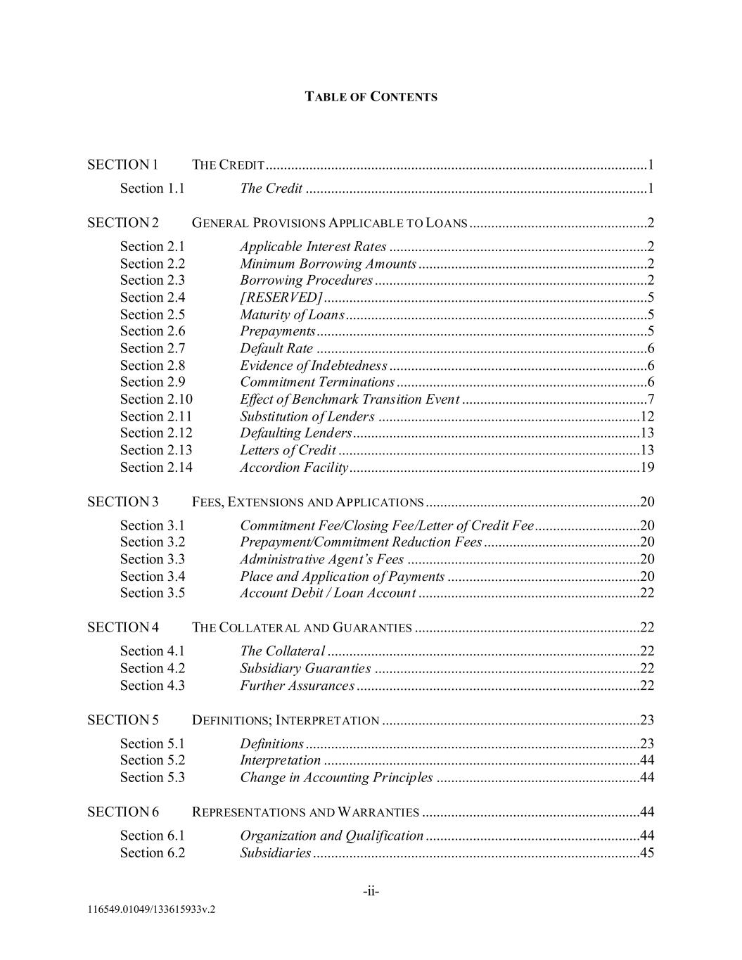 -ii- 116549.01049/133615933v.2 TABLE OF CONTENTS SECTION 1 THE CREDIT.........................................................................................................1 Section 1.1 The Credit ..............................................................................................1 SECTION 2 GENERAL PROVISIONS APPLICABLE TO LOANS .................................................2 Section 2.1 Applicable Interest Rates .......................................................................2 Section 2.2 Minimum Borrowing Amounts ...............................................................2 Section 2.3 Borrowing Procedures ...........................................................................2 Section 2.4 [RESERVED] .........................................................................................5 Section 2.5 Maturity of Loans...................................................................................5 Section 2.6 Prepayments...........................................................................................5 Section 2.7 Default Rate ...........................................................................................6 Section 2.8 Evidence of Indebtedness .......................................................................6 Section 2.9 Commitment Terminations .....................................................................6 Section 2.10 Effect of Benchmark Transition Event ...................................................7 Section 2.11 Substitution of Lenders ........................................................................12 Section 2.12 Defaulting Lenders...............................................................................13 Section 2.13 Letters of Credit ...................................................................................13 Section 2.14 Accordion Facility................................................................................19 SECTION 3 FEES, EXTENSIONS AND APPLICATIONS ...........................................................20 Section 3.1 Commitment Fee/Closing Fee/Letter of Credit Fee.............................20 Section 3.2 Prepayment/Commitment Reduction Fees ...........................................20 Section 3.3 Administrative Agent’s Fees ................................................................20 Section 3.4 Place and Application of Payments .....................................................20 Section 3.5 Account Debit / Loan Account .............................................................22 SECTION 4 THE COLLATERAL AND GUARANTIES ..............................................................22 Section 4.1 The Collateral ......................................................................................22 Section 4.2 Subsidiary Guaranties .........................................................................22 Section 4.3 Further Assurances ..............................................................................22 SECTION 5 DEFINITIONS; INTERPRETATION .......................................................................23 Section 5.1 Definitions ............................................................................................23 Section 5.2 Interpretation .......................................................................................44 Section 5.3 Change in Accounting Principles ........................................................44 SECTION 6 REPRESENTATIONS AND WARRANTIES ............................................................44 Section 6.1 Organization and Qualification ...........................................................44 Section 6.2 Subsidiaries ..........................................................................................45
