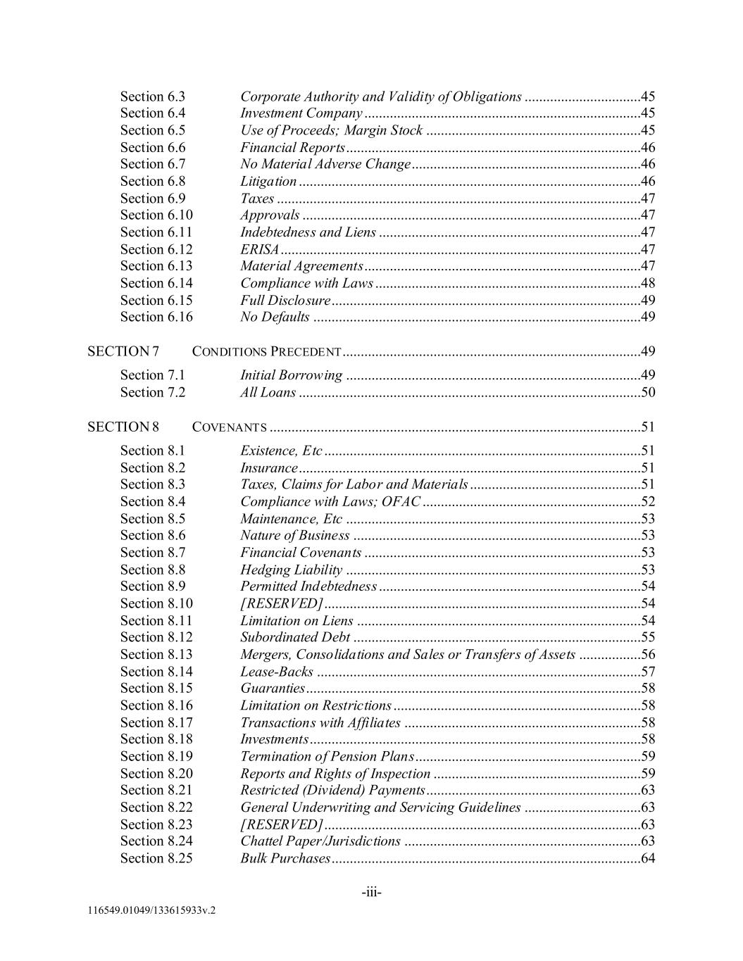 -iii- 116549.01049/133615933v.2 Section 6.3 Corporate Authority and Validity of Obligations ................................45 Section 6.4 Investment Company ............................................................................45 Section 6.5 Use of Proceeds; Margin Stock ...........................................................45 Section 6.6 Financial Reports.................................................................................46 Section 6.7 No Material Adverse Change...............................................................46 Section 6.8 Litigation ..............................................................................................46 Section 6.9 Taxes ....................................................................................................47 Section 6.10 Approvals .............................................................................................47 Section 6.11 Indebtedness and Liens ........................................................................47 Section 6.12 ERISA ...................................................................................................47 Section 6.13 Material Agreements............................................................................47 Section 6.14 Compliance with Laws .........................................................................48 Section 6.15 Full Disclosure.....................................................................................49 Section 6.16 No Defaults ..........................................................................................49 SECTION 7 CONDITIONS PRECEDENT..................................................................................49 Section 7.1 Initial Borrowing .................................................................................49 Section 7.2 All Loans ..............................................................................................50 SECTION 8 COVENANTS ......................................................................................................51 Section 8.1 Existence, Etc .......................................................................................51 Section 8.2 Insurance..............................................................................................51 Section 8.3 Taxes, Claims for Labor and Materials ...............................................51 Section 8.4 Compliance with Laws; OFAC ............................................................52 Section 8.5 Maintenance, Etc .................................................................................53 Section 8.6 Nature of Business ...............................................................................53 Section 8.7 Financial Covenants ............................................................................53 Section 8.8 Hedging Liability .................................................................................53 Section 8.9 Permitted Indebtedness ........................................................................54 Section 8.10 [RESERVED] .......................................................................................54 Section 8.11 Limitation on Liens ..............................................................................54 Section 8.12 Subordinated Debt ...............................................................................55 Section 8.13 Mergers, Consolidations and Sales or Transfers of Assets .................56 Section 8.14 Lease-Backs .........................................................................................57 Section 8.15 Guaranties............................................................................................58 Section 8.16 Limitation on Restrictions ....................................................................58 Section 8.17 Transactions with Affiliates .................................................................58 Section 8.18 Investments...........................................................................................58 Section 8.19 Termination of Pension Plans..............................................................59 Section 8.20 Reports and Rights of Inspection .........................................................59 Section 8.21 Restricted (Dividend) Payments...........................................................63 Section 8.22 General Underwriting and Servicing Guidelines ................................63 Section 8.23 [RESERVED] .......................................................................................63 Section 8.24 Chattel Paper/Jurisdictions .................................................................63 Section 8.25 Bulk Purchases.....................................................................................64