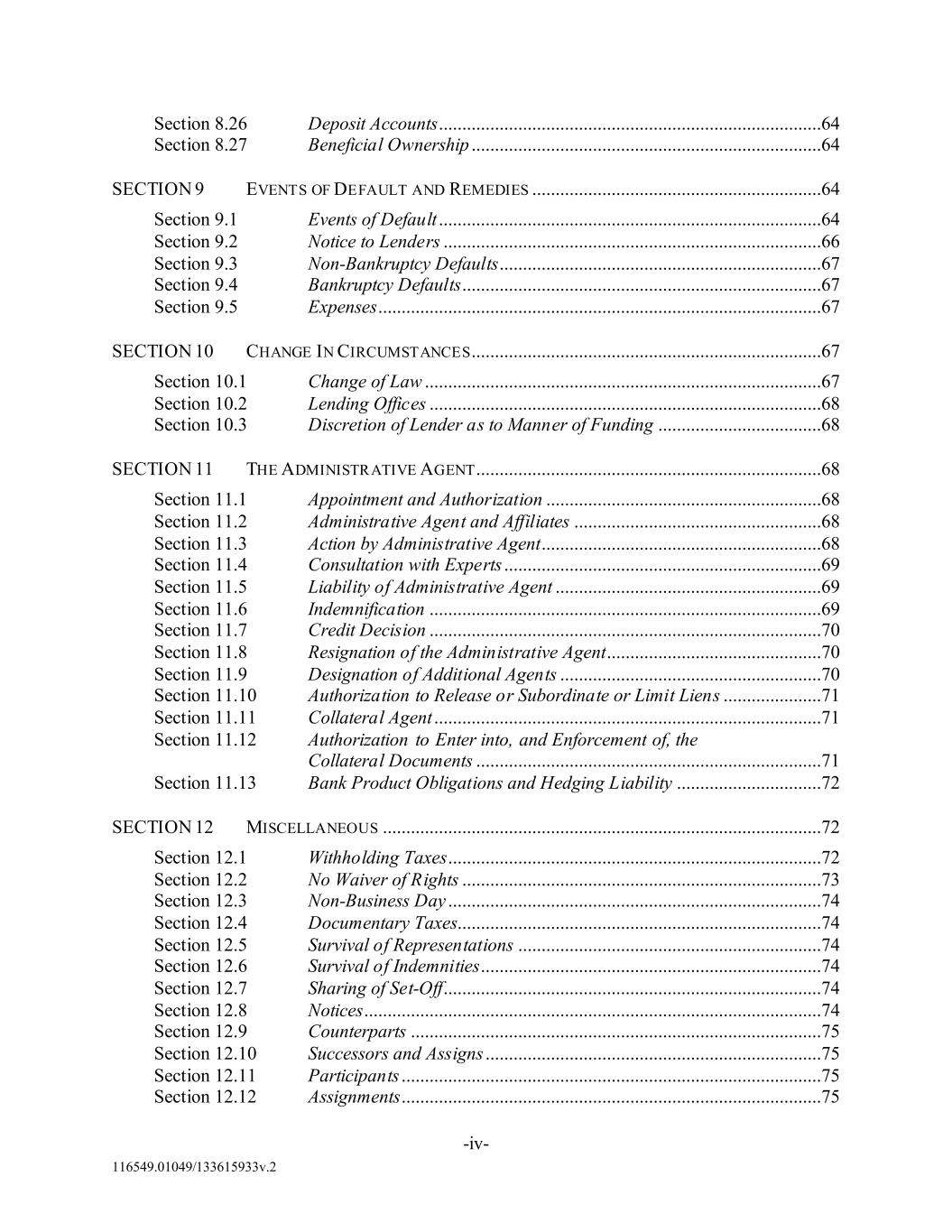-iv- 116549.01049/133615933v.2 Section 8.26 Deposit Accounts..................................................................................64 Section 8.27 Beneficial Ownership ...........................................................................64 SECTION 9 EVENTS OF DEFAULT AND REMEDIES ..............................................................64 Section 9.1 Events of Default ..................................................................................64 Section 9.2 Notice to Lenders .................................................................................66 Section 9.3 Non-Bankruptcy Defaults.....................................................................67 Section 9.4 Bankruptcy Defaults.............................................................................67 Section 9.5 Expenses...............................................................................................67 SECTION 10 CHANGE IN CIRCUMSTANCES...........................................................................67 Section 10.1 Change of Law .....................................................................................67 Section 10.2 Lending Offices ....................................................................................68 Section 10.3 Discretion of Lender as to Manner of Funding ...................................68 SECTION 11 THE ADMINISTRATIVE AGENT..........................................................................68 Section 11.1 Appointment and Authorization ...........................................................68 Section 11.2 Administrative Agent and Affiliates .....................................................68 Section 11.3 Action by Administrative Agent............................................................68 Section 11.4 Consultation with Experts ....................................................................69 Section 11.5 Liability of Administrative Agent .........................................................69 Section 11.6 Indemnification ....................................................................................69 Section 11.7 Credit Decision ....................................................................................70 Section 11.8 Resignation of the Administrative Agent..............................................70 Section 11.9 Designation of Additional Agents ........................................................70 Section 11.10 Authorization to Release or Subordinate or Limit Liens .....................71 Section 11.11 Collateral Agent ...................................................................................71 Section 11.12 Authorization to Enter into, and Enforcement of, the Collateral Documents ..........................................................................71 Section 11.13 Bank Product Obligations and Hedging Liability ...............................72 SECTION 12 MISCELLANEOUS ..............................................................................................72 Section 12.1 Withholding Taxes................................................................................72 Section 12.2 No Waiver of Rights .............................................................................73 Section 12.3 Non-Business Day ................................................................................74 Section 12.4 Documentary Taxes..............................................................................74 Section 12.5 Survival of Representations .................................................................74 Section 12.6 Survival of Indemnities.........................................................................74 Section 12.7 Sharing of Set-Off.................................................................................74 Section 12.8 Notices..................................................................................................74 Section 12.9 Counterparts ........................................................................................75 Section 12.10 Successors and Assigns ........................................................................75 Section 12.11 Participants ..........................................................................................75 Section 12.12 Assignments..........................................................................................75