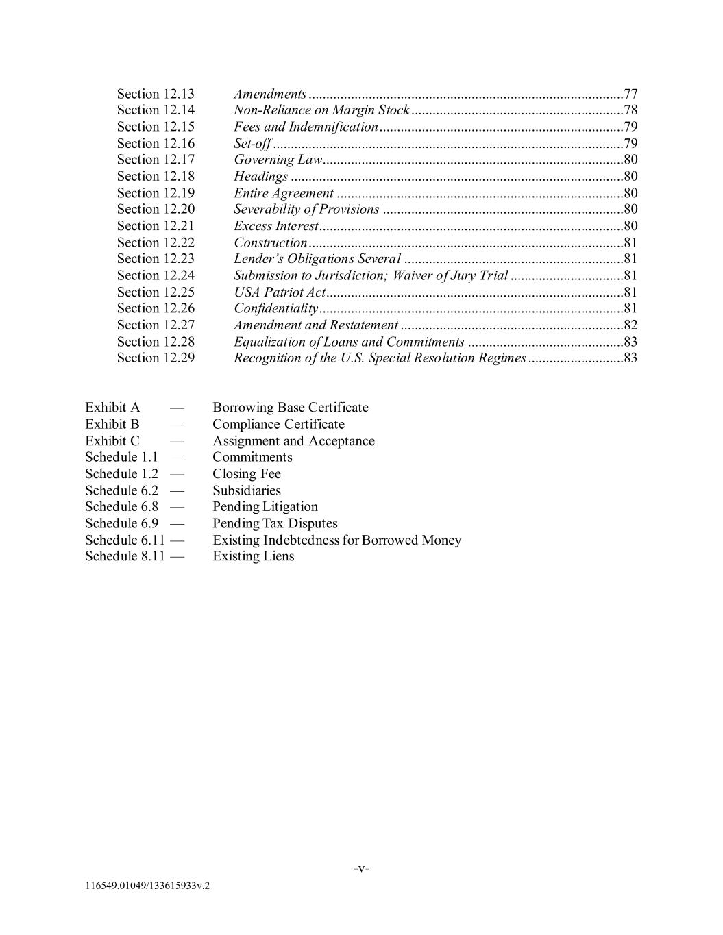 -v- 116549.01049/133615933v.2 Section 12.13 Amendments .........................................................................................77 Section 12.14 Non-Reliance on Margin Stock ............................................................78 Section 12.15 Fees and Indemnification.....................................................................79 Section 12.16 Set-off ...................................................................................................79 Section 12.17 Governing Law.....................................................................................80 Section 12.18 Headings ..............................................................................................80 Section 12.19 Entire Agreement .................................................................................80 Section 12.20 Severability of Provisions ....................................................................80 Section 12.21 Excess Interest......................................................................................80 Section 12.22 Construction.........................................................................................81 Section 12.23 Lender’s Obligations Several ..............................................................81 Section 12.24 Submission to Jurisdiction; Waiver of Jury Trial ................................81 Section 12.25 USA Patriot Act....................................................................................81 Section 12.26 Confidentiality......................................................................................81 Section 12.27 Amendment and Restatement ...............................................................82 Section 12.28 Equalization of Loans and Commitments ............................................83 Section 12.29 Recognition of the U.S. Special Resolution Regimes ...........................83 Exhibit A — Borrowing Base Certificate Exhibit B — Compliance Certificate Exhibit C — Assignment and Acceptance Schedule 1.1 — Commitments Schedule 1.2 — Closing Fee Schedule 6.2 — Subsidiaries Schedule 6.8 — Pending Litigation Schedule 6.9 — Pending Tax Disputes Schedule 6.11 — Existing Indebtedness for Borrowed Money Schedule 8.11 — Existing Liens