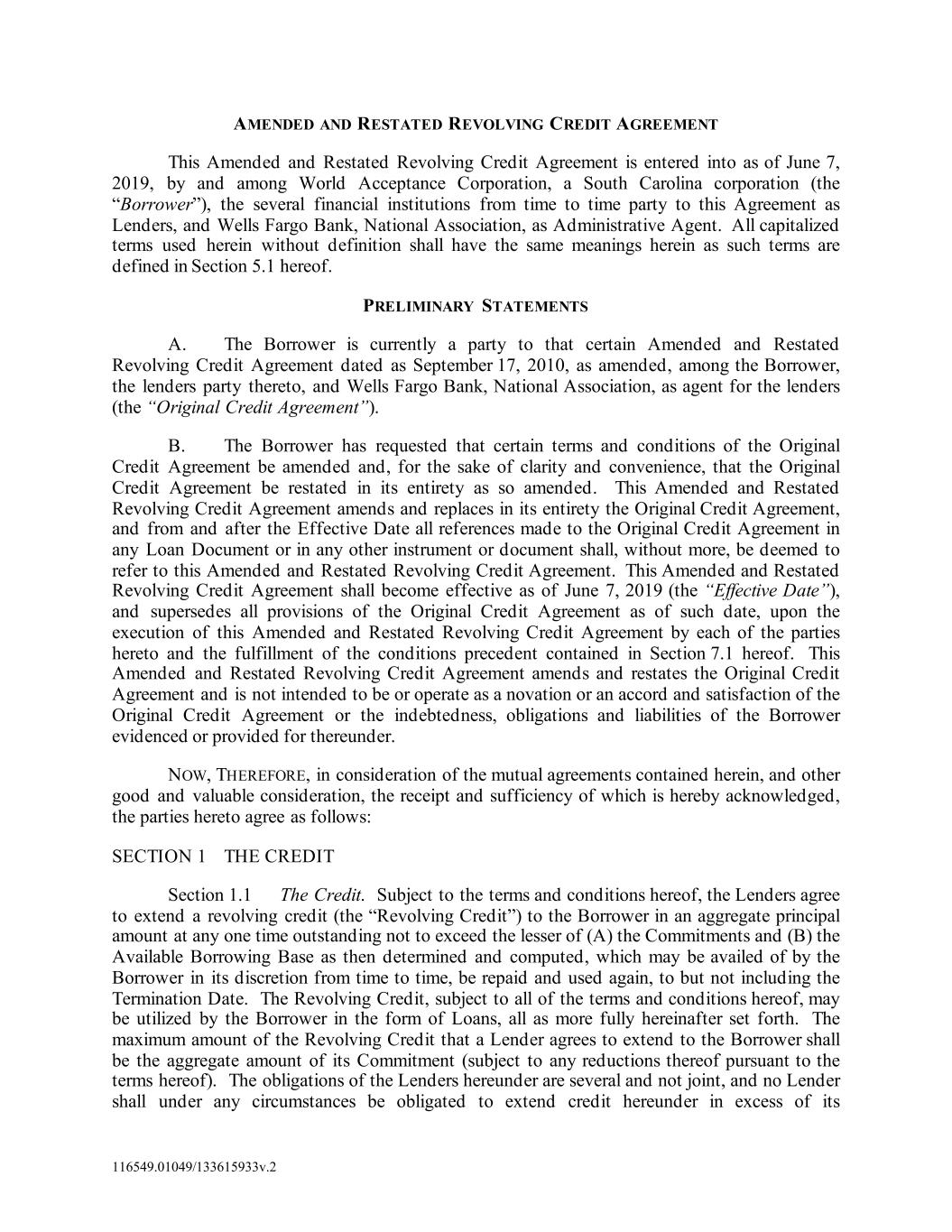 116549.01049/133615933v.2 AMENDED AND RESTATED REVOLVING CREDIT AGREEMENT This Amended and Restated Revolving Credit Agreement is entered into as of June 7, 2019, by and among World Acceptance Corporation, a South Carolina corporation (the “Borrower”), the several financial institutions from time to time party to this Agreement as Lenders, and Wells Fargo Bank, National Association, as Administrative Agent. All capitalized terms used herein without definition shall have the same meanings herein as such terms are defined in Section 5.1 hereof. PRELIMINARY STATEMENTS A. The Borrower is currently a party to that certain Amended and Restated Revolving Credit Agreement dated as September 17, 2010, as amended, among the Borrower, the lenders party thereto, and Wells Fargo Bank, National Association, as agent for the lenders (the “Original Credit Agreement”). B. The Borrower has requested that certain terms and conditions of the Original Credit Agreement be amended and, for the sake of clarity and convenience, that the Original Credit Agreement be restated in its entirety as so amended. This Amended and Restated Revolving Credit Agreement amends and replaces in its entirety the Original Credit Agreement, and from and after the Effective Date all references made to the Original Credit Agreement in any Loan Document or in any other instrument or document shall, without more, be deemed to refer to this Amended and Restated Revolving Credit Agreement. This Amended and Restated Revolving Credit Agreement shall become effective as of June 7, 2019 (the “Effective Date”), and supersedes all provisions of the Original Credit Agreement as of such date, upon the execution of this Amended and Restated Revolving Credit Agreement by each of the parties hereto and the fulfillment of the conditions precedent contained in Section 7.1 hereof. This Amended and Restated Revolving Credit Agreement amends and restates the Original Credit Agreement and is not intended to be or operate as a novation or an accord and satisfaction of the Original Credit Agreement or the indebtedness, obligations and liabilities of the Borrower evidenced or provided for thereunder. NOW, THEREFORE, in consideration of the mutual agreements contained herein, and other good and valuable consideration, the receipt and sufficiency of which is hereby acknowledged, the parties hereto agree as follows: SECTION 1 THE CREDIT Section 1.1 The Credit. Subject to the terms and conditions hereof, the Lenders agree to extend a revolving credit (the “Revolving Credit”) to the Borrower in an aggregate principal amount at any one time outstanding not to exceed the lesser of (A) the Commitments and (B) the Available Borrowing Base as then determined and computed, which may be availed of by the Borrower in its discretion from time to time, be repaid and used again, to but not including the Termination Date. The Revolving Credit, subject to all of the terms and conditions hereof, may be utilized by the Borrower in the form of Loans, all as more fully hereinafter set forth. The maximum amount of the Revolving Credit that a Lender agrees to extend to the Borrower shall be the aggregate amount of its Commitment (subject to any reductions thereof pursuant to the terms hereof). The obligations of the Lenders hereunder are several and not joint, and no Lender shall under any circumstances be obligated to extend credit hereunder in excess of its