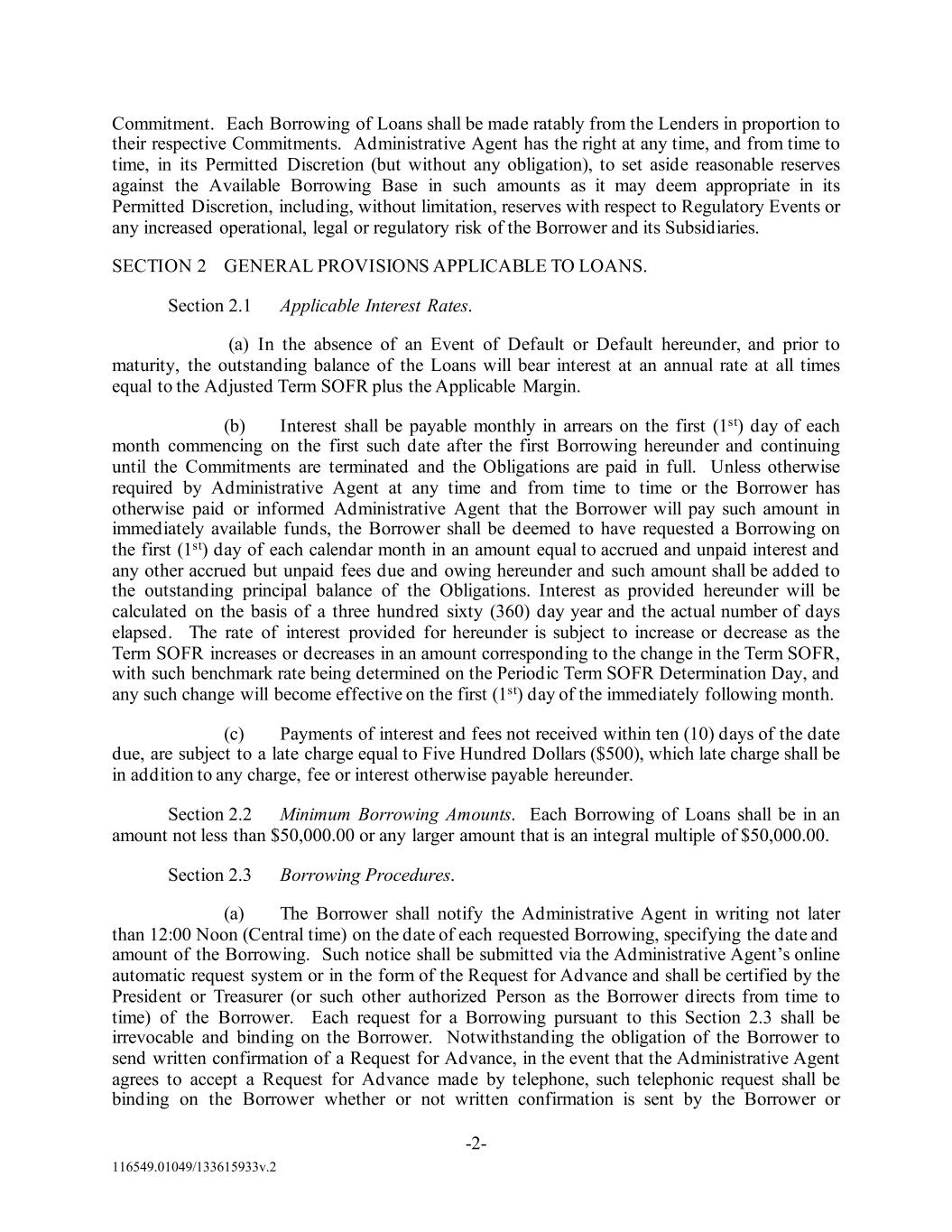 -2- 116549.01049/133615933v.2 Commitment. Each Borrowing of Loans shall be made ratably from the Lenders in proportion to their respective Commitments. Administrative Agent has the right at any time, and from time to time, in its Permitted Discretion (but without any obligation), to set aside reasonable reserves against the Available Borrowing Base in such amounts as it may deem appropriate in its Permitted Discretion, including, without limitation, reserves with respect to Regulatory Events or any increased operational, legal or regulatory risk of the Borrower and its Subsidiaries. SECTION 2 GENERAL PROVISIONS APPLICABLE TO LOANS. Section 2.1 Applicable Interest Rates. (a) In the absence of an Event of Default or Default hereunder, and prior to maturity, the outstanding balance of the Loans will bear interest at an annual rate at all times equal to the Adjusted Term SOFR plus the Applicable Margin. (b) Interest shall be payable monthly in arrears on the first (1st) day of each month commencing on the first such date after the first Borrowing hereunder and continuing until the Commitments are terminated and the Obligations are paid in full. Unless otherwise required by Administrative Agent at any time and from time to time or the Borrower has otherwise paid or informed Administrative Agent that the Borrower will pay such amount in immediately available funds, the Borrower shall be deemed to have requested a Borrowing on the first (1st) day of each calendar month in an amount equal to accrued and unpaid interest and any other accrued but unpaid fees due and owing hereunder and such amount shall be added to the outstanding principal balance of the Obligations. Interest as provided hereunder will be calculated on the basis of a three hundred sixty (360) day year and the actual number of days elapsed. The rate of interest provided for hereunder is subject to increase or decrease as the Term SOFR increases or decreases in an amount corresponding to the change in the Term SOFR, with such benchmark rate being determined on the Periodic Term SOFR Determination Day, and any such change will become effective on the first (1st) day of the immediately following month. (c) Payments of interest and fees not received within ten (10) days of the date due, are subject to a late charge equal to Five Hundred Dollars ($500), which late charge shall be in addition to any charge, fee or interest otherwise payable hereunder. Section 2.2 Minimum Borrowing Amounts. Each Borrowing of Loans shall be in an amount not less than $50,000.00 or any larger amount that is an integral multiple of $50,000.00. Section 2.3 Borrowing Procedures. (a) The Borrower shall notify the Administrative Agent in writing not later than 12:00 Noon (Central time) on the date of each requested Borrowing, specifying the date and amount of the Borrowing. Such notice shall be submitted via the Administrative Agent’s online automatic request system or in the form of the Request for Advance and shall be certified by the President or Treasurer (or such other authorized Person as the Borrower directs from time to time) of the Borrower. Each request for a Borrowing pursuant to this Section 2.3 shall be irrevocable and binding on the Borrower. Notwithstanding the obligation of the Borrower to send written confirmation of a Request for Advance, in the event that the Administrative Agent agrees to accept a Request for Advance made by telephone, such telephonic request shall be binding on the Borrower whether or not written confirmation is sent by the Borrower or