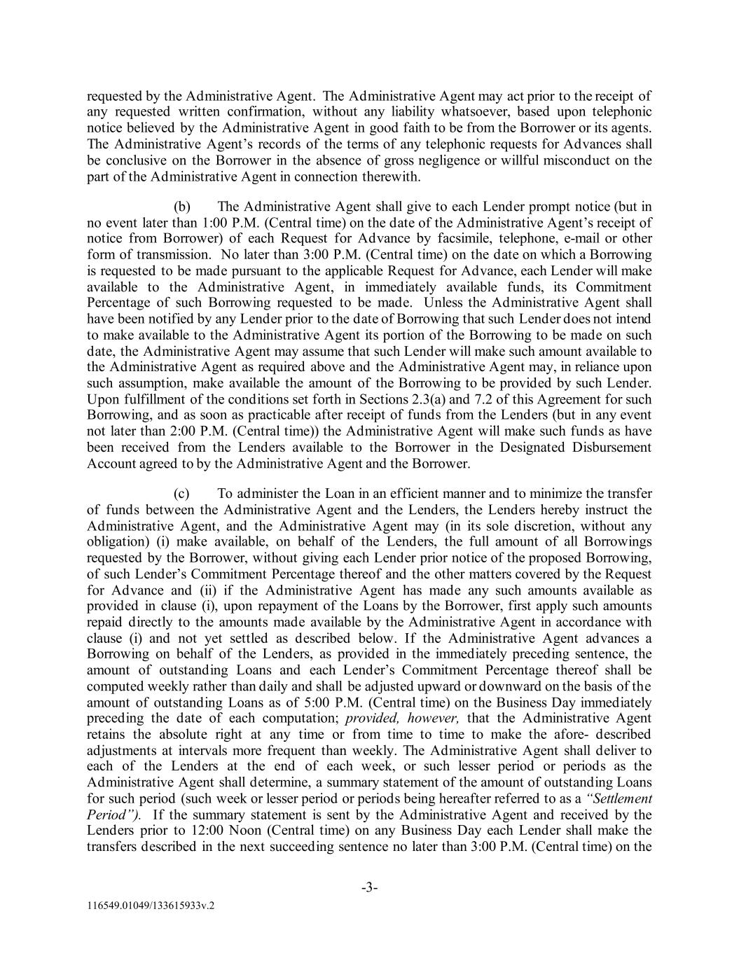-3- 116549.01049/133615933v.2 requested by the Administrative Agent. The Administrative Agent may act prior to the receipt of any requested written confirmation, without any liability whatsoever, based upon telephonic notice believed by the Administrative Agent in good faith to be from the Borrower or its agents. The Administrative Agent’s records of the terms of any telephonic requests for Advances shall be conclusive on the Borrower in the absence of gross negligence or willful misconduct on the part of the Administrative Agent in connection therewith. (b) The Administrative Agent shall give to each Lender prompt notice (but in no event later than 1:00 P.M. (Central time) on the date of the Administrative Agent’s receipt of notice from Borrower) of each Request for Advance by facsimile, telephone, e-mail or other form of transmission. No later than 3:00 P.M. (Central time) on the date on which a Borrowing is requested to be made pursuant to the applicable Request for Advance, each Lender will make available to the Administrative Agent, in immediately available funds, its Commitment Percentage of such Borrowing requested to be made. Unless the Administrative Agent shall have been notified by any Lender prior to the date of Borrowing that such Lender does not intend to make available to the Administrative Agent its portion of the Borrowing to be made on such date, the Administrative Agent may assume that such Lender will make such amount available to the Administrative Agent as required above and the Administrative Agent may, in reliance upon such assumption, make available the amount of the Borrowing to be provided by such Lender. Upon fulfillment of the conditions set forth in Sections 2.3(a) and 7.2 of this Agreement for such Borrowing, and as soon as practicable after receipt of funds from the Lenders (but in any event not later than 2:00 P.M. (Central time)) the Administrative Agent will make such funds as have been received from the Lenders available to the Borrower in the Designated Disbursement Account agreed to by the Administrative Agent and the Borrower. (c) To administer the Loan in an efficient manner and to minimize the transfer of funds between the Administrative Agent and the Lenders, the Lenders hereby instruct the Administrative Agent, and the Administrative Agent may (in its sole discretion, without any obligation) (i) make available, on behalf of the Lenders, the full amount of all Borrowings requested by the Borrower, without giving each Lender prior notice of the proposed Borrowing, of such Lender’s Commitment Percentage thereof and the other matters covered by the Request for Advance and (ii) if the Administrative Agent has made any such amounts available as provided in clause (i), upon repayment of the Loans by the Borrower, first apply such amounts repaid directly to the amounts made available by the Administrative Agent in accordance with clause (i) and not yet settled as described below. If the Administrative Agent advances a Borrowing on behalf of the Lenders, as provided in the immediately preceding sentence, the amount of outstanding Loans and each Lender’s Commitment Percentage thereof shall be computed weekly rather than daily and shall be adjusted upward or downward on the basis of the amount of outstanding Loans as of 5:00 P.M. (Central time) on the Business Day immediately preceding the date of each computation; provided, however, that the Administrative Agent retains the absolute right at any time or from time to time to make the afore- described adjustments at intervals more frequent than weekly. The Administrative Agent shall deliver to each of the Lenders at the end of each week, or such lesser period or periods as the Administrative Agent shall determine, a summary statement of the amount of outstanding Loans for such period (such week or lesser period or periods being hereafter referred to as a “Settlement Period”). If the summary statement is sent by the Administrative Agent and received by the Lenders prior to 12:00 Noon (Central time) on any Business Day each Lender shall make the transfers described in the next succeeding sentence no later than 3:00 P.M. (Central time) on the