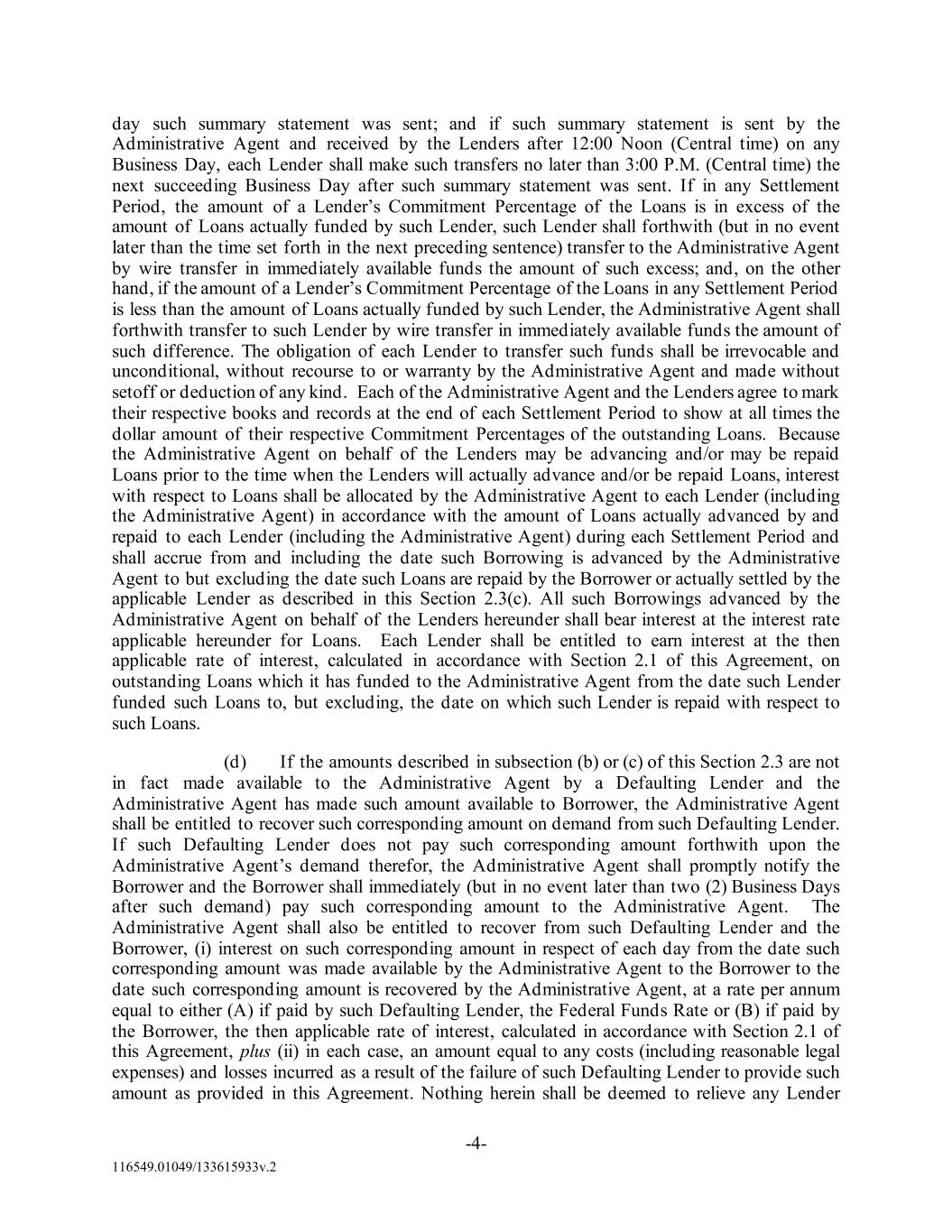 -4- 116549.01049/133615933v.2 day such summary statement was sent; and if such summary statement is sent by the Administrative Agent and received by the Lenders after 12:00 Noon (Central time) on any Business Day, each Lender shall make such transfers no later than 3:00 P.M. (Central time) the next succeeding Business Day after such summary statement was sent. If in any Settlement Period, the amount of a Lender’s Commitment Percentage of the Loans is in excess of the amount of Loans actually funded by such Lender, such Lender shall forthwith (but in no event later than the time set forth in the next preceding sentence) transfer to the Administrative Agent by wire transfer in immediately available funds the amount of such excess; and, on the other hand, if the amount of a Lender’s Commitment Percentage of the Loans in any Settlement Period is less than the amount of Loans actually funded by such Lender, the Administrative Agent shall forthwith transfer to such Lender by wire transfer in immediately available funds the amount of such difference. The obligation of each Lender to transfer such funds shall be irrevocable and unconditional, without recourse to or warranty by the Administrative Agent and made without setoff or deduction of any kind. Each of the Administrative Agent and the Lenders agree to mark their respective books and records at the end of each Settlement Period to show at all times the dollar amount of their respective Commitment Percentages of the outstanding Loans. Because the Administrative Agent on behalf of the Lenders may be advancing and/or may be repaid Loans prior to the time when the Lenders will actually advance and/or be repaid Loans, interest with respect to Loans shall be allocated by the Administrative Agent to each Lender (including the Administrative Agent) in accordance with the amount of Loans actually advanced by and repaid to each Lender (including the Administrative Agent) during each Settlement Period and shall accrue from and including the date such Borrowing is advanced by the Administrative Agent to but excluding the date such Loans are repaid by the Borrower or actually settled by the applicable Lender as described in this Section 2.3(c). All such Borrowings advanced by the Administrative Agent on behalf of the Lenders hereunder shall bear interest at the interest rate applicable hereunder for Loans. Each Lender shall be entitled to earn interest at the then applicable rate of interest, calculated in accordance with Section 2.1 of this Agreement, on outstanding Loans which it has funded to the Administrative Agent from the date such Lender funded such Loans to, but excluding, the date on which such Lender is repaid with respect to such Loans. (d) If the amounts described in subsection (b) or (c) of this Section 2.3 are not in fact made available to the Administrative Agent by a Defaulting Lender and the Administrative Agent has made such amount available to Borrower, the Administrative Agent shall be entitled to recover such corresponding amount on demand from such Defaulting Lender. If such Defaulting Lender does not pay such corresponding amount forthwith upon the Administrative Agent’s demand therefor, the Administrative Agent shall promptly notify the Borrower and the Borrower shall immediately (but in no event later than two (2) Business Days after such demand) pay such corresponding amount to the Administrative Agent. The Administrative Agent shall also be entitled to recover from such Defaulting Lender and the Borrower, (i) interest on such corresponding amount in respect of each day from the date such corresponding amount was made available by the Administrative Agent to the Borrower to the date such corresponding amount is recovered by the Administrative Agent, at a rate per annum equal to either (A) if paid by such Defaulting Lender, the Federal Funds Rate or (B) if paid by the Borrower, the then applicable rate of interest, calculated in accordance with Section 2.1 of this Agreement, plus (ii) in each case, an amount equal to any costs (including reasonable legal expenses) and losses incurred as a result of the failure of such Defaulting Lender to provide such amount as provided in this Agreement. Nothing herein shall be deemed to relieve any Lender