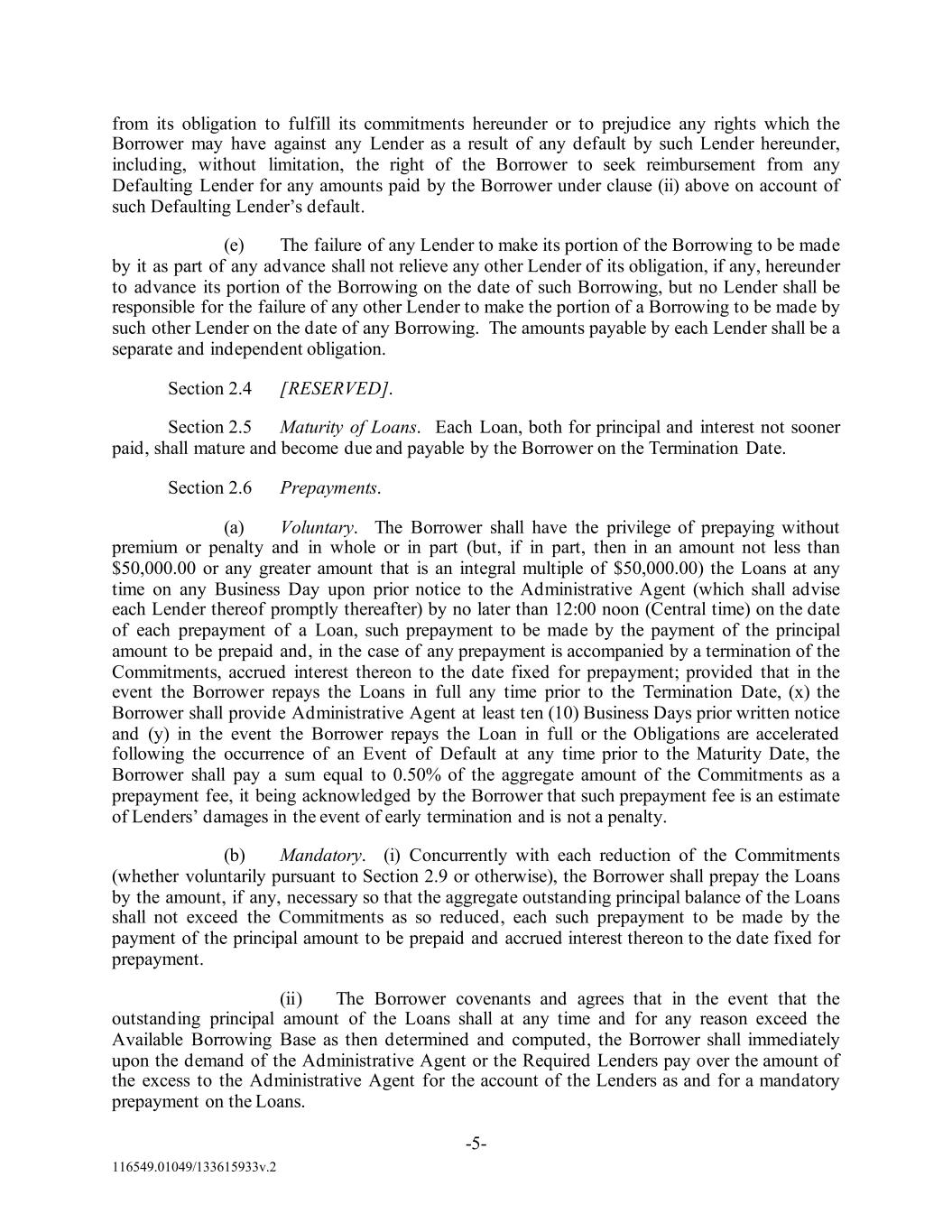 -5- 116549.01049/133615933v.2 from its obligation to fulfill its commitments hereunder or to prejudice any rights which the Borrower may have against any Lender as a result of any default by such Lender hereunder, including, without limitation, the right of the Borrower to seek reimbursement from any Defaulting Lender for any amounts paid by the Borrower under clause (ii) above on account of such Defaulting Lender’s default. (e) The failure of any Lender to make its portion of the Borrowing to be made by it as part of any advance shall not relieve any other Lender of its obligation, if any, hereunder to advance its portion of the Borrowing on the date of such Borrowing, but no Lender shall be responsible for the failure of any other Lender to make the portion of a Borrowing to be made by such other Lender on the date of any Borrowing. The amounts payable by each Lender shall be a separate and independent obligation. Section 2.4 [RESERVED]. Section 2.5 Maturity of Loans. Each Loan, both for principal and interest not sooner paid, shall mature and become due and payable by the Borrower on the Termination Date. Section 2.6 Prepayments. (a) Voluntary. The Borrower shall have the privilege of prepaying without premium or penalty and in whole or in part (but, if in part, then in an amount not less than $50,000.00 or any greater amount that is an integral multiple of $50,000.00) the Loans at any time on any Business Day upon prior notice to the Administrative Agent (which shall advise each Lender thereof promptly thereafter) by no later than 12:00 noon (Central time) on the date of each prepayment of a Loan, such prepayment to be made by the payment of the principal amount to be prepaid and, in the case of any prepayment is accompanied by a termination of the Commitments, accrued interest thereon to the date fixed for prepayment; provided that in the event the Borrower repays the Loans in full any time prior to the Termination Date, (x) the Borrower shall provide Administrative Agent at least ten (10) Business Days prior written notice and (y) in the event the Borrower repays the Loan in full or the Obligations are accelerated following the occurrence of an Event of Default at any time prior to the Maturity Date, the Borrower shall pay a sum equal to 0.50% of the aggregate amount of the Commitments as a prepayment fee, it being acknowledged by the Borrower that such prepayment fee is an estimate of Lenders’ damages in the event of early termination and is not a penalty. (b) Mandatory. (i) Concurrently with each reduction of the Commitments (whether voluntarily pursuant to Section 2.9 or otherwise), the Borrower shall prepay the Loans by the amount, if any, necessary so that the aggregate outstanding principal balance of the Loans shall not exceed the Commitments as so reduced, each such prepayment to be made by the payment of the principal amount to be prepaid and accrued interest thereon to the date fixed for prepayment. (ii) The Borrower covenants and agrees that in the event that the outstanding principal amount of the Loans shall at any time and for any reason exceed the Available Borrowing Base as then determined and computed, the Borrower shall immediately upon the demand of the Administrative Agent or the Required Lenders pay over the amount of the excess to the Administrative Agent for the account of the Lenders as and for a mandatory prepayment on the Loans.