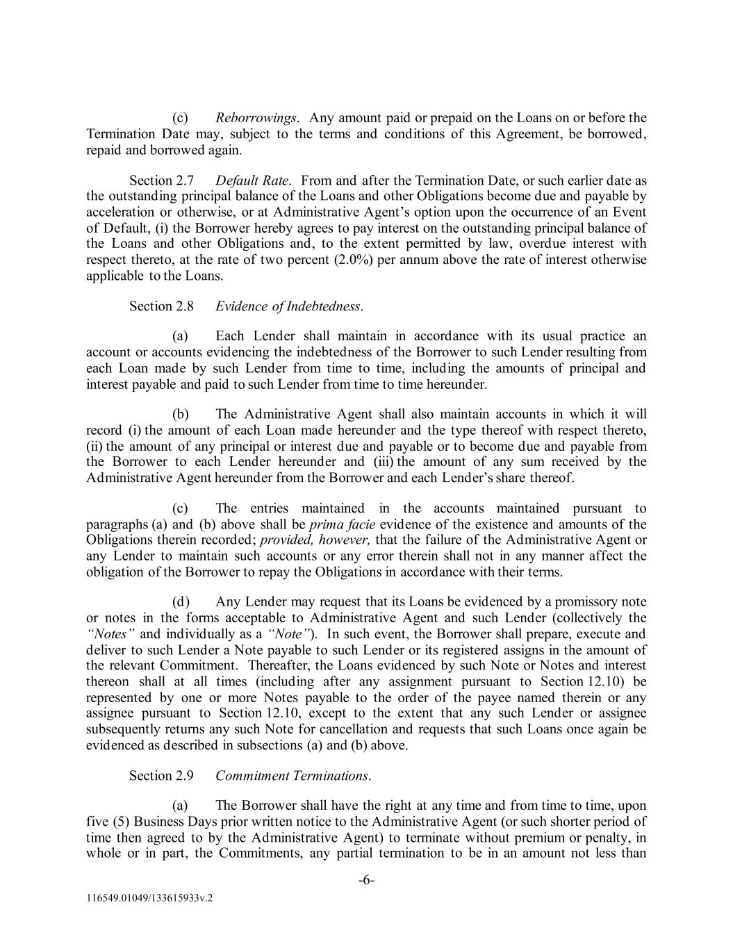 -6- 116549.01049/133615933v.2 (c) Reborrowings. Any amount paid or prepaid on the Loans on or before the Termination Date may, subject to the terms and conditions of this Agreement, be borrowed, repaid and borrowed again. Section 2.7 Default Rate. From and after the Termination Date, or such earlier date as the outstanding principal balance of the Loans and other Obligations become due and payable by acceleration or otherwise, or at Administrative Agent’s option upon the occurrence of an Event of Default, (i) the Borrower hereby agrees to pay interest on the outstanding principal balance of the Loans and other Obligations and, to the extent permitted by law, overdue interest with respect thereto, at the rate of two percent (2.0%) per annum above the rate of interest otherwise applicable to the Loans. Section 2.8 Evidence of Indebtedness. (a) Each Lender shall maintain in accordance with its usual practice an account or accounts evidencing the indebtedness of the Borrower to such Lender resulting from each Loan made by such Lender from time to time, including the amounts of principal and interest payable and paid to such Lender from time to time hereunder. (b) The Administrative Agent shall also maintain accounts in which it will record (i) the amount of each Loan made hereunder and the type thereof with respect thereto, (ii) the amount of any principal or interest due and payable or to become due and payable from the Borrower to each Lender hereunder and (iii) the amount of any sum received by the Administrative Agent hereunder from the Borrower and each Lender’s share thereof. (c) The entries maintained in the accounts maintained pursuant to paragraphs (a) and (b) above shall be prima facie evidence of the existence and amounts of the Obligations therein recorded; provided, however, that the failure of the Administrative Agent or any Lender to maintain such accounts or any error therein shall not in any manner affect the obligation of the Borrower to repay the Obligations in accordance with their terms. (d) Any Lender may request that its Loans be evidenced by a promissory note or notes in the forms acceptable to Administrative Agent and such Lender (collectively the “Notes” and individually as a “Note”). In such event, the Borrower shall prepare, execute and deliver to such Lender a Note payable to such Lender or its registered assigns in the amount of the relevant Commitment. Thereafter, the Loans evidenced by such Note or Notes and interest thereon shall at all times (including after any assignment pursuant to Section 12.10) be represented by one or more Notes payable to the order of the payee named therein or any assignee pursuant to Section 12.10, except to the extent that any such Lender or assignee subsequently returns any such Note for cancellation and requests that such Loans once again be evidenced as described in subsections (a) and (b) above. Section 2.9 Commitment Terminations. (a) The Borrower shall have the right at any time and from time to time, upon five (5) Business Days prior written notice to the Administrative Agent (or such shorter period of time then agreed to by the Administrative Agent) to terminate without premium or penalty, in whole or in part, the Commitments, any partial termination to be in an amount not less than
