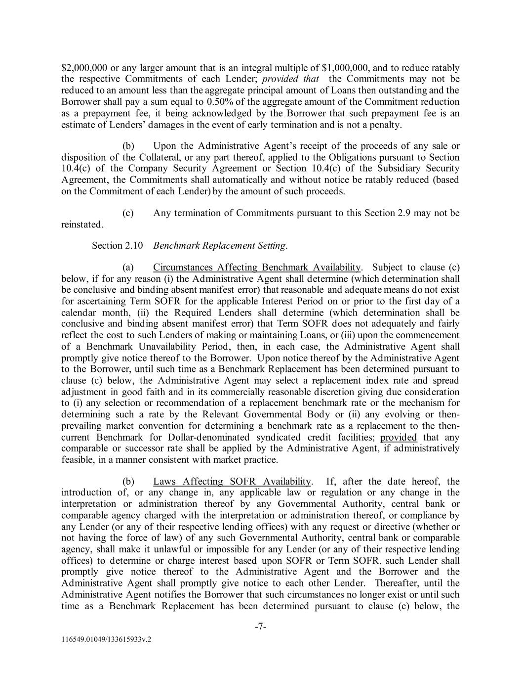 -7- 116549.01049/133615933v.2 $2,000,000 or any larger amount that is an integral multiple of $1,000,000, and to reduce ratably the respective Commitments of each Lender; provided that the Commitments may not be reduced to an amount less than the aggregate principal amount of Loans then outstanding and the Borrower shall pay a sum equal to 0.50% of the aggregate amount of the Commitment reduction as a prepayment fee, it being acknowledged by the Borrower that such prepayment fee is an estimate of Lenders’ damages in the event of early termination and is not a penalty. (b) Upon the Administrative Agent’s receipt of the proceeds of any sale or disposition of the Collateral, or any part thereof, applied to the Obligations pursuant to Section 10.4(c) of the Company Security Agreement or Section 10.4(c) of the Subsidiary Security Agreement, the Commitments shall automatically and without notice be ratably reduced (based on the Commitment of each Lender) by the amount of such proceeds. (c) Any termination of Commitments pursuant to this Section 2.9 may not be reinstated. Section 2.10 Benchmark Replacement Setting. (a) Circumstances Affecting Benchmark Availability. Subject to clause (c) below, if for any reason (i) the Administrative Agent shall determine (which determination shall be conclusive and binding absent manifest error) that reasonable and adequate means do not exist for ascertaining Term SOFR for the applicable Interest Period on or prior to the first day of a calendar month, (ii) the Required Lenders shall determine (which determination shall be conclusive and binding absent manifest error) that Term SOFR does not adequately and fairly reflect the cost to such Lenders of making or maintaining Loans, or (iii) upon the commencement of a Benchmark Unavailability Period, then, in each case, the Administrative Agent shall promptly give notice thereof to the Borrower. Upon notice thereof by the Administrative Agent to the Borrower, until such time as a Benchmark Replacement has been determined pursuant to clause (c) below, the Administrative Agent may select a replacement index rate and spread adjustment in good faith and in its commercially reasonable discretion giving due consideration to (i) any selection or recommendation of a replacement benchmark rate or the mechanism for determining such a rate by the Relevant Governmental Body or (ii) any evolving or then- prevailing market convention for determining a benchmark rate as a replacement to the then- current Benchmark for Dollar-denominated syndicated credit facilities; provided that any comparable or successor rate shall be applied by the Administrative Agent, if administratively feasible, in a manner consistent with market practice. (b) Laws Affecting SOFR Availability. If, after the date hereof, the introduction of, or any change in, any applicable law or regulation or any change in the interpretation or administration thereof by any Governmental Authority, central bank or comparable agency charged with the interpretation or administration thereof, or compliance by any Lender (or any of their respective lending offices) with any request or directive (whether or not having the force of law) of any such Governmental Authority, central bank or comparable agency, shall make it unlawful or impossible for any Lender (or any of their respective lending offices) to determine or charge interest based upon SOFR or Term SOFR, such Lender shall promptly give notice thereof to the Administrative Agent and the Borrower and the Administrative Agent shall promptly give notice to each other Lender. Thereafter, until the Administrative Agent notifies the Borrower that such circumstances no longer exist or until such time as a Benchmark Replacement has been determined pursuant to clause (c) below, the