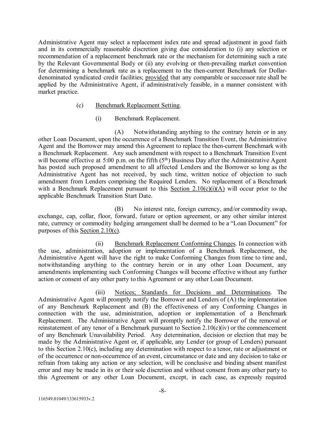 -8- 116549.01049/133615933v.2 Administrative Agent may select a replacement index rate and spread adjustment in good faith and in its commercially reasonable discretion giving due consideration to (i) any selection or recommendation of a replacement benchmark rate or the mechanism for determining such a rate by the Relevant Governmental Body or (ii) any evolving or then-prevailing market convention for determining a benchmark rate as a replacement to the then-current Benchmark for Dollar- denominated syndicated credit facilities; provided that any comparable or successor rate shall be applied by the Administrative Agent, if administratively feasible, in a manner consistent with market practice. (c) Benchmark Replacement Setting. (i) Benchmark Replacement. (A) Notwithstanding anything to the contrary herein or in any other Loan Document, upon the occurrence of a Benchmark Transition Event, the Administrative Agent and the Borrower may amend this Agreement to replace the then-current Benchmark with a Benchmark Replacement. Any such amendment with respect to a Benchmark Transition Event will become effective at 5:00 p.m. on the fifth (5th) Business Day after the Administrative Agent has posted such proposed amendment to all affected Lenders and the Borrower so long as the Administrative Agent has not received, by such time, written notice of objection to such amendment from Lenders comprising the Required Lenders. No replacement of a Benchmark with a Benchmark Replacement pursuant to this Section 2.10(c)(i)(A) will occur prior to the applicable Benchmark Transition Start Date. (B) No interest rate, foreign currency, and/or commodity swap, exchange, cap, collar, floor, forward, future or option agreement, or any other similar interest rate, currency or commodity hedging arrangement shall be deemed to be a “Loan Document” for purposes of this Section 2.10(c). (ii) Benchmark Replacement Conforming Changes. In connection with the use, administration, adoption or implementation of a Benchmark Replacement, the Administrative Agent will have the right to make Conforming Changes from time to time and, notwithstanding anything to the contrary herein or in any other Loan Document, any amendments implementing such Conforming Changes will become effective without any further action or consent of any other party to this Agreement or any other Loan Document. (iii) Notices; Standards for Decisions and Determinations. The Administrative Agent will promptly notify the Borrower and Lenders of (A) the implementation of any Benchmark Replacement and (B) the effectiveness of any Conforming Changes in connection with the use, administration, adoption or implementation of a Benchmark Replacement. The Administrative Agent will promptly notify the Borrower of the removal or reinstatement of any tenor of a Benchmark pursuant to Section 2.10(c)(iv) or the commencement of any Benchmark Unavailability Period. Any determination, decision or election that may be made by the Administrative Agent or, if applicable, any Lender (or group of Lenders) pursuant to this Section 2.10(c), including any determination with respect to a tenor, rate or adjustment or of the occurrence or non-occurrence of an event, circumstance or date and any decision to take or refrain from taking any action or any selection, will be conclusive and binding absent manifest error and may be made in its or their sole discretion and without consent from any other party to this Agreement or any other Loan Document, except, in each case, as expressly required