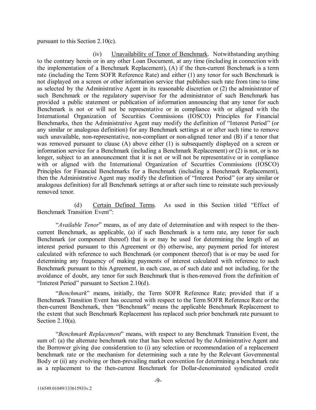 -9- 116549.01049/133615933v.2 pursuant to this Section 2.10(c). (iv) Unavailability of Tenor of Benchmark. Notwithstanding anything to the contrary herein or in any other Loan Document, at any time (including in connection with the implementation of a Benchmark Replacement), (A) if the then-current Benchmark is a term rate (including the Term SOFR Reference Rate) and either (1) any tenor for such Benchmark is not displayed on a screen or other information service that publishes such rate from time to time as selected by the Administrative Agent in its reasonable discretion or (2) the administrator of such Benchmark or the regulatory supervisor for the administrator of such Benchmark has provided a public statement or publication of information announcing that any tenor for such Benchmark is not or will not be representative or in compliance with or aligned with the International Organization of Securities Commissions (IOSCO) Principles for Financial Benchmarks, then the Administrative Agent may modify the definition of “Interest Period” (or any similar or analogous definition) for any Benchmark settings at or after such time to remove such unavailable, non-representative, non-compliant or non-aligned tenor and (B) if a tenor that was removed pursuant to clause (A) above either (1) is subsequently displayed on a screen or information service for a Benchmark (including a Benchmark Replacement) or (2) is not, or is no longer, subject to an announcement that it is not or will not be representative or in compliance with or aligned with the International Organization of Securities Commissions (IOSCO) Principles for Financial Benchmarks for a Benchmark (including a Benchmark Replacement), then the Administrative Agent may modify the definition of “Interest Period” (or any similar or analogous definition) for all Benchmark settings at or after such time to reinstate such previously removed tenor. (d) Certain Defined Terms. As used in this Section titled “Effect of Benchmark Transition Event”: “Available Tenor” means, as of any date of determination and with respect to the then- current Benchmark, as applicable, (a) if such Benchmark is a term rate, any tenor for such Benchmark (or component thereof) that is or may be used for determining the length of an interest period pursuant to this Agreement or (b) otherwise, any payment period for interest calculated with reference to such Benchmark (or component thereof) that is or may be used for determining any frequency of making payments of interest calculated with reference to such Benchmark pursuant to this Agreement, in each case, as of such date and not including, for the avoidance of doubt, any tenor for such Benchmark that is then-removed from the definition of “Interest Period” pursuant to Section 2.10(d). “Benchmark” means, initially, the Term SOFR Reference Rate; provided that if a Benchmark Transition Event has occurred with respect to the Term SOFR Reference Rate or the then-current Benchmark, then “Benchmark” means the applicable Benchmark Replacement to the extent that such Benchmark Replacement has replaced such prior benchmark rate pursuant to Section 2.10(a). “Benchmark Replacement” means, with respect to any Benchmark Transition Event, the sum of: (a) the alternate benchmark rate that has been selected by the Administrative Agent and the Borrower giving due consideration to (i) any selection or recommendation of a replacement benchmark rate or the mechanism for determining such a rate by the Relevant Governmental Body or (ii) any evolving or then-prevailing market convention for determining a benchmark rate as a replacement to the then-current Benchmark for Dollar-denominated syndicated credit