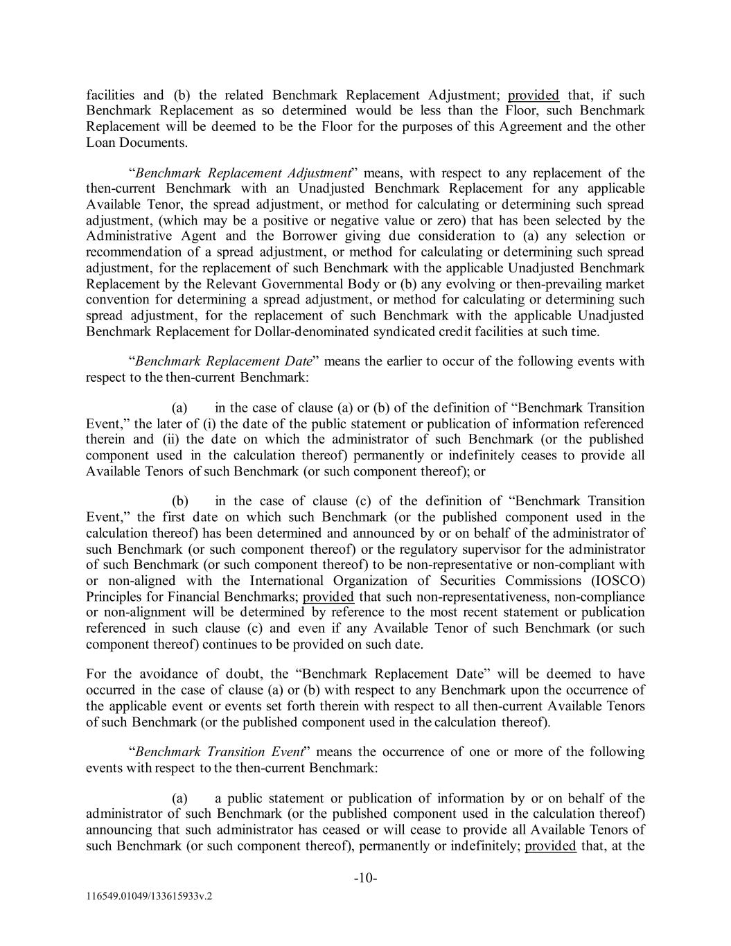 -10- 116549.01049/133615933v.2 facilities and (b) the related Benchmark Replacement Adjustment; provided that, if such Benchmark Replacement as so determined would be less than the Floor, such Benchmark Replacement will be deemed to be the Floor for the purposes of this Agreement and the other Loan Documents. “Benchmark Replacement Adjustment” means, with respect to any replacement of the then-current Benchmark with an Unadjusted Benchmark Replacement for any applicable Available Tenor, the spread adjustment, or method for calculating or determining such spread adjustment, (which may be a positive or negative value or zero) that has been selected by the Administrative Agent and the Borrower giving due consideration to (a) any selection or recommendation of a spread adjustment, or method for calculating or determining such spread adjustment, for the replacement of such Benchmark with the applicable Unadjusted Benchmark Replacement by the Relevant Governmental Body or (b) any evolving or then-prevailing market convention for determining a spread adjustment, or method for calculating or determining such spread adjustment, for the replacement of such Benchmark with the applicable Unadjusted Benchmark Replacement for Dollar-denominated syndicated credit facilities at such time. “Benchmark Replacement Date” means the earlier to occur of the following events with respect to the then-current Benchmark: (a) in the case of clause (a) or (b) of the definition of “Benchmark Transition Event,” the later of (i) the date of the public statement or publication of information referenced therein and (ii) the date on which the administrator of such Benchmark (or the published component used in the calculation thereof) permanently or indefinitely ceases to provide all Available Tenors of such Benchmark (or such component thereof); or (b) in the case of clause (c) of the definition of “Benchmark Transition Event,” the first date on which such Benchmark (or the published component used in the calculation thereof) has been determined and announced by or on behalf of the administrator of such Benchmark (or such component thereof) or the regulatory supervisor for the administrator of such Benchmark (or such component thereof) to be non-representative or non-compliant with or non-aligned with the International Organization of Securities Commissions (IOSCO) Principles for Financial Benchmarks; provided that such non-representativeness, non-compliance or non-alignment will be determined by reference to the most recent statement or publication referenced in such clause (c) and even if any Available Tenor of such Benchmark (or such component thereof) continues to be provided on such date. For the avoidance of doubt, the “Benchmark Replacement Date” will be deemed to have occurred in the case of clause (a) or (b) with respect to any Benchmark upon the occurrence of the applicable event or events set forth therein with respect to all then-current Available Tenors of such Benchmark (or the published component used in the calculation thereof). “Benchmark Transition Event” means the occurrence of one or more of the following events with respect to the then-current Benchmark: (a) a public statement or publication of information by or on behalf of the administrator of such Benchmark (or the published component used in the calculation thereof) announcing that such administrator has ceased or will cease to provide all Available Tenors of such Benchmark (or such component thereof), permanently or indefinitely; provided that, at the