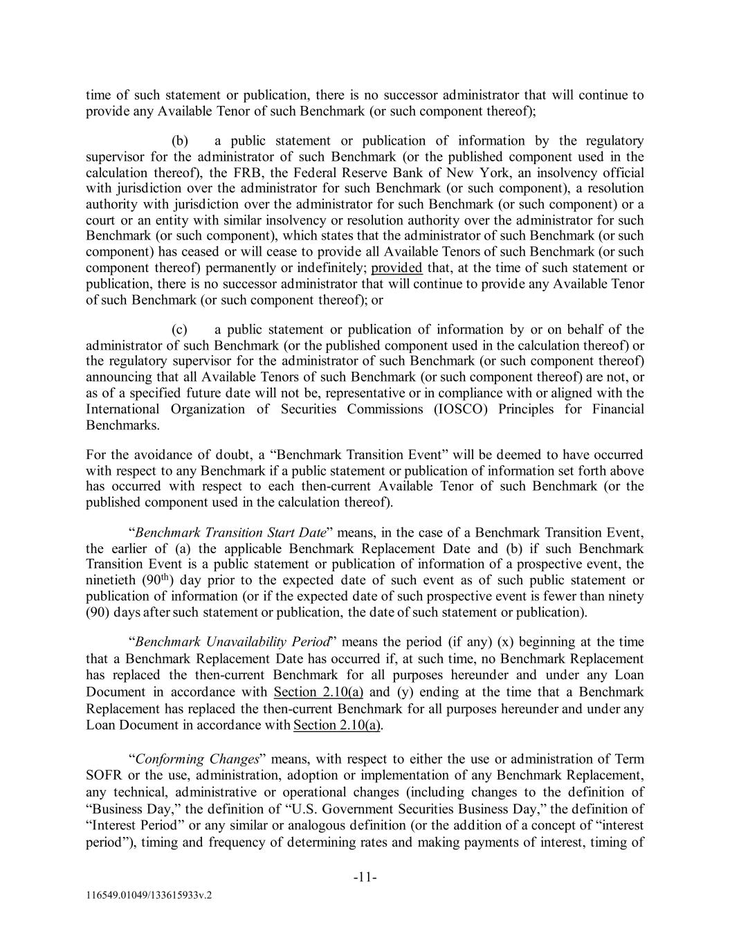-11- 116549.01049/133615933v.2 time of such statement or publication, there is no successor administrator that will continue to provide any Available Tenor of such Benchmark (or such component thereof); (b) a public statement or publication of information by the regulatory supervisor for the administrator of such Benchmark (or the published component used in the calculation thereof), the FRB, the Federal Reserve Bank of New York, an insolvency official with jurisdiction over the administrator for such Benchmark (or such component), a resolution authority with jurisdiction over the administrator for such Benchmark (or such component) or a court or an entity with similar insolvency or resolution authority over the administrator for such Benchmark (or such component), which states that the administrator of such Benchmark (or such component) has ceased or will cease to provide all Available Tenors of such Benchmark (or such component thereof) permanently or indefinitely; provided that, at the time of such statement or publication, there is no successor administrator that will continue to provide any Available Tenor of such Benchmark (or such component thereof); or (c) a public statement or publication of information by or on behalf of the administrator of such Benchmark (or the published component used in the calculation thereof) or the regulatory supervisor for the administrator of such Benchmark (or such component thereof) announcing that all Available Tenors of such Benchmark (or such component thereof) are not, or as of a specified future date will not be, representative or in compliance with or aligned with the International Organization of Securities Commissions (IOSCO) Principles for Financial Benchmarks. For the avoidance of doubt, a “Benchmark Transition Event” will be deemed to have occurred with respect to any Benchmark if a public statement or publication of information set forth above has occurred with respect to each then-current Available Tenor of such Benchmark (or the published component used in the calculation thereof). “Benchmark Transition Start Date” means, in the case of a Benchmark Transition Event, the earlier of (a) the applicable Benchmark Replacement Date and (b) if such Benchmark Transition Event is a public statement or publication of information of a prospective event, the ninetieth (90th) day prior to the expected date of such event as of such public statement or publication of information (or if the expected date of such prospective event is fewer than ninety (90) days after such statement or publication, the date of such statement or publication). “Benchmark Unavailability Period” means the period (if any) (x) beginning at the time that a Benchmark Replacement Date has occurred if, at such time, no Benchmark Replacement has replaced the then-current Benchmark for all purposes hereunder and under any Loan Document in accordance with Section 2.10(a) and (y) ending at the time that a Benchmark Replacement has replaced the then-current Benchmark for all purposes hereunder and under any Loan Document in accordance with Section 2.10(a). “Conforming Changes” means, with respect to either the use or administration of Term SOFR or the use, administration, adoption or implementation of any Benchmark Replacement, any technical, administrative or operational changes (including changes to the definition of “Business Day,” the definition of “U.S. Government Securities Business Day,” the definition of “Interest Period” or any similar or analogous definition (or the addition of a concept of “interest period”), timing and frequency of determining rates and making payments of interest, timing of