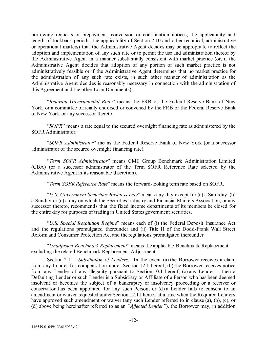 -12- 116549.01049/133615933v.2 borrowing requests or prepayment, conversion or continuation notices, the applicability and length of lookback periods, the applicability of Section 2.10 and other technical, administrative or operational matters) that the Administrative Agent decides may be appropriate to reflect the adoption and implementation of any such rate or to permit the use and administration thereof by the Administrative Agent in a manner substantially consistent with market practice (or, if the Administrative Agent decides that adoption of any portion of such market practice is not administratively feasible or if the Administrative Agent determines that no market practice for the administration of any such rate exists, in such other manner of administration as the Administrative Agent decides is reasonably necessary in connection with the administration of this Agreement and the other Loan Documents). “Relevant Governmental Body” means the FRB or the Federal Reserve Bank of New York, or a committee officially endorsed or convened by the FRB or the Federal Reserve Bank of New York, or any successor thereto. “SOFR” means a rate equal to the secured overnight financing rate as administered by the SOFR Administrator. “SOFR Administrator” means the Federal Reserve Bank of New York (or a successor administrator of the secured overnight financing rate). “Term SOFR Administrator” means CME Group Benchmark Administration Limited (CBA) (or a successor administrator of the Term SOFR Reference Rate selected by the Administrative Agent in its reasonable discretion). “Term SOFR Reference Rate” means the forward-looking term rate based on SOFR. “U.S. Government Securities Business Day” means any day except for (a) a Saturday, (b) a Sunday or (c) a day on which the Securities Industry and Financial Markets Association, or any successor thereto, recommends that the fixed income departments of its members be closed for the entire day for purposes of trading in United States government securities. “U.S. Special Resolution Regime” means each of (i) the Federal Deposit Insurance Act and the regulations promulgated thereunder and (ii) Title II of the Dodd-Frank Wall Street Reform and Consumer Protection Act and the regulations promulgated thereunder. “Unadjusted Benchmark Replacement” means the applicable Benchmark Replacement excluding the related Benchmark Replacement Adjustment. Section 2.11 Substitution of Lenders. In the event (a) the Borrower receives a claim from any Lender for compensation under Section 12.1 hereof, (b) the Borrower receives notice from any Lender of any illegality pursuant to Section 10.1 hereof, (c) any Lender is then a Defaulting Lender or such Lender is a Subsidiary or Affiliate of a Person who has been deemed insolvent or becomes the subject of a bankruptcy or insolvency proceeding or a receiver or conservator has been appointed for any such Person, or (d) a Lender fails to consent to an amendment or waiver requested under Section 12.11 hereof at a time when the Required Lenders have approved such amendment or waiver (any such Lender referred to in clause (a), (b), (c), or (d) above being hereinafter referred to as an “Affected Lender”), the Borrower may, in addition