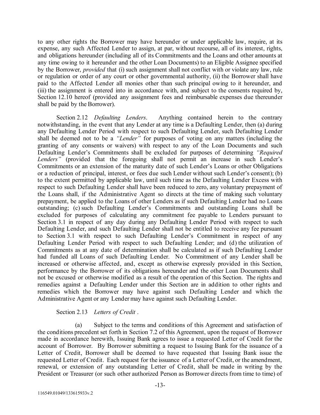 -13- 116549.01049/133615933v.2 to any other rights the Borrower may have hereunder or under applicable law, require, at its expense, any such Affected Lender to assign, at par, without recourse, all of its interest, rights, and obligations hereunder (including all of its Commitments and the Loans and other amounts at any time owing to it hereunder and the other Loan Documents) to an Eligible Assignee specified by the Borrower, provided that (i) such assignment shall not conflict with or violate any law, rule or regulation or order of any court or other governmental authority, (ii) the Borrower shall have paid to the Affected Lender all monies other than such principal owing to it hereunder, and (iii) the assignment is entered into in accordance with, and subject to the consents required by, Section 12.10 hereof (provided any assignment fees and reimbursable expenses due thereunder shall be paid by the Borrower). Section 2.12 Defaulting Lenders. Anything contained herein to the contrary notwithstanding, in the event that any Lender at any time is a Defaulting Lender, then (a) during any Defaulting Lender Period with respect to such Defaulting Lender, such Defaulting Lender shall be deemed not to be a “Lender” for purposes of voting on any matters (including the granting of any consents or waivers) with respect to any of the Loan Documents and such Defaulting Lender’s Commitments shall be excluded for purposes of determining “Required Lenders” (provided that the foregoing shall not permit an increase in such Lender’s Commitments or an extension of the maturity date of such Lender’s Loans or other Obligations or a reduction of principal, interest, or fees due such Lender without such Lender’s consent); (b) to the extent permitted by applicable law, until such time as the Defaulting Lender Excess with respect to such Defaulting Lender shall have been reduced to zero, any voluntary prepayment of the Loans shall, if the Administrative Agent so directs at the time of making such voluntary prepayment, be applied to the Loans of other Lenders as if such Defaulting Lender had no Loans outstanding; (c) such Defaulting Lender’s Commitments and outstanding Loans shall be excluded for purposes of calculating any commitment fee payable to Lenders pursuant to Section 3.1 in respect of any day during any Defaulting Lender Period with respect to such Defaulting Lender, and such Defaulting Lender shall not be entitled to receive any fee pursuant to Section 3.1 with respect to such Defaulting Lender’s Commitment in respect of any Defaulting Lender Period with respect to such Defaulting Lender; and (d) the utilization of Commitments as at any date of determination shall be calculated as if such Defaulting Lender had funded all Loans of such Defaulting Lender. No Commitment of any Lender shall be increased or otherwise affected, and, except as otherwise expressly provided in this Section, performance by the Borrower of its obligations hereunder and the other Loan Documents shall not be excused or otherwise modified as a result of the operation of this Section. The rights and remedies against a Defaulting Lender under this Section are in addition to other rights and remedies which the Borrower may have against such Defaulting Lender and which the Administrative Agent or any Lender may have against such Defaulting Lender. Section 2.13 Letters of Credit . (a) Subject to the terms and conditions of this Agreement and satisfaction of the conditions precedent set forth in Section 7.2 of this Agreement, upon the request of Borrower made in accordance herewith, Issuing Bank agrees to issue a requested Letter of Credit for the account of Borrower. By Borrower submitting a request to Issuing Bank for the issuance of a Letter of Credit, Borrower shall be deemed to have requested that Issuing Bank issue the requested Letter of Credit. Each request for the issuance of a Letter of Credit, or the amendment, renewal, or extension of any outstanding Letter of Credit, shall be made in writing by the President or Treasurer (or such other authorized Person as Borrower directs from time to time) of
