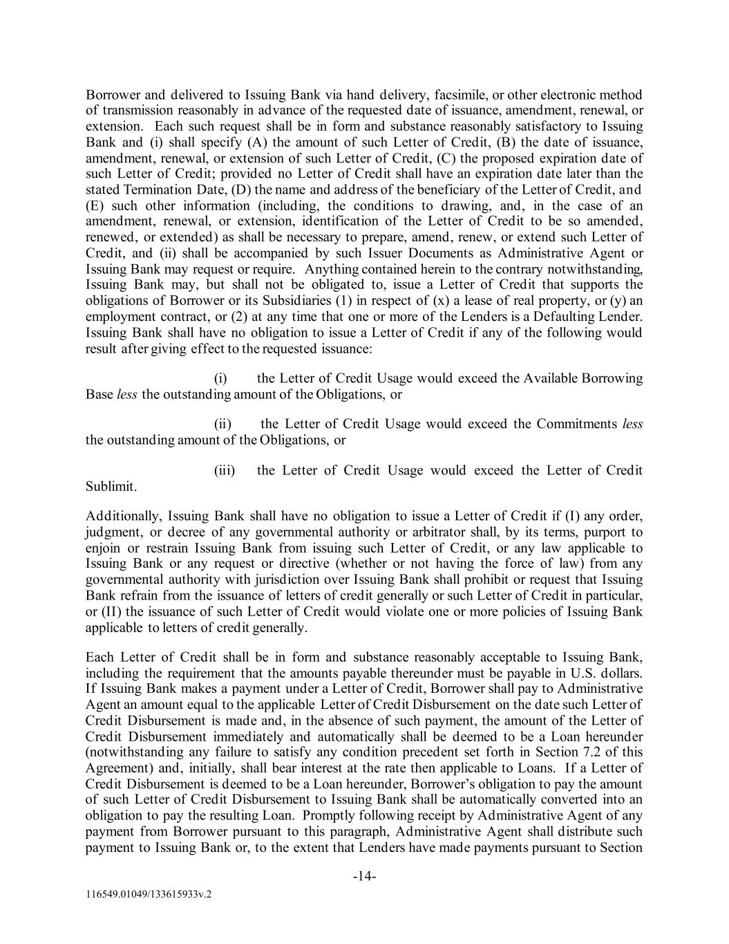 -14- 116549.01049/133615933v.2 Borrower and delivered to Issuing Bank via hand delivery, facsimile, or other electronic method of transmission reasonably in advance of the requested date of issuance, amendment, renewal, or extension. Each such request shall be in form and substance reasonably satisfactory to Issuing Bank and (i) shall specify (A) the amount of such Letter of Credit, (B) the date of issuance, amendment, renewal, or extension of such Letter of Credit, (C) the proposed expiration date of such Letter of Credit; provided no Letter of Credit shall have an expiration date later than the stated Termination Date, (D) the name and address of the beneficiary of the Letter of Credit, and (E) such other information (including, the conditions to drawing, and, in the case of an amendment, renewal, or extension, identification of the Letter of Credit to be so amended, renewed, or extended) as shall be necessary to prepare, amend, renew, or extend such Letter of Credit, and (ii) shall be accompanied by such Issuer Documents as Administrative Agent or Issuing Bank may request or require. Anything contained herein to the contrary notwithstanding, Issuing Bank may, but shall not be obligated to, issue a Letter of Credit that supports the obligations of Borrower or its Subsidiaries (1) in respect of (x) a lease of real property, or (y) an employment contract, or (2) at any time that one or more of the Lenders is a Defaulting Lender. Issuing Bank shall have no obligation to issue a Letter of Credit if any of the following would result after giving effect to the requested issuance: (i) the Letter of Credit Usage would exceed the Available Borrowing Base less the outstanding amount of the Obligations, or (ii) the Letter of Credit Usage would exceed the Commitments less the outstanding amount of the Obligations, or (iii) the Letter of Credit Usage would exceed the Letter of Credit Sublimit. Additionally, Issuing Bank shall have no obligation to issue a Letter of Credit if (I) any order, judgment, or decree of any governmental authority or arbitrator shall, by its terms, purport to enjoin or restrain Issuing Bank from issuing such Letter of Credit, or any law applicable to Issuing Bank or any request or directive (whether or not having the force of law) from any governmental authority with jurisdiction over Issuing Bank shall prohibit or request that Issuing Bank refrain from the issuance of letters of credit generally or such Letter of Credit in particular, or (II) the issuance of such Letter of Credit would violate one or more policies of Issuing Bank applicable to letters of credit generally. Each Letter of Credit shall be in form and substance reasonably acceptable to Issuing Bank, including the requirement that the amounts payable thereunder must be payable in U.S. dollars. If Issuing Bank makes a payment under a Letter of Credit, Borrower shall pay to Administrative Agent an amount equal to the applicable Letter of Credit Disbursement on the date such Letter of Credit Disbursement is made and, in the absence of such payment, the amount of the Letter of Credit Disbursement immediately and automatically shall be deemed to be a Loan hereunder (notwithstanding any failure to satisfy any condition precedent set forth in Section 7.2 of this Agreement) and, initially, shall bear interest at the rate then applicable to Loans. If a Letter of Credit Disbursement is deemed to be a Loan hereunder, Borrower’s obligation to pay the amount of such Letter of Credit Disbursement to Issuing Bank shall be automatically converted into an obligation to pay the resulting Loan. Promptly following receipt by Administrative Agent of any payment from Borrower pursuant to this paragraph, Administrative Agent shall distribute such payment to Issuing Bank or, to the extent that Lenders have made payments pursuant to Section