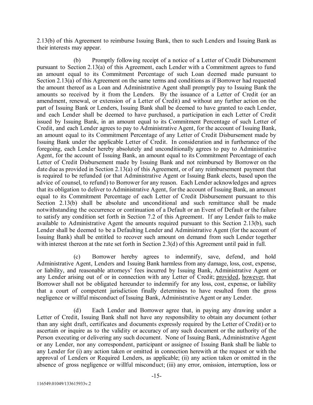-15- 116549.01049/133615933v.2 2.13(b) of this Agreement to reimburse Issuing Bank, then to such Lenders and Issuing Bank as their interests may appear. (b) Promptly following receipt of a notice of a Letter of Credit Disbursement pursuant to Section 2.13(a) of this Agreement, each Lender with a Commitment agrees to fund an amount equal to its Commitment Percentage of such Loan deemed made pursuant to Section 2.13(a) of this Agreement on the same terms and conditions as if Borrower had requested the amount thereof as a Loan and Administrative Agent shall promptly pay to Issuing Bank the amounts so received by it from the Lenders. By the issuance of a Letter of Credit (or an amendment, renewal, or extension of a Letter of Credit) and without any further action on the part of Issuing Bank or Lenders, Issuing Bank shall be deemed to have granted to each Lender, and each Lender shall be deemed to have purchased, a participation in each Letter of Credit issued by Issuing Bank, in an amount equal to its Commitment Percentage of such Letter of Credit, and each Lender agrees to pay to Administrative Agent, for the account of Issuing Bank, an amount equal to its Commitment Percentage of any Letter of Credit Disbursement made by Issuing Bank under the applicable Letter of Credit. In consideration and in furtherance of the foregoing, each Lender hereby absolutely and unconditionally agrees to pay to Administrative Agent, for the account of Issuing Bank, an amount equal to its Commitment Percentage of each Letter of Credit Disbursement made by Issuing Bank and not reimbursed by Borrower on the date due as provided in Section 2.13(a) of this Agreement, or of any reimbursement payment that is required to be refunded (or that Administrative Agent or Issuing Bank elects, based upon the advice of counsel, to refund) to Borrower for any reason. Each Lender acknowledges and agrees that its obligation to deliver to Administrative Agent, for the account of Issuing Bank, an amount equal to its Commitment Percentage of each Letter of Credit Disbursement pursuant to this Section 2.13(b) shall be absolute and unconditional and such remittance shall be made notwithstanding the occurrence or continuation of a Default or an Event of Default or the failure to satisfy any condition set forth in Section 7.2 of this Agreement. If any Lender fails to make available to Administrative Agent the amounts required pursuant to this Section 2.13(b), such Lender shall be deemed to be a Defaulting Lender and Administrative Agent (for the account of Issuing Bank) shall be entitled to recover such amount on demand from such Lender together with interest thereon at the rate set forth in Section 2.3(d) of this Agreement until paid in full. (c) Borrower hereby agrees to indemnify, save, defend, and hold Administrative Agent, Lenders and Issuing Bank harmless from any damage, loss, cost, expense, or liability, and reasonable attorneys’ fees incurred by Issuing Bank, Administrative Agent or any Lender arising out of or in connection with any Letter of Credit; provided, however, that Borrower shall not be obligated hereunder to indemnify for any loss, cost, expense, or liability that a court of competent jurisdiction finally determines to have resulted from the gross negligence or willful misconduct of Issuing Bank, Administrative Agent or any Lender. (d) Each Lender and Borrower agree that, in paying any drawing under a Letter of Credit, Issuing Bank shall not have any responsibility to obtain any document (other than any sight draft, certificates and documents expressly required by the Letter of Credit) or to ascertain or inquire as to the validity or accuracy of any such document or the authority of the Person executing or delivering any such document. None of Issuing Bank, Administrative Agent or any Lender, nor any correspondent, participant or assignee of Issuing Bank shall be liable to any Lender for (i) any action taken or omitted in connection herewith at the request or with the approval of Lenders or Required Lenders, as applicable; (ii) any action taken or omitted in the absence of gross negligence or willful misconduct; (iii) any error, omission, interruption, loss or