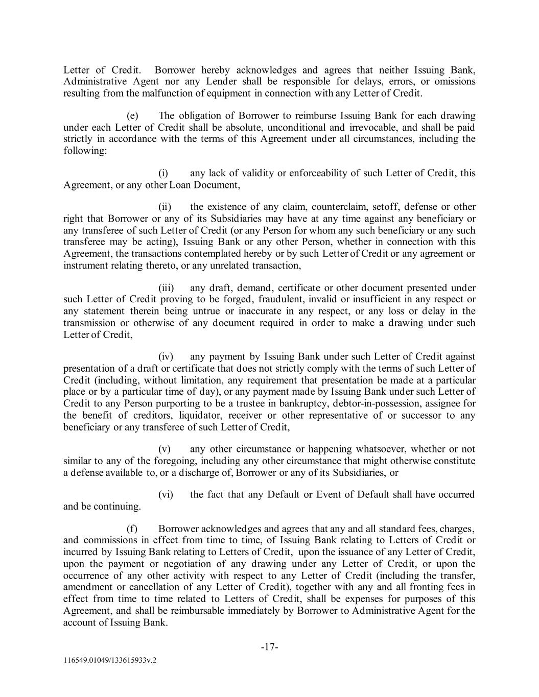 -17- 116549.01049/133615933v.2 Letter of Credit. Borrower hereby acknowledges and agrees that neither Issuing Bank, Administrative Agent nor any Lender shall be responsible for delays, errors, or omissions resulting from the malfunction of equipment in connection with any Letter of Credit. (e) The obligation of Borrower to reimburse Issuing Bank for each drawing under each Letter of Credit shall be absolute, unconditional and irrevocable, and shall be paid strictly in accordance with the terms of this Agreement under all circumstances, including the following: (i) any lack of validity or enforceability of such Letter of Credit, this Agreement, or any other Loan Document, (ii) the existence of any claim, counterclaim, setoff, defense or other right that Borrower or any of its Subsidiaries may have at any time against any beneficiary or any transferee of such Letter of Credit (or any Person for whom any such beneficiary or any such transferee may be acting), Issuing Bank or any other Person, whether in connection with this Agreement, the transactions contemplated hereby or by such Letter of Credit or any agreement or instrument relating thereto, or any unrelated transaction, (iii) any draft, demand, certificate or other document presented under such Letter of Credit proving to be forged, fraudulent, invalid or insufficient in any respect or any statement therein being untrue or inaccurate in any respect, or any loss or delay in the transmission or otherwise of any document required in order to make a drawing under such Letter of Credit, (iv) any payment by Issuing Bank under such Letter of Credit against presentation of a draft or certificate that does not strictly comply with the terms of such Letter of Credit (including, without limitation, any requirement that presentation be made at a particular place or by a particular time of day), or any payment made by Issuing Bank under such Letter of Credit to any Person purporting to be a trustee in bankruptcy, debtor-in-possession, assignee for the benefit of creditors, liquidator, receiver or other representative of or successor to any beneficiary or any transferee of such Letter of Credit, (v) any other circumstance or happening whatsoever, whether or not similar to any of the foregoing, including any other circumstance that might otherwise constitute a defense available to, or a discharge of, Borrower or any of its Subsidiaries, or (vi) the fact that any Default or Event of Default shall have occurred and be continuing. (f) Borrower acknowledges and agrees that any and all standard fees, charges, and commissions in effect from time to time, of Issuing Bank relating to Letters of Credit or incurred by Issuing Bank relating to Letters of Credit, upon the issuance of any Letter of Credit, upon the payment or negotiation of any drawing under any Letter of Credit, or upon the occurrence of any other activity with respect to any Letter of Credit (including the transfer, amendment or cancellation of any Letter of Credit), together with any and all fronting fees in effect from time to time related to Letters of Credit, shall be expenses for purposes of this Agreement, and shall be reimbursable immediately by Borrower to Administrative Agent for the account of Issuing Bank.