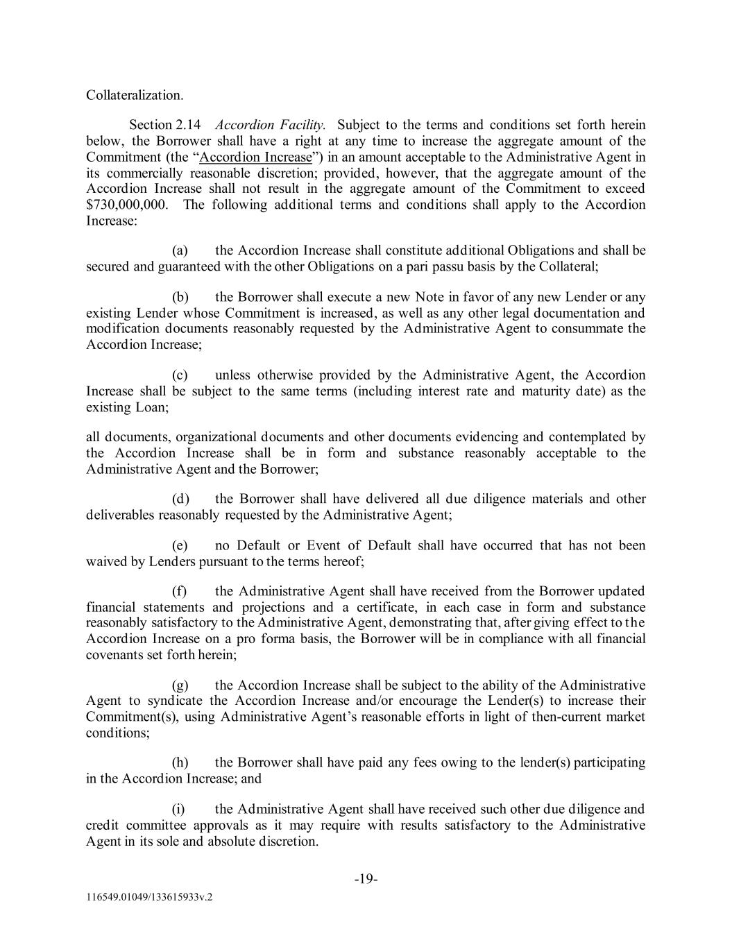 -19- 116549.01049/133615933v.2 Collateralization. Section 2.14 Accordion Facility. Subject to the terms and conditions set forth herein below, the Borrower shall have a right at any time to increase the aggregate amount of the Commitment (the “Accordion Increase”) in an amount acceptable to the Administrative Agent in its commercially reasonable discretion; provided, however, that the aggregate amount of the Accordion Increase shall not result in the aggregate amount of the Commitment to exceed $730,000,000. The following additional terms and conditions shall apply to the Accordion Increase: (a) the Accordion Increase shall constitute additional Obligations and shall be secured and guaranteed with the other Obligations on a pari passu basis by the Collateral; (b) the Borrower shall execute a new Note in favor of any new Lender or any existing Lender whose Commitment is increased, as well as any other legal documentation and modification documents reasonably requested by the Administrative Agent to consummate the Accordion Increase; (c) unless otherwise provided by the Administrative Agent, the Accordion Increase shall be subject to the same terms (including interest rate and maturity date) as the existing Loan; all documents, organizational documents and other documents evidencing and contemplated by the Accordion Increase shall be in form and substance reasonably acceptable to the Administrative Agent and the Borrower; (d) the Borrower shall have delivered all due diligence materials and other deliverables reasonably requested by the Administrative Agent; (e) no Default or Event of Default shall have occurred that has not been waived by Lenders pursuant to the terms hereof; (f) the Administrative Agent shall have received from the Borrower updated financial statements and projections and a certificate, in each case in form and substance reasonably satisfactory to the Administrative Agent, demonstrating that, after giving effect to the Accordion Increase on a pro forma basis, the Borrower will be in compliance with all financial covenants set forth herein; (g) the Accordion Increase shall be subject to the ability of the Administrative Agent to syndicate the Accordion Increase and/or encourage the Lender(s) to increase their Commitment(s), using Administrative Agent’s reasonable efforts in light of then-current market conditions; (h) the Borrower shall have paid any fees owing to the lender(s) participating in the Accordion Increase; and (i) the Administrative Agent shall have received such other due diligence and credit committee approvals as it may require with results satisfactory to the Administrative Agent in its sole and absolute discretion.