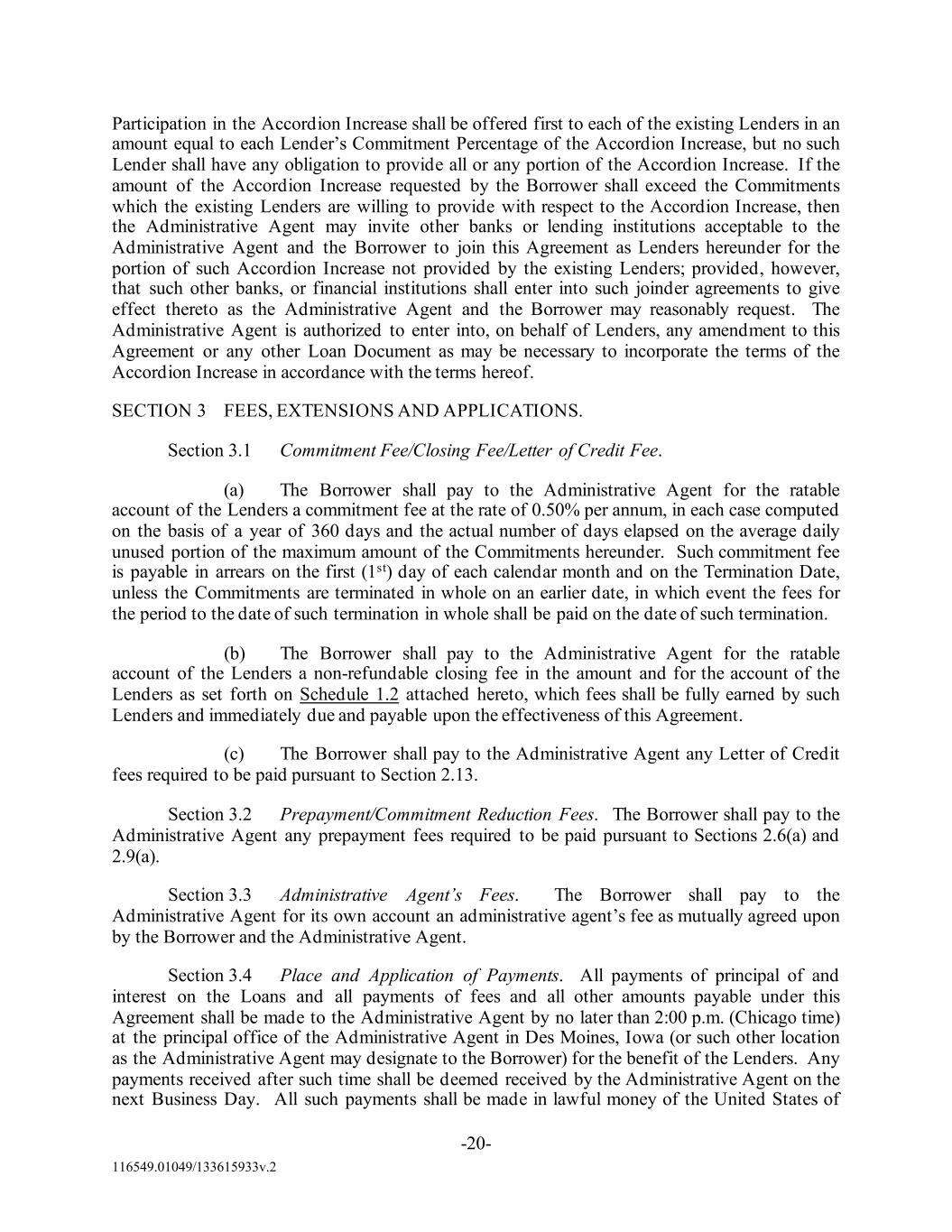 -20- 116549.01049/133615933v.2 Participation in the Accordion Increase shall be offered first to each of the existing Lenders in an amount equal to each Lender’s Commitment Percentage of the Accordion Increase, but no such Lender shall have any obligation to provide all or any portion of the Accordion Increase. If the amount of the Accordion Increase requested by the Borrower shall exceed the Commitments which the existing Lenders are willing to provide with respect to the Accordion Increase, then the Administrative Agent may invite other banks or lending institutions acceptable to the Administrative Agent and the Borrower to join this Agreement as Lenders hereunder for the portion of such Accordion Increase not provided by the existing Lenders; provided, however, that such other banks, or financial institutions shall enter into such joinder agreements to give effect thereto as the Administrative Agent and the Borrower may reasonably request. The Administrative Agent is authorized to enter into, on behalf of Lenders, any amendment to this Agreement or any other Loan Document as may be necessary to incorporate the terms of the Accordion Increase in accordance with the terms hereof. SECTION 3 FEES, EXTENSIONS AND APPLICATIONS. Section 3.1 Commitment Fee/Closing Fee/Letter of Credit Fee. (a) The Borrower shall pay to the Administrative Agent for the ratable account of the Lenders a commitment fee at the rate of 0.50% per annum, in each case computed on the basis of a year of 360 days and the actual number of days elapsed on the average daily unused portion of the maximum amount of the Commitments hereunder. Such commitment fee is payable in arrears on the first (1st) day of each calendar month and on the Termination Date, unless the Commitments are terminated in whole on an earlier date, in which event the fees for the period to the date of such termination in whole shall be paid on the date of such termination. (b) The Borrower shall pay to the Administrative Agent for the ratable account of the Lenders a non-refundable closing fee in the amount and for the account of the Lenders as set forth on Schedule 1.2 attached hereto, which fees shall be fully earned by such Lenders and immediately due and payable upon the effectiveness of this Agreement. (c) The Borrower shall pay to the Administrative Agent any Letter of Credit fees required to be paid pursuant to Section 2.13. Section 3.2 Prepayment/Commitment Reduction Fees. The Borrower shall pay to the Administrative Agent any prepayment fees required to be paid pursuant to Sections 2.6(a) and 2.9(a). Section 3.3 Administrative Agent’s Fees. The Borrower shall pay to the Administrative Agent for its own account an administrative agent’s fee as mutually agreed upon by the Borrower and the Administrative Agent. Section 3.4 Place and Application of Payments. All payments of principal of and interest on the Loans and all payments of fees and all other amounts payable under this Agreement shall be made to the Administrative Agent by no later than 2:00 p.m. (Chicago time) at the principal office of the Administrative Agent in Des Moines, Iowa (or such other location as the Administrative Agent may designate to the Borrower) for the benefit of the Lenders. Any payments received after such time shall be deemed received by the Administrative Agent on the next Business Day. All such payments shall be made in lawful money of the United States of