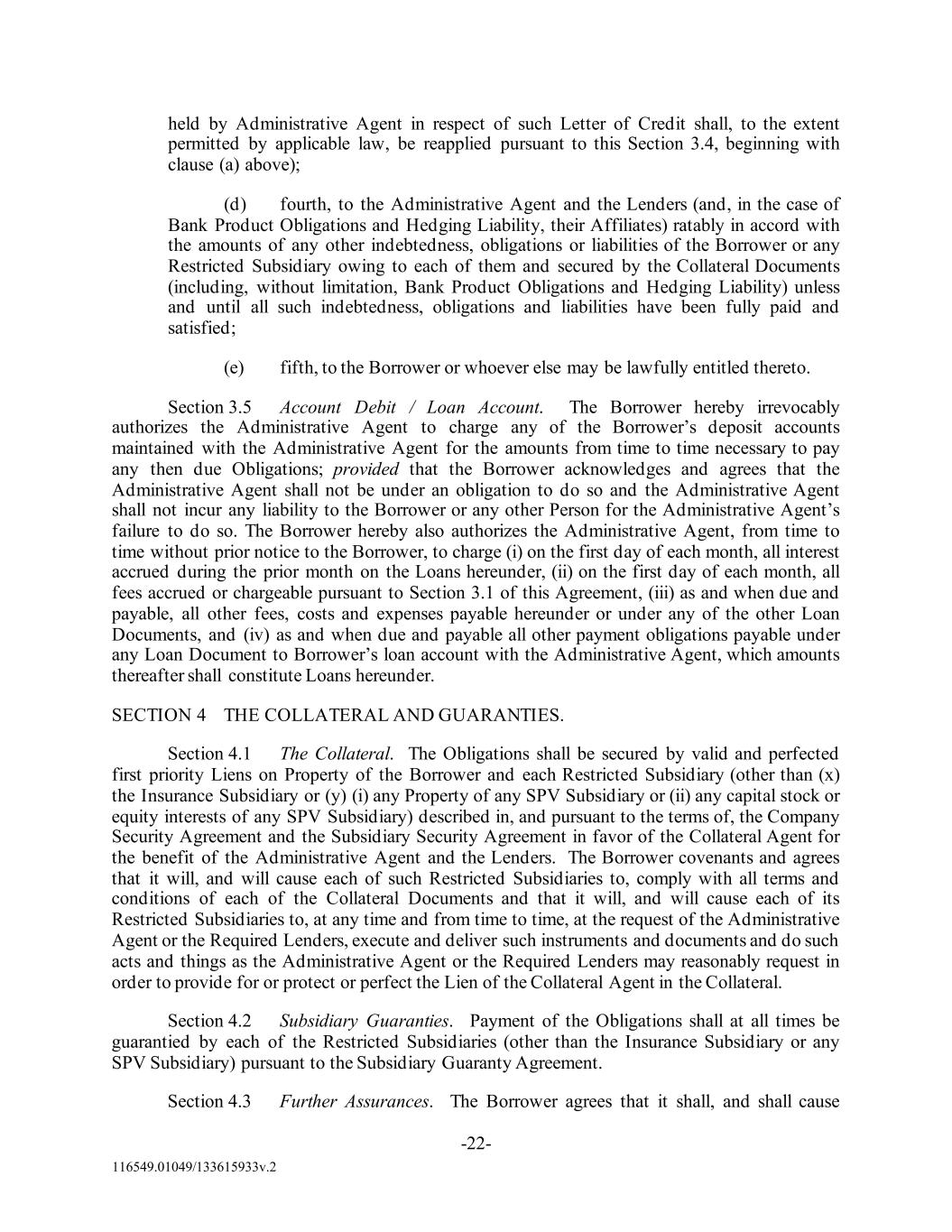 -22- 116549.01049/133615933v.2 held by Administrative Agent in respect of such Letter of Credit shall, to the extent permitted by applicable law, be reapplied pursuant to this Section 3.4, beginning with clause (a) above); (d) fourth, to the Administrative Agent and the Lenders (and, in the case of Bank Product Obligations and Hedging Liability, their Affiliates) ratably in accord with the amounts of any other indebtedness, obligations or liabilities of the Borrower or any Restricted Subsidiary owing to each of them and secured by the Collateral Documents (including, without limitation, Bank Product Obligations and Hedging Liability) unless and until all such indebtedness, obligations and liabilities have been fully paid and satisfied; (e) fifth, to the Borrower or whoever else may be lawfully entitled thereto. Section 3.5 Account Debit / Loan Account. The Borrower hereby irrevocably authorizes the Administrative Agent to charge any of the Borrower’s deposit accounts maintained with the Administrative Agent for the amounts from time to time necessary to pay any then due Obligations; provided that the Borrower acknowledges and agrees that the Administrative Agent shall not be under an obligation to do so and the Administrative Agent shall not incur any liability to the Borrower or any other Person for the Administrative Agent’s failure to do so. The Borrower hereby also authorizes the Administrative Agent, from time to time without prior notice to the Borrower, to charge (i) on the first day of each month, all interest accrued during the prior month on the Loans hereunder, (ii) on the first day of each month, all fees accrued or chargeable pursuant to Section 3.1 of this Agreement, (iii) as and when due and payable, all other fees, costs and expenses payable hereunder or under any of the other Loan Documents, and (iv) as and when due and payable all other payment obligations payable under any Loan Document to Borrower’s loan account with the Administrative Agent, which amounts thereafter shall constitute Loans hereunder. SECTION 4 THE COLLATERAL AND GUARANTIES. Section 4.1 The Collateral. The Obligations shall be secured by valid and perfected first priority Liens on Property of the Borrower and each Restricted Subsidiary (other than (x) the Insurance Subsidiary or (y) (i) any Property of any SPV Subsidiary or (ii) any capital stock or equity interests of any SPV Subsidiary) described in, and pursuant to the terms of, the Company Security Agreement and the Subsidiary Security Agreement in favor of the Collateral Agent for the benefit of the Administrative Agent and the Lenders. The Borrower covenants and agrees that it will, and will cause each of such Restricted Subsidiaries to, comply with all terms and conditions of each of the Collateral Documents and that it will, and will cause each of its Restricted Subsidiaries to, at any time and from time to time, at the request of the Administrative Agent or the Required Lenders, execute and deliver such instruments and documents and do such acts and things as the Administrative Agent or the Required Lenders may reasonably request in order to provide for or protect or perfect the Lien of the Collateral Agent in the Collateral. Section 4.2 Subsidiary Guaranties. Payment of the Obligations shall at all times be guarantied by each of the Restricted Subsidiaries (other than the Insurance Subsidiary or any SPV Subsidiary) pursuant to the Subsidiary Guaranty Agreement. Section 4.3 Further Assurances. The Borrower agrees that it shall, and shall cause