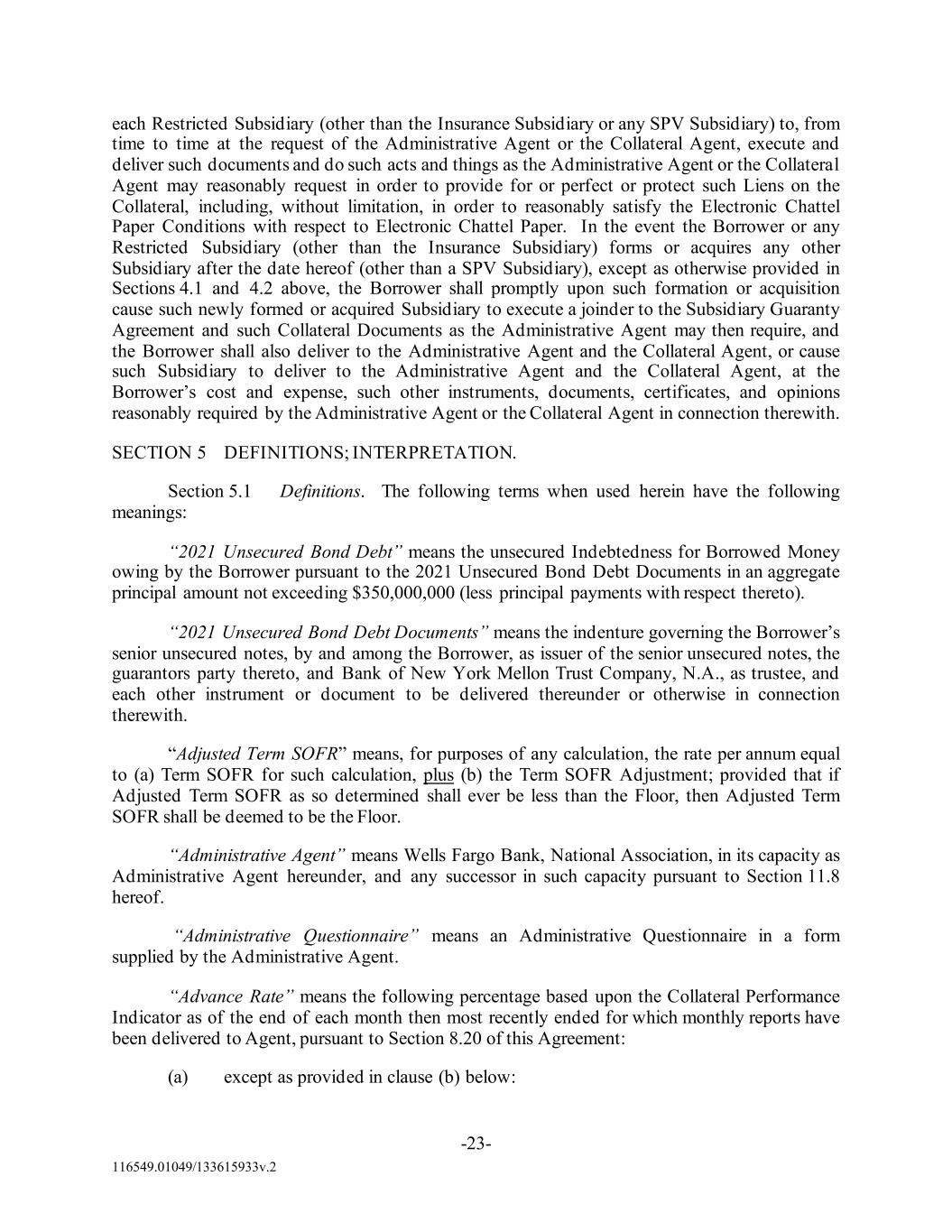 -23- 116549.01049/133615933v.2 each Restricted Subsidiary (other than the Insurance Subsidiary or any SPV Subsidiary) to, from time to time at the request of the Administrative Agent or the Collateral Agent, execute and deliver such documents and do such acts and things as the Administrative Agent or the Collateral Agent may reasonably request in order to provide for or perfect or protect such Liens on the Collateral, including, without limitation, in order to reasonably satisfy the Electronic Chattel Paper Conditions with respect to Electronic Chattel Paper. In the event the Borrower or any Restricted Subsidiary (other than the Insurance Subsidiary) forms or acquires any other Subsidiary after the date hereof (other than a SPV Subsidiary), except as otherwise provided in Sections 4.1 and 4.2 above, the Borrower shall promptly upon such formation or acquisition cause such newly formed or acquired Subsidiary to execute a joinder to the Subsidiary Guaranty Agreement and such Collateral Documents as the Administrative Agent may then require, and the Borrower shall also deliver to the Administrative Agent and the Collateral Agent, or cause such Subsidiary to deliver to the Administrative Agent and the Collateral Agent, at the Borrower’s cost and expense, such other instruments, documents, certificates, and opinions reasonably required by the Administrative Agent or the Collateral Agent in connection therewith. SECTION 5 DEFINITIONS; INTERPRETATION. Section 5.1 Definitions. The following terms when used herein have the following meanings: “2021 Unsecured Bond Debt” means the unsecured Indebtedness for Borrowed Money owing by the Borrower pursuant to the 2021 Unsecured Bond Debt Documents in an aggregate principal amount not exceeding $350,000,000 (less principal payments with respect thereto). “2021 Unsecured Bond Debt Documents” means the indenture governing the Borrower’s senior unsecured notes, by and among the Borrower, as issuer of the senior unsecured notes, the guarantors party thereto, and Bank of New York Mellon Trust Company, N.A., as trustee, and each other instrument or document to be delivered thereunder or otherwise in connection therewith. “Adjusted Term SOFR” means, for purposes of any calculation, the rate per annum equal to (a) Term SOFR for such calculation, plus (b) the Term SOFR Adjustment; provided that if Adjusted Term SOFR as so determined shall ever be less than the Floor, then Adjusted Term SOFR shall be deemed to be the Floor. “Administrative Agent” means Wells Fargo Bank, National Association, in its capacity as Administrative Agent hereunder, and any successor in such capacity pursuant to Section 11.8 hereof. “Administrative Questionnaire” means an Administrative Questionnaire in a form supplied by the Administrative Agent. “Advance Rate” means the following percentage based upon the Collateral Performance Indicator as of the end of each month then most recently ended for which monthly reports have been delivered to Agent, pursuant to Section 8.20 of this Agreement: (a) except as provided in clause (b) below: