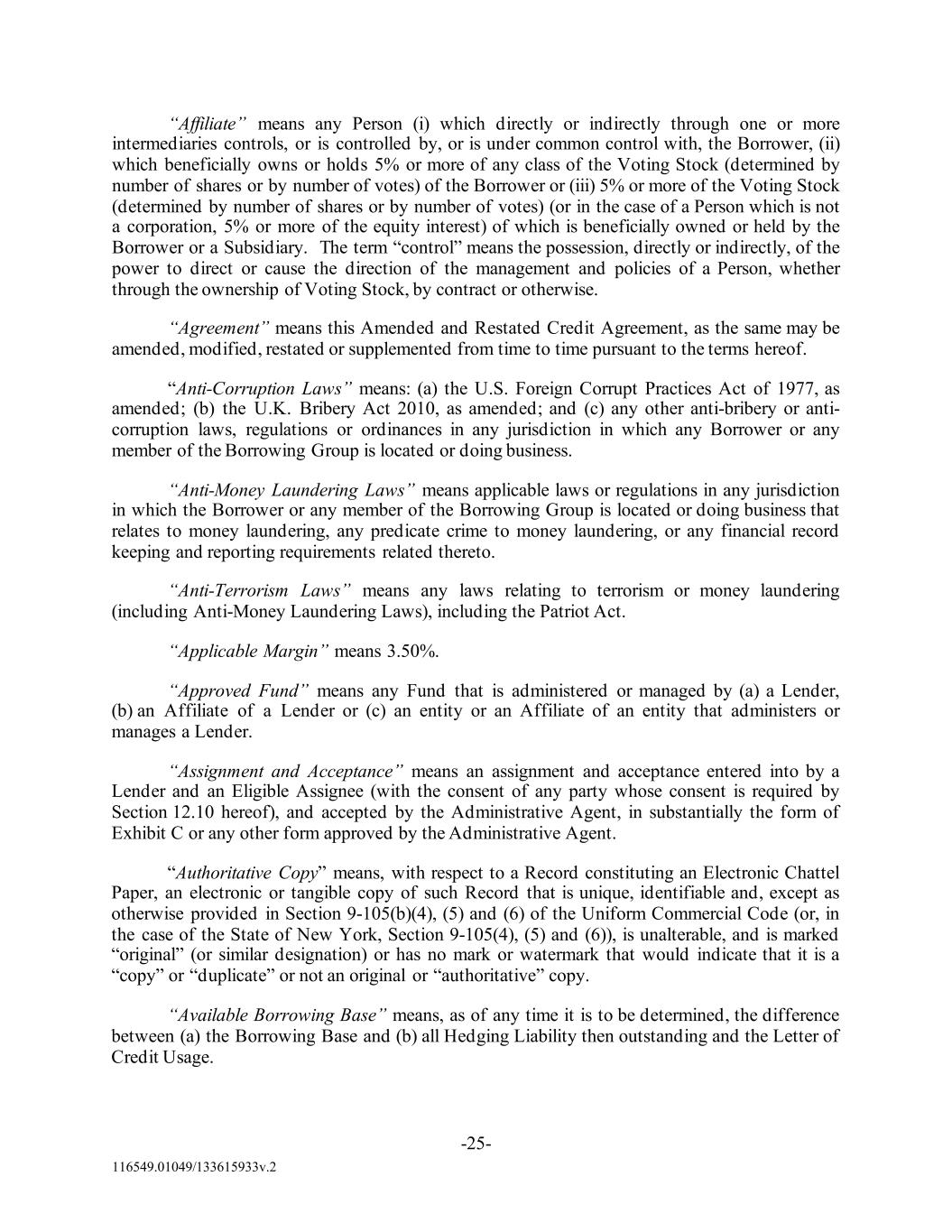 -25- 116549.01049/133615933v.2 “Affiliate” means any Person (i) which directly or indirectly through one or more intermediaries controls, or is controlled by, or is under common control with, the Borrower, (ii) which beneficially owns or holds 5% or more of any class of the Voting Stock (determined by number of shares or by number of votes) of the Borrower or (iii) 5% or more of the Voting Stock (determined by number of shares or by number of votes) (or in the case of a Person which is not a corporation, 5% or more of the equity interest) of which is beneficially owned or held by the Borrower or a Subsidiary. The term “control” means the possession, directly or indirectly, of the power to direct or cause the direction of the management and policies of a Person, whether through the ownership of Voting Stock, by contract or otherwise. “Agreement” means this Amended and Restated Credit Agreement, as the same may be amended, modified, restated or supplemented from time to time pursuant to the terms hereof. “Anti-Corruption Laws” means: (a) the U.S. Foreign Corrupt Practices Act of 1977, as amended; (b) the U.K. Bribery Act 2010, as amended; and (c) any other anti-bribery or anti- corruption laws, regulations or ordinances in any jurisdiction in which any Borrower or any member of the Borrowing Group is located or doing business. “Anti-Money Laundering Laws” means applicable laws or regulations in any jurisdiction in which the Borrower or any member of the Borrowing Group is located or doing business that relates to money laundering, any predicate crime to money laundering, or any financial record keeping and reporting requirements related thereto. “Anti-Terrorism Laws” means any laws relating to terrorism or money laundering (including Anti-Money Laundering Laws), including the Patriot Act. “Applicable Margin” means 3.50%. “Approved Fund” means any Fund that is administered or managed by (a) a Lender, (b) an Affiliate of a Lender or (c) an entity or an Affiliate of an entity that administers or manages a Lender. “Assignment and Acceptance” means an assignment and acceptance entered into by a Lender and an Eligible Assignee (with the consent of any party whose consent is required by Section 12.10 hereof), and accepted by the Administrative Agent, in substantially the form of Exhibit C or any other form approved by the Administrative Agent. “Authoritative Copy” means, with respect to a Record constituting an Electronic Chattel Paper, an electronic or tangible copy of such Record that is unique, identifiable and, except as otherwise provided in Section 9-105(b)(4), (5) and (6) of the Uniform Commercial Code (or, in the case of the State of New York, Section 9-105(4), (5) and (6)), is unalterable, and is marked “original” (or similar designation) or has no mark or watermark that would indicate that it is a “copy” or “duplicate” or not an original or “authoritative” copy. “Available Borrowing Base” means, as of any time it is to be determined, the difference between (a) the Borrowing Base and (b) all Hedging Liability then outstanding and the Letter of Credit Usage.