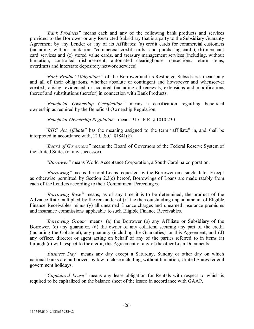 -26- 116549.01049/133615933v.2 “Bank Products” means each and any of the following bank products and services provided to the Borrower or any Restricted Subsidiary that is a party to the Subsidiary Guaranty Agreement by any Lender or any of its Affiliates: (a) credit cards for commercial customers (including, without limitation, “commercial credit cards” and purchasing cards), (b) merchant card services and (c) stored value cards, and treasury management services (including, without limitation, controlled disbursement, automated clearinghouse transactions, return items, overdrafts and interstate depository network services). “Bank Product Obligations” of the Borrower and its Restricted Subsidiaries means any and all of their obligations, whether absolute or contingent and howsoever and whensoever created, arising, evidenced or acquired (including all renewals, extensions and modifications thereof and substitutions therefor) in connection with Bank Products. “Beneficial Ownership Certification” means a certification regarding beneficial ownership as required by the Beneficial Ownership Regulation. “Beneficial Ownership Regulation” means 31 C.F.R. § 1010.230. “BHC Act Affiliate” has the meaning assigned to the term “affiliate” in, and shall be interpreted in accordance with, 12 U.S.C. §1841(k). “Board of Governors” means the Board of Governors of the Federal Reserve System of the United States (or any successor). “Borrower” means World Acceptance Corporation, a South Carolina corporation. “Borrowing” means the total Loans requested by the Borrower on a single date. Except as otherwise permitted by Section 2.3(c) hereof, Borrowings of Loans are made ratably from each of the Lenders according to their Commitment Percentages. “Borrowing Base” means, as of any time it is to be determined, the product of the Advance Rate multiplied by the remainder of (x) the then outstanding unpaid amount of Eligible Finance Receivables minus (y) all unearned finance charges and unearned insurance premiums and insurance commissions applicable to such Eligible Finance Receivables. “Borrowing Group” means: (a) the Borrower (b) any Affiliate or Subsidiary of the Borrower, (c) any guarantor, (d) the owner of any collateral securing any part of the credit (including the Collateral), any guaranty (including the Guaranties), or this Agreement, and (d) any officer, director or agent acting on behalf of any of the parties referred to in items (a) through (c) with respect to the credit, this Agreement or any of the other Loan Documents. “Business Day” means any day except a Saturday, Sunday or other day on which national banks are authorized by law to close including, without limitation, United States federal government holidays. “Capitalized Lease” means any lease obligation for Rentals with respect to which is required to be capitalized on the balance sheet of the lessee in accordance with GAAP.