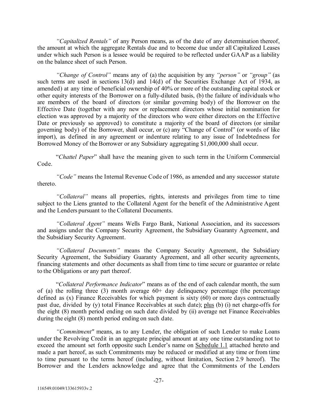 -27- 116549.01049/133615933v.2 “Capitalized Rentals” of any Person means, as of the date of any determination thereof, the amount at which the aggregate Rentals due and to become due under all Capitalized Leases under which such Person is a lessee would be required to be reflected under GAAP as a liability on the balance sheet of such Person. “Change of Control” means any of (a) the acquisition by any “person” or “group” (as such terms are used in sections 13(d) and 14(d) of the Securities Exchange Act of 1934, as amended) at any time of beneficial ownership of 40% or more of the outstanding capital stock or other equity interests of the Borrower on a fully-diluted basis, (b) the failure of individuals who are members of the board of directors (or similar governing body) of the Borrower on the Effective Date (together with any new or replacement directors whose initial nomination for election was approved by a majority of the directors who were either directors on the Effective Date or previously so approved) to constitute a majority of the board of directors (or similar governing body) of the Borrower, shall occur, or (c) any “Change of Control” (or words of like import), as defined in any agreement or indenture relating to any issue of Indebtedness for Borrowed Money of the Borrower or any Subsidiary aggregating $1,000,000 shall occur. “Chattel Paper” shall have the meaning given to such term in the Uniform Commercial Code. “Code” means the Internal Revenue Code of 1986, as amended and any successor statute thereto. “Collateral” means all properties, rights, interests and privileges from time to time subject to the Liens granted to the Collateral Agent for the benefit of the Administrative Agent and the Lenders pursuant to the Collateral Documents. “Collateral Agent” means Wells Fargo Bank, National Association, and its successors and assigns under the Company Security Agreement, the Subsidiary Guaranty Agreement, and the Subsidiary Security Agreement. “Collateral Documents” means the Company Security Agreement, the Subsidiary Security Agreement, the Subsidiary Guaranty Agreement, and all other security agreements, financing statements and other documents as shall from time to time secure or guarantee or relate to the Obligations or any part thereof. “Collateral Performance Indicator” means as of the end of each calendar month, the sum of (a) the rolling three (3) month average 60+ day delinquency percentage (the percentage defined as (x) Finance Receivables for which payment is sixty (60) or more days contractually past due, divided by (y) total Finance Receivables at such date); plus (b) (i) net charge-offs for the eight (8) month period ending on such date divided by (ii) average net Finance Receivables during the eight (8) month period ending on such date. “Commitment" means, as to any Lender, the obligation of such Lender to make Loans under the Revolving Credit in an aggregate principal amount at any one time outstanding not to exceed the amount set forth opposite such Lender’s name on Schedule 1.1 attached hereto and made a part hereof, as such Commitments may be reduced or modified at any time or from time to time pursuant to the terms hereof (including, without limitation, Section 2.9 hereof). The Borrower and the Lenders acknowledge and agree that the Commitments of the Lenders