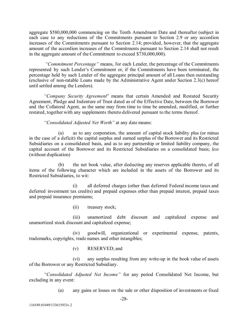 -28- 116549.01049/133615933v.2 aggregate $580,000,000 commencing on the Tenth Amendment Date and thereafter (subject in each case to any reductions of the Commitments pursuant to Section 2.9 or any accordion increases of the Commitments pursuant to Section 2.14; provided, however, that the aggregate amount of the accordion increases of the Commitments pursuant to Section 2.14 shall not result in the aggregate amount of the Commitment to exceed $730,000,000). “Commitment Percentage” means, for each Lender, the percentage of the Commitments represented by such Lender’s Commitment or, if the Commitments have been terminated, the percentage held by such Lender of the aggregate principal amount of all Loans then outstanding (exclusive of non-ratable Loans made by the Administrative Agent under Section 2.3(c) hereof until settled among the Lenders). “Company Security Agreement” means that certain Amended and Restated Security Agreement, Pledge and Indenture of Trust dated as of the Effective Date, between the Borrower and the Collateral Agent, as the same may from time to time be amended, modified, or further restated, together with any supplements thereto delivered pursuant to the terms thereof. “Consolidated Adjusted Net Worth” at any date means: (a) as to any corporation, the amount of capital stock liability plus (or minus in the case of a deficit) the capital surplus and earned surplus of the Borrower and its Restricted Subsidiaries on a consolidated basis, and as to any partnership or limited liability company, the capital account of the Borrower and its Restricted Subsidiaries on a consolidated basis; less (without duplication) (b) the net book value, after deducting any reserves applicable thereto, of all items of the following character which are included in the assets of the Borrower and its Restricted Subsidiaries, to wit: (i) all deferred charges (other than deferred Federal income taxes and deferred investment tax credits) and prepaid expenses other than prepaid interest, prepaid taxes and prepaid insurance premiums; (ii) treasury stock; (iii) unamortized debt discount and capitalized expense and unamortized stock discount and capitalized expense; (iv) goodwill, organizational or experimental expense, patents, trademarks, copyrights, trade names and other intangibles; (v) RESERVED; and (vi) any surplus resulting from any write-up in the book value of assets of the Borrower or any Restricted Subsidiary. “Consolidated Adjusted Net Income” for any period Consolidated Net Income, but excluding in any event: (a) any gains or losses on the sale or other disposition of investments or fixed