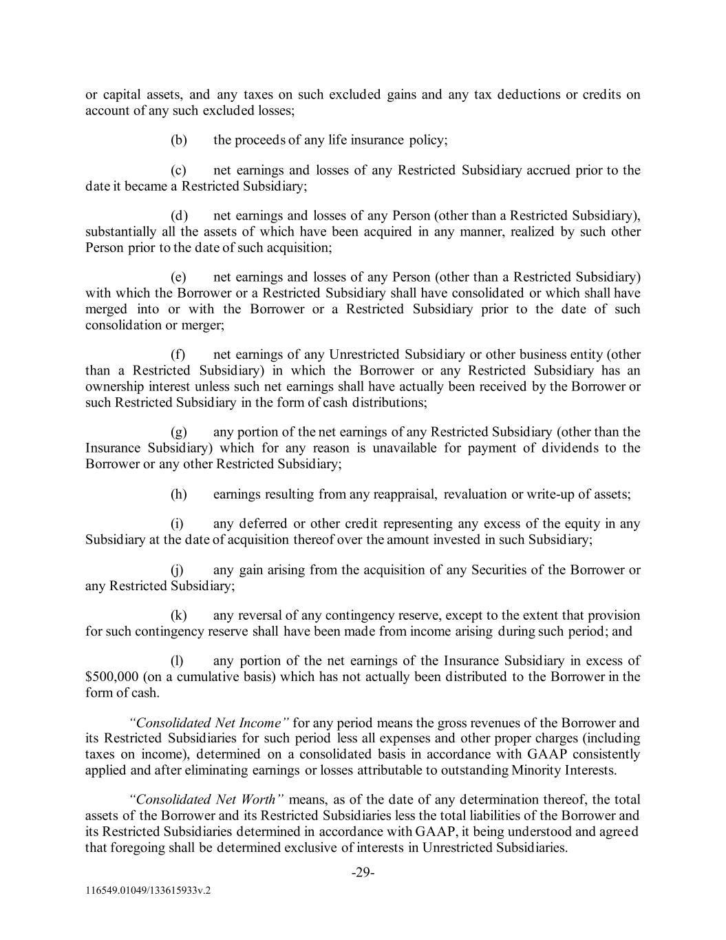 -29- 116549.01049/133615933v.2 or capital assets, and any taxes on such excluded gains and any tax deductions or credits on account of any such excluded losses; (b) the proceeds of any life insurance policy; (c) net earnings and losses of any Restricted Subsidiary accrued prior to the date it became a Restricted Subsidiary; (d) net earnings and losses of any Person (other than a Restricted Subsidiary), substantially all the assets of which have been acquired in any manner, realized by such other Person prior to the date of such acquisition; (e) net earnings and losses of any Person (other than a Restricted Subsidiary) with which the Borrower or a Restricted Subsidiary shall have consolidated or which shall have merged into or with the Borrower or a Restricted Subsidiary prior to the date of such consolidation or merger; (f) net earnings of any Unrestricted Subsidiary or other business entity (other than a Restricted Subsidiary) in which the Borrower or any Restricted Subsidiary has an ownership interest unless such net earnings shall have actually been received by the Borrower or such Restricted Subsidiary in the form of cash distributions; (g) any portion of the net earnings of any Restricted Subsidiary (other than the Insurance Subsidiary) which for any reason is unavailable for payment of dividends to the Borrower or any other Restricted Subsidiary; (h) earnings resulting from any reappraisal, revaluation or write-up of assets; (i) any deferred or other credit representing any excess of the equity in any Subsidiary at the date of acquisition thereof over the amount invested in such Subsidiary; (j) any gain arising from the acquisition of any Securities of the Borrower or any Restricted Subsidiary; (k) any reversal of any contingency reserve, except to the extent that provision for such contingency reserve shall have been made from income arising during such period; and (l) any portion of the net earnings of the Insurance Subsidiary in excess of $500,000 (on a cumulative basis) which has not actually been distributed to the Borrower in the form of cash. “Consolidated Net Income” for any period means the gross revenues of the Borrower and its Restricted Subsidiaries for such period less all expenses and other proper charges (including taxes on income), determined on a consolidated basis in accordance with GAAP consistently applied and after eliminating earnings or losses attributable to outstanding Minority Interests. “Consolidated Net Worth” means, as of the date of any determination thereof, the total assets of the Borrower and its Restricted Subsidiaries less the total liabilities of the Borrower and its Restricted Subsidiaries determined in accordance with GAAP, it being understood and agreed that foregoing shall be determined exclusive of interests in Unrestricted Subsidiaries.