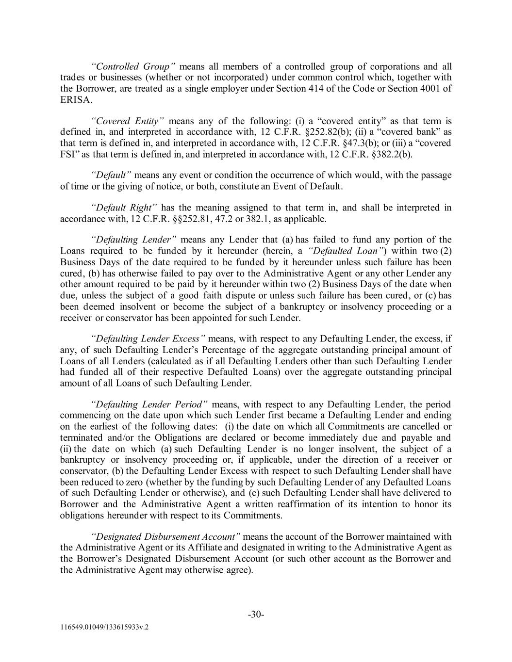 -30- 116549.01049/133615933v.2 “Controlled Group” means all members of a controlled group of corporations and all trades or businesses (whether or not incorporated) under common control which, together with the Borrower, are treated as a single employer under Section 414 of the Code or Section 4001 of ERISA. “Covered Entity” means any of the following: (i) a “covered entity” as that term is defined in, and interpreted in accordance with, 12 C.F.R. §252.82(b); (ii) a “covered bank” as that term is defined in, and interpreted in accordance with, 12 C.F.R. §47.3(b); or (iii) a “covered FSI” as that term is defined in, and interpreted in accordance with, 12 C.F.R. §382.2(b). “Default” means any event or condition the occurrence of which would, with the passage of time or the giving of notice, or both, constitute an Event of Default. “Default Right” has the meaning assigned to that term in, and shall be interpreted in accordance with, 12 C.F.R. §§252.81, 47.2 or 382.1, as applicable. “Defaulting Lender” means any Lender that (a) has failed to fund any portion of the Loans required to be funded by it hereunder (herein, a “Defaulted Loan”) within two (2) Business Days of the date required to be funded by it hereunder unless such failure has been cured, (b) has otherwise failed to pay over to the Administrative Agent or any other Lender any other amount required to be paid by it hereunder within two (2) Business Days of the date when due, unless the subject of a good faith dispute or unless such failure has been cured, or (c) has been deemed insolvent or become the subject of a bankruptcy or insolvency proceeding or a receiver or conservator has been appointed for such Lender. “Defaulting Lender Excess” means, with respect to any Defaulting Lender, the excess, if any, of such Defaulting Lender’s Percentage of the aggregate outstanding principal amount of Loans of all Lenders (calculated as if all Defaulting Lenders other than such Defaulting Lender had funded all of their respective Defaulted Loans) over the aggregate outstanding principal amount of all Loans of such Defaulting Lender. “Defaulting Lender Period” means, with respect to any Defaulting Lender, the period commencing on the date upon which such Lender first became a Defaulting Lender and ending on the earliest of the following dates: (i) the date on which all Commitments are cancelled or terminated and/or the Obligations are declared or become immediately due and payable and (ii) the date on which (a) such Defaulting Lender is no longer insolvent, the subject of a bankruptcy or insolvency proceeding or, if applicable, under the direction of a receiver or conservator, (b) the Defaulting Lender Excess with respect to such Defaulting Lender shall have been reduced to zero (whether by the funding by such Defaulting Lender of any Defaulted Loans of such Defaulting Lender or otherwise), and (c) such Defaulting Lender shall have delivered to Borrower and the Administrative Agent a written reaffirmation of its intention to honor its obligations hereunder with respect to its Commitments. “Designated Disbursement Account” means the account of the Borrower maintained with the Administrative Agent or its Affiliate and designated in writing to the Administrative Agent as the Borrower’s Designated Disbursement Account (or such other account as the Borrower and the Administrative Agent may otherwise agree).