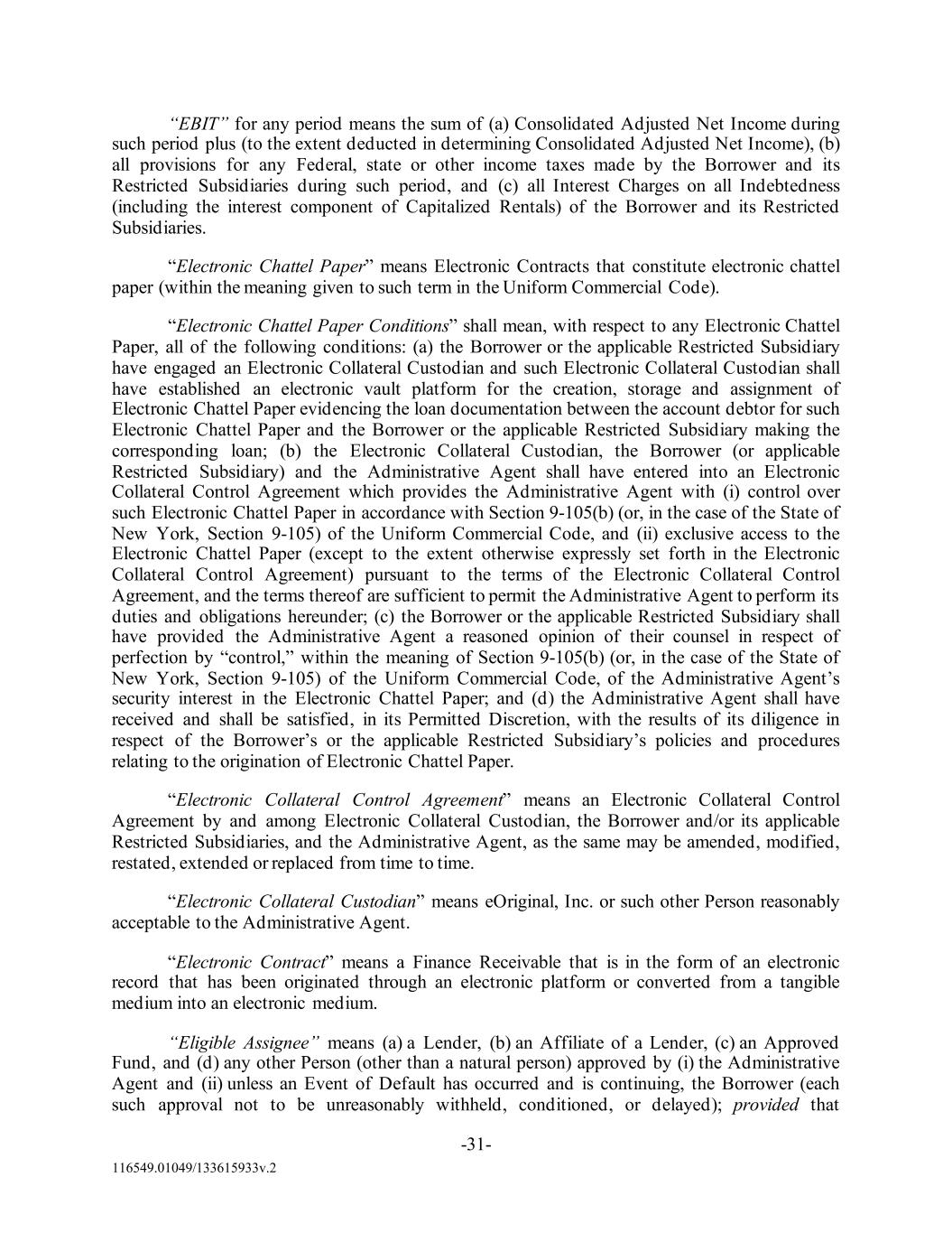 -31- 116549.01049/133615933v.2 “EBIT” for any period means the sum of (a) Consolidated Adjusted Net Income during such period plus (to the extent deducted in determining Consolidated Adjusted Net Income), (b) all provisions for any Federal, state or other income taxes made by the Borrower and its Restricted Subsidiaries during such period, and (c) all Interest Charges on all Indebtedness (including the interest component of Capitalized Rentals) of the Borrower and its Restricted Subsidiaries. “Electronic Chattel Paper” means Electronic Contracts that constitute electronic chattel paper (within the meaning given to such term in the Uniform Commercial Code). “Electronic Chattel Paper Conditions” shall mean, with respect to any Electronic Chattel Paper, all of the following conditions: (a) the Borrower or the applicable Restricted Subsidiary have engaged an Electronic Collateral Custodian and such Electronic Collateral Custodian shall have established an electronic vault platform for the creation, storage and assignment of Electronic Chattel Paper evidencing the loan documentation between the account debtor for such Electronic Chattel Paper and the Borrower or the applicable Restricted Subsidiary making the corresponding loan; (b) the Electronic Collateral Custodian, the Borrower (or applicable Restricted Subsidiary) and the Administrative Agent shall have entered into an Electronic Collateral Control Agreement which provides the Administrative Agent with (i) control over such Electronic Chattel Paper in accordance with Section 9-105(b) (or, in the case of the State of New York, Section 9-105) of the Uniform Commercial Code, and (ii) exclusive access to the Electronic Chattel Paper (except to the extent otherwise expressly set forth in the Electronic Collateral Control Agreement) pursuant to the terms of the Electronic Collateral Control Agreement, and the terms thereof are sufficient to permit the Administrative Agent to perform its duties and obligations hereunder; (c) the Borrower or the applicable Restricted Subsidiary shall have provided the Administrative Agent a reasoned opinion of their counsel in respect of perfection by “control,” within the meaning of Section 9-105(b) (or, in the case of the State of New York, Section 9-105) of the Uniform Commercial Code, of the Administrative Agent’s security interest in the Electronic Chattel Paper; and (d) the Administrative Agent shall have received and shall be satisfied, in its Permitted Discretion, with the results of its diligence in respect of the Borrower’s or the applicable Restricted Subsidiary’s policies and procedures relating to the origination of Electronic Chattel Paper. “Electronic Collateral Control Agreement” means an Electronic Collateral Control Agreement by and among Electronic Collateral Custodian, the Borrower and/or its applicable Restricted Subsidiaries, and the Administrative Agent, as the same may be amended, modified, restated, extended or replaced from time to time. “Electronic Collateral Custodian” means eOriginal, Inc. or such other Person reasonably acceptable to the Administrative Agent. “Electronic Contract” means a Finance Receivable that is in the form of an electronic record that has been originated through an electronic platform or converted from a tangible medium into an electronic medium. “Eligible Assignee” means (a) a Lender, (b) an Affiliate of a Lender, (c) an Approved Fund, and (d) any other Person (other than a natural person) approved by (i) the Administrative Agent and (ii) unless an Event of Default has occurred and is continuing, the Borrower (each such approval not to be unreasonably withheld, conditioned, or delayed); provided that