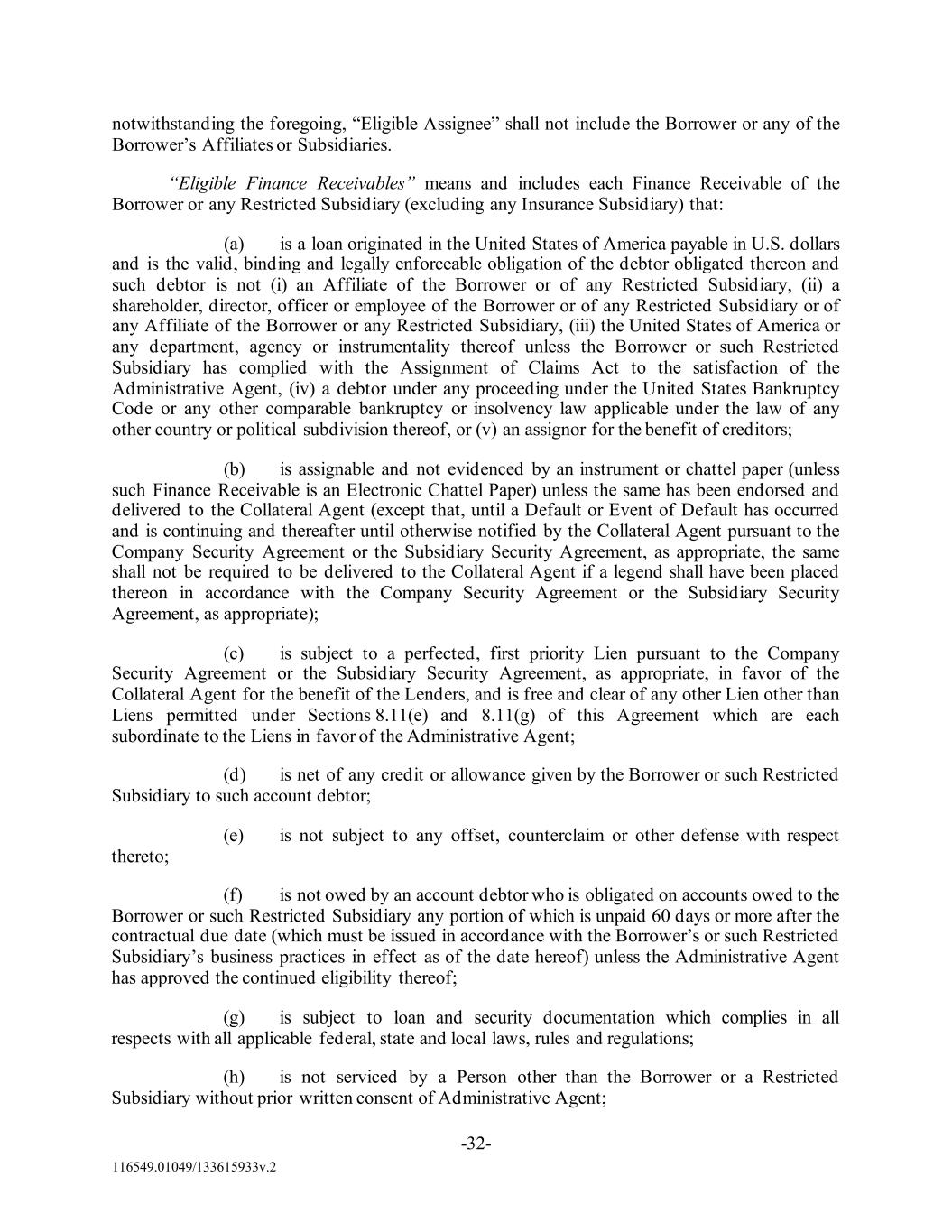 -32- 116549.01049/133615933v.2 notwithstanding the foregoing, “Eligible Assignee” shall not include the Borrower or any of the Borrower’s Affiliates or Subsidiaries. “Eligible Finance Receivables” means and includes each Finance Receivable of the Borrower or any Restricted Subsidiary (excluding any Insurance Subsidiary) that: (a) is a loan originated in the United States of America payable in U.S. dollars and is the valid, binding and legally enforceable obligation of the debtor obligated thereon and such debtor is not (i) an Affiliate of the Borrower or of any Restricted Subsidiary, (ii) a shareholder, director, officer or employee of the Borrower or of any Restricted Subsidiary or of any Affiliate of the Borrower or any Restricted Subsidiary, (iii) the United States of America or any department, agency or instrumentality thereof unless the Borrower or such Restricted Subsidiary has complied with the Assignment of Claims Act to the satisfaction of the Administrative Agent, (iv) a debtor under any proceeding under the United States Bankruptcy Code or any other comparable bankruptcy or insolvency law applicable under the law of any other country or political subdivision thereof, or (v) an assignor for the benefit of creditors; (b) is assignable and not evidenced by an instrument or chattel paper (unless such Finance Receivable is an Electronic Chattel Paper) unless the same has been endorsed and delivered to the Collateral Agent (except that, until a Default or Event of Default has occurred and is continuing and thereafter until otherwise notified by the Collateral Agent pursuant to the Company Security Agreement or the Subsidiary Security Agreement, as appropriate, the same shall not be required to be delivered to the Collateral Agent if a legend shall have been placed thereon in accordance with the Company Security Agreement or the Subsidiary Security Agreement, as appropriate); (c) is subject to a perfected, first priority Lien pursuant to the Company Security Agreement or the Subsidiary Security Agreement, as appropriate, in favor of the Collateral Agent for the benefit of the Lenders, and is free and clear of any other Lien other than Liens permitted under Sections 8.11(e) and 8.11(g) of this Agreement which are each subordinate to the Liens in favor of the Administrative Agent; (d) is net of any credit or allowance given by the Borrower or such Restricted Subsidiary to such account debtor; (e) is not subject to any offset, counterclaim or other defense with respect thereto; (f) is not owed by an account debtor who is obligated on accounts owed to the Borrower or such Restricted Subsidiary any portion of which is unpaid 60 days or more after the contractual due date (which must be issued in accordance with the Borrower’s or such Restricted Subsidiary’s business practices in effect as of the date hereof) unless the Administrative Agent has approved the continued eligibility thereof; (g) is subject to loan and security documentation which complies in all respects with all applicable federal, state and local laws, rules and regulations; (h) is not serviced by a Person other than the Borrower or a Restricted Subsidiary without prior written consent of Administrative Agent;
