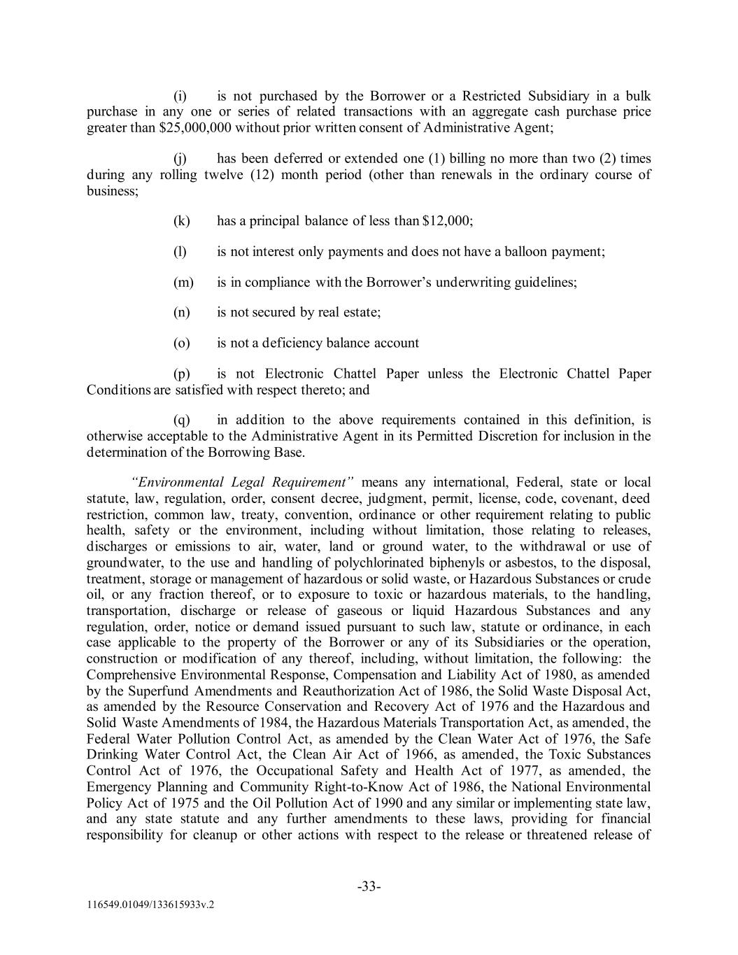 -33- 116549.01049/133615933v.2 (i) is not purchased by the Borrower or a Restricted Subsidiary in a bulk purchase in any one or series of related transactions with an aggregate cash purchase price greater than $25,000,000 without prior written consent of Administrative Agent; (j) has been deferred or extended one (1) billing no more than two (2) times during any rolling twelve (12) month period (other than renewals in the ordinary course of business; (k) has a principal balance of less than $12,000; (l) is not interest only payments and does not have a balloon payment; (m) is in compliance with the Borrower’s underwriting guidelines; (n) is not secured by real estate; (o) is not a deficiency balance account (p) is not Electronic Chattel Paper unless the Electronic Chattel Paper Conditions are satisfied with respect thereto; and (q) in addition to the above requirements contained in this definition, is otherwise acceptable to the Administrative Agent in its Permitted Discretion for inclusion in the determination of the Borrowing Base. “Environmental Legal Requirement” means any international, Federal, state or local statute, law, regulation, order, consent decree, judgment, permit, license, code, covenant, deed restriction, common law, treaty, convention, ordinance or other requirement relating to public health, safety or the environment, including without limitation, those relating to releases, discharges or emissions to air, water, land or ground water, to the withdrawal or use of groundwater, to the use and handling of polychlorinated biphenyls or asbestos, to the disposal, treatment, storage or management of hazardous or solid waste, or Hazardous Substances or crude oil, or any fraction thereof, or to exposure to toxic or hazardous materials, to the handling, transportation, discharge or release of gaseous or liquid Hazardous Substances and any regulation, order, notice or demand issued pursuant to such law, statute or ordinance, in each case applicable to the property of the Borrower or any of its Subsidiaries or the operation, construction or modification of any thereof, including, without limitation, the following: the Comprehensive Environmental Response, Compensation and Liability Act of 1980, as amended by the Superfund Amendments and Reauthorization Act of 1986, the Solid Waste Disposal Act, as amended by the Resource Conservation and Recovery Act of 1976 and the Hazardous and Solid Waste Amendments of 1984, the Hazardous Materials Transportation Act, as amended, the Federal Water Pollution Control Act, as amended by the Clean Water Act of 1976, the Safe Drinking Water Control Act, the Clean Air Act of 1966, as amended, the Toxic Substances Control Act of 1976, the Occupational Safety and Health Act of 1977, as amended, the Emergency Planning and Community Right-to-Know Act of 1986, the National Environmental Policy Act of 1975 and the Oil Pollution Act of 1990 and any similar or implementing state law, and any state statute and any further amendments to these laws, providing for financial responsibility for cleanup or other actions with respect to the release or threatened release of