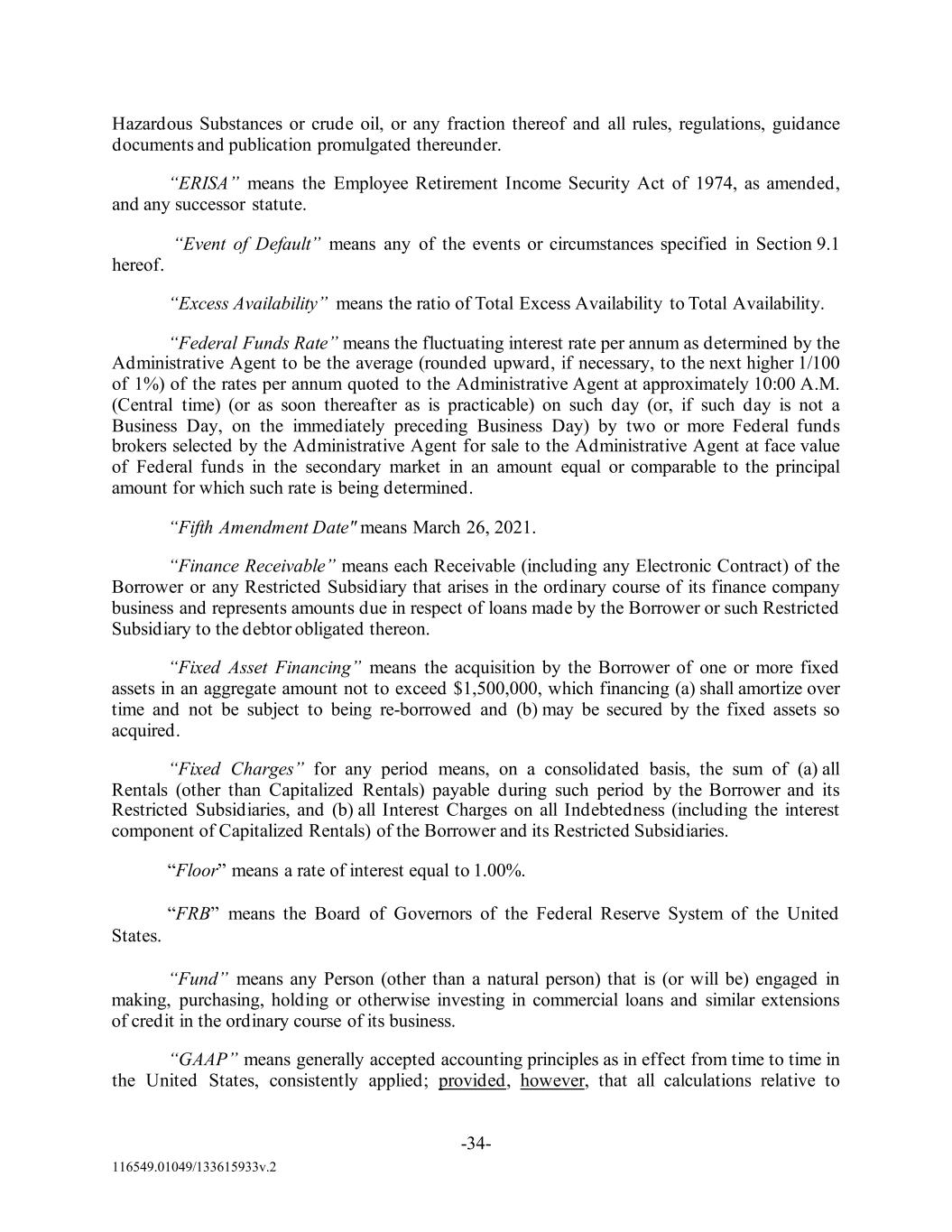 -34- 116549.01049/133615933v.2 Hazardous Substances or crude oil, or any fraction thereof and all rules, regulations, guidance documents and publication promulgated thereunder. “ERISA” means the Employee Retirement Income Security Act of 1974, as amended, and any successor statute. “Event of Default” means any of the events or circumstances specified in Section 9.1 hereof. “Excess Availability” means the ratio of Total Excess Availability to Total Availability. “Federal Funds Rate” means the fluctuating interest rate per annum as determined by the Administrative Agent to be the average (rounded upward, if necessary, to the next higher 1/100 of 1%) of the rates per annum quoted to the Administrative Agent at approximately 10:00 A.M. (Central time) (or as soon thereafter as is practicable) on such day (or, if such day is not a Business Day, on the immediately preceding Business Day) by two or more Federal funds brokers selected by the Administrative Agent for sale to the Administrative Agent at face value of Federal funds in the secondary market in an amount equal or comparable to the principal amount for which such rate is being determined. “Fifth Amendment Date" means March 26, 2021. “Finance Receivable” means each Receivable (including any Electronic Contract) of the Borrower or any Restricted Subsidiary that arises in the ordinary course of its finance company business and represents amounts due in respect of loans made by the Borrower or such Restricted Subsidiary to the debtor obligated thereon. “Fixed Asset Financing” means the acquisition by the Borrower of one or more fixed assets in an aggregate amount not to exceed $1,500,000, which financing (a) shall amortize over time and not be subject to being re-borrowed and (b) may be secured by the fixed assets so acquired. “Fixed Charges” for any period means, on a consolidated basis, the sum of (a) all Rentals (other than Capitalized Rentals) payable during such period by the Borrower and its Restricted Subsidiaries, and (b) all Interest Charges on all Indebtedness (including the interest component of Capitalized Rentals) of the Borrower and its Restricted Subsidiaries. “Floor” means a rate of interest equal to 1.00%. “FRB” means the Board of Governors of the Federal Reserve System of the United States. “Fund” means any Person (other than a natural person) that is (or will be) engaged in making, purchasing, holding or otherwise investing in commercial loans and similar extensions of credit in the ordinary course of its business. “GAAP” means generally accepted accounting principles as in effect from time to time in the United States, consistently applied; provided, however, that all calculations relative to