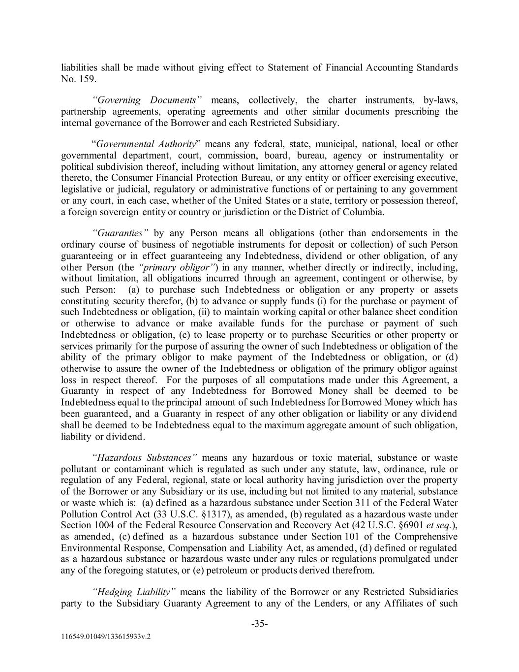 -35- 116549.01049/133615933v.2 liabilities shall be made without giving effect to Statement of Financial Accounting Standards No. 159. “Governing Documents” means, collectively, the charter instruments, by-laws, partnership agreements, operating agreements and other similar documents prescribing the internal governance of the Borrower and each Restricted Subsidiary. “Governmental Authority” means any federal, state, municipal, national, local or other governmental department, court, commission, board, bureau, agency or instrumentality or political subdivision thereof, including without limitation, any attorney general or agency related thereto, the Consumer Financial Protection Bureau, or any entity or officer exercising executive, legislative or judicial, regulatory or administrative functions of or pertaining to any government or any court, in each case, whether of the United States or a state, territory or possession thereof, a foreign sovereign entity or country or jurisdiction or the District of Columbia. “Guaranties” by any Person means all obligations (other than endorsements in the ordinary course of business of negotiable instruments for deposit or collection) of such Person guaranteeing or in effect guaranteeing any Indebtedness, dividend or other obligation, of any other Person (the “primary obligor”) in any manner, whether directly or indirectly, including, without limitation, all obligations incurred through an agreement, contingent or otherwise, by such Person: (a) to purchase such Indebtedness or obligation or any property or assets constituting security therefor, (b) to advance or supply funds (i) for the purchase or payment of such Indebtedness or obligation, (ii) to maintain working capital or other balance sheet condition or otherwise to advance or make available funds for the purchase or payment of such Indebtedness or obligation, (c) to lease property or to purchase Securities or other property or services primarily for the purpose of assuring the owner of such Indebtedness or obligation of the ability of the primary obligor to make payment of the Indebtedness or obligation, or (d) otherwise to assure the owner of the Indebtedness or obligation of the primary obligor against loss in respect thereof. For the purposes of all computations made under this Agreement, a Guaranty in respect of any Indebtedness for Borrowed Money shall be deemed to be Indebtedness equal to the principal amount of such Indebtedness for Borrowed Money which has been guaranteed, and a Guaranty in respect of any other obligation or liability or any dividend shall be deemed to be Indebtedness equal to the maximum aggregate amount of such obligation, liability or dividend. “Hazardous Substances” means any hazardous or toxic material, substance or waste pollutant or contaminant which is regulated as such under any statute, law, ordinance, rule or regulation of any Federal, regional, state or local authority having jurisdiction over the property of the Borrower or any Subsidiary or its use, including but not limited to any material, substance or waste which is: (a) defined as a hazardous substance under Section 311 of the Federal Water Pollution Control Act (33 U.S.C. §1317), as amended, (b) regulated as a hazardous waste under Section 1004 of the Federal Resource Conservation and Recovery Act (42 U.S.C. §6901 et seq.), as amended, (c) defined as a hazardous substance under Section 101 of the Comprehensive Environmental Response, Compensation and Liability Act, as amended, (d) defined or regulated as a hazardous substance or hazardous waste under any rules or regulations promulgated under any of the foregoing statutes, or (e) petroleum or products derived therefrom. “Hedging Liability” means the liability of the Borrower or any Restricted Subsidiaries party to the Subsidiary Guaranty Agreement to any of the Lenders, or any Affiliates of such