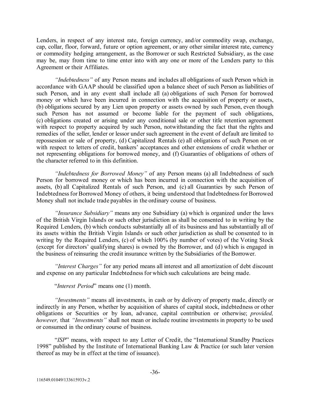 -36- 116549.01049/133615933v.2 Lenders, in respect of any interest rate, foreign currency, and/or commodity swap, exchange, cap, collar, floor, forward, future or option agreement, or any other similar interest rate, currency or commodity hedging arrangement, as the Borrower or such Restricted Subsidiary, as the case may be, may from time to time enter into with any one or more of the Lenders party to this Agreement or their Affiliates. “Indebtedness” of any Person means and includes all obligations of such Person which in accordance with GAAP should be classified upon a balance sheet of such Person as liabilities of such Person, and in any event shall include all (a) obligations of such Person for borrowed money or which have been incurred in connection with the acquisition of property or assets, (b) obligations secured by any Lien upon property or assets owned by such Person, even though such Person has not assumed or become liable for the payment of such obligations, (c) obligations created or arising under any conditional sale or other title retention agreement with respect to property acquired by such Person, notwithstanding the fact that the rights and remedies of the seller, lender or lessor under such agreement in the event of default are limited to repossession or sale of property, (d) Capitalized Rentals (e) all obligations of such Person on or with respect to letters of credit, bankers’ acceptances and other extensions of credit whether or not representing obligations for borrowed money, and (f) Guaranties of obligations of others of the character referred to in this definition. “Indebtedness for Borrowed Money” of any Person means (a) all Indebtedness of such Person for borrowed money or which has been incurred in connection with the acquisition of assets, (b) all Capitalized Rentals of such Person, and (c) all Guaranties by such Person of Indebtedness for Borrowed Money of others, it being understood that Indebtedness for Borrowed Money shall not include trade payables in the ordinary course of business. “Insurance Subsidiary” means any one Subsidiary (a) which is organized under the laws of the British Virgin Islands or such other jurisdiction as shall be consented to in writing by the Required Lenders, (b) which conducts substantially all of its business and has substantially all of its assets within the British Virgin Islands or such other jurisdiction as shall be consented to in writing by the Required Lenders, (c) of which 100% (by number of votes) of the Voting Stock (except for directors’ qualifying shares) is owned by the Borrower, and (d) which is engaged in the business of reinsuring the credit insurance written by the Subsidiaries of the Borrower. “Interest Charges” for any period means all interest and all amortization of debt discount and expense on any particular Indebtedness for which such calculations are being made. “Interest Period” means one (1) month. “Investments” means all investments, in cash or by delivery of property made, directly or indirectly in any Person, whether by acquisition of shares of capital stock, indebtedness or other obligations or Securities or by loan, advance, capital contribution or otherwise; provided, however, that “Investments” shall not mean or include routine investments in property to be used or consumed in the ordinary course of business. “ISP” means, with respect to any Letter of Credit, the “International Standby Practices 1998” published by the Institute of International Banking Law & Practice (or such later version thereof as may be in effect at the time of issuance).