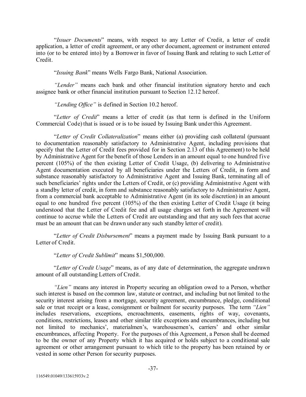 -37- 116549.01049/133615933v.2 “Issuer Documents” means, with respect to any Letter of Credit, a letter of credit application, a letter of credit agreement, or any other document, agreement or instrument entered into (or to be entered into) by a Borrower in favor of Issuing Bank and relating to such Letter of Credit. “Issuing Bank” means Wells Fargo Bank, National Association. “Lender” means each bank and other financial institution signatory hereto and each assignee bank or other financial institution pursuant to Section 12.12 hereof. “Lending Office” is defined in Section 10.2 hereof. “Letter of Credit” means a letter of credit (as that term is defined in the Uniform Commercial Code) that is issued or is to be issued by Issuing Bank under this Agreement. “Letter of Credit Collateralization” means either (a) providing cash collateral (pursuant to documentation reasonably satisfactory to Administrative Agent, including provisions that specify that the Letter of Credit fees provided for in Section 2.13 of this Agreement) to be held by Administrative Agent for the benefit of those Lenders in an amount equal to one hundred f ive percent (105%) of the then existing Letter of Credit Usage, (b) delivering to Administrative Agent documentation executed by all beneficiaries under the Letters of Credit, in form and substance reasonably satisfactory to Administrative Agent and Issuing Bank, terminating all of such beneficiaries’ rights under the Letters of Credit, or (c) providing Administrative Agent with a standby letter of credit, in form and substance reasonably satisfactory to Administrative Agent, from a commercial bank acceptable to Administrative Agent (in its sole discretion) in an amount equal to one hundred five percent (105%) of the then existing Letter of Credit Usage (it being understood that the Letter of Credit fee and all usage charges set forth in the Agreement will continue to accrue while the Letters of Credit are outstanding and that any such fees that accrue must be an amount that can be drawn under any such standby letter of credit). “Letter of Credit Disbursement” means a payment made by Issuing Bank pursuant to a Letter of Credit. “Letter of Credit Sublimit” means $1,500,000. “Letter of Credit Usage” means, as of any date of determination, the aggregate undrawn amount of all outstanding Letters of Credit. “Lien” means any interest in Property securing an obligation owed to a Person, whether such interest is based on the common law, statute or contract, and including but not limited to the security interest arising from a mortgage, security agreement, encumbrance, pledge, conditional sale or trust receipt or a lease, consignment or bailment for security purposes. The term “Lien” includes reservations, exceptions, encroachments, easements, rights of way, covenants, conditions, restrictions, leases and other similar title exceptions and encumbrances, including but not limited to mechanics’, materialmen’s, warehousemen’s, carriers’ and other similar encumbrances, affecting Property. For the purposes of this Agreement, a Person shall be deemed to be the owner of any Property which it has acquired or holds subject to a conditional sale agreement or other arrangement pursuant to which title to the property has been retained by or vested in some other Person for security purposes.