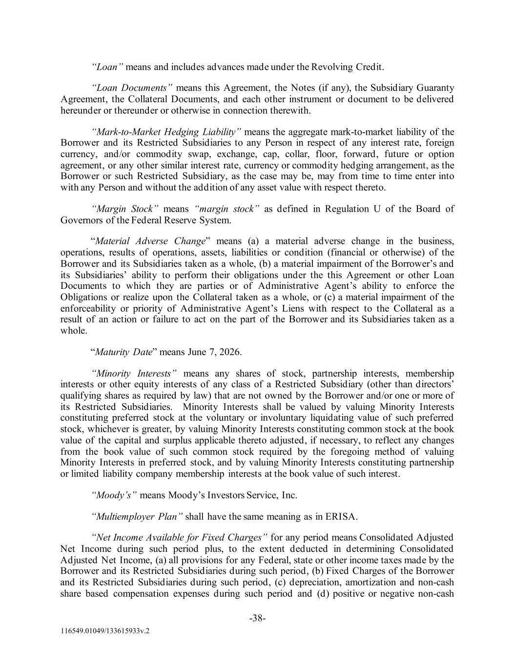 -38- 116549.01049/133615933v.2 “Loan” means and includes advances made under the Revolving Credit. “Loan Documents” means this Agreement, the Notes (if any), the Subsidiary Guaranty Agreement, the Collateral Documents, and each other instrument or document to be delivered hereunder or thereunder or otherwise in connection therewith. “Mark-to-Market Hedging Liability” means the aggregate mark-to-market liability of the Borrower and its Restricted Subsidiaries to any Person in respect of any interest rate, foreign currency, and/or commodity swap, exchange, cap, collar, floor, forward, future or option agreement, or any other similar interest rate, currency or commodity hedging arrangement, as the Borrower or such Restricted Subsidiary, as the case may be, may from time to time enter into with any Person and without the addition of any asset value with respect thereto. “Margin Stock” means “margin stock” as defined in Regulation U of the Board of Governors of the Federal Reserve System. “Material Adverse Change” means (a) a material adverse change in the business, operations, results of operations, assets, liabilities or condition (financial or otherwise) of the Borrower and its Subsidiaries taken as a whole, (b) a material impairment of the Borrower’s and its Subsidiaries’ ability to perform their obligations under the this Agreement or other Loan Documents to which they are parties or of Administrative Agent’s ability to enforce the Obligations or realize upon the Collateral taken as a whole, or (c) a material impairment of the enforceability or priority of Administrative Agent’s Liens with respect to the Collateral as a result of an action or failure to act on the part of the Borrower and its Subsidiaries taken as a whole. “Maturity Date” means June 7, 2026. “Minority Interests” means any shares of stock, partnership interests, membership interests or other equity interests of any class of a Restricted Subsidiary (other than directors’ qualifying shares as required by law) that are not owned by the Borrower and/or one or more of its Restricted Subsidiaries. Minority Interests shall be valued by valuing Minority Interests constituting preferred stock at the voluntary or involuntary liquidating value of such preferred stock, whichever is greater, by valuing Minority Interests constituting common stock at the book value of the capital and surplus applicable thereto adjusted, if necessary, to reflect any changes from the book value of such common stock required by the foregoing method of valuing Minority Interests in preferred stock, and by valuing Minority Interests constituting partnership or limited liability company membership interests at the book value of such interest. “Moody’s” means Moody’s Investors Service, Inc. “Multiemployer Plan” shall have the same meaning as in ERISA. “Net Income Available for Fixed Charges” for any period means Consolidated Adjusted Net Income during such period plus, to the extent deducted in determining Consolidated Adjusted Net Income, (a) all provisions for any Federal, state or other income taxes made by the Borrower and its Restricted Subsidiaries during such period, (b) Fixed Charges of the Borrower and its Restricted Subsidiaries during such period, (c) depreciation, amortization and non-cash share based compensation expenses during such period and (d) positive or negative non-cash