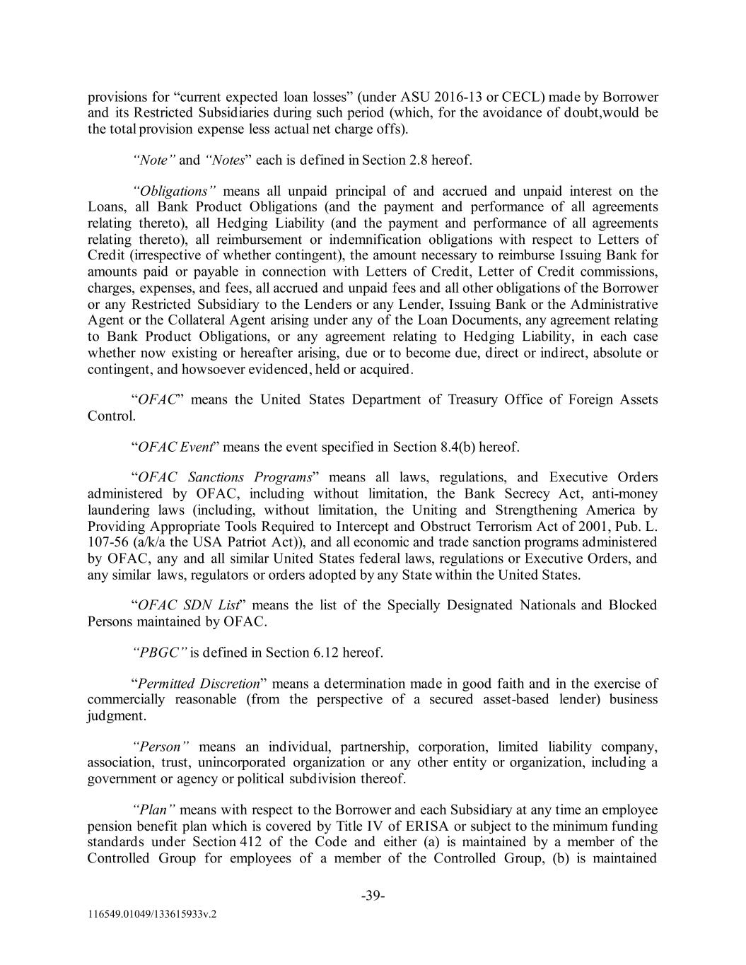 -39- 116549.01049/133615933v.2 provisions for “current expected loan losses” (under ASU 2016-13 or CECL) made by Borrower and its Restricted Subsidiaries during such period (which, for the avoidance of doubt,would be the total provision expense less actual net charge offs). “Note” and “Notes” each is defined in Section 2.8 hereof. “Obligations” means all unpaid principal of and accrued and unpaid interest on the Loans, all Bank Product Obligations (and the payment and performance of all agreements relating thereto), all Hedging Liability (and the payment and performance of all agreements relating thereto), all reimbursement or indemnification obligations with respect to Letters of Credit (irrespective of whether contingent), the amount necessary to reimburse Issuing Bank for amounts paid or payable in connection with Letters of Credit, Letter of Credit commissions, charges, expenses, and fees, all accrued and unpaid fees and all other obligations of the Borrower or any Restricted Subsidiary to the Lenders or any Lender, Issuing Bank or the Administrative Agent or the Collateral Agent arising under any of the Loan Documents, any agreement relating to Bank Product Obligations, or any agreement relating to Hedging Liability, in each case whether now existing or hereafter arising, due or to become due, direct or indirect, absolute or contingent, and howsoever evidenced, held or acquired. “OFAC” means the United States Department of Treasury Office of Foreign Assets Control. “OFAC Event” means the event specified in Section 8.4(b) hereof. “OFAC Sanctions Programs” means all laws, regulations, and Executive Orders administered by OFAC, including without limitation, the Bank Secrecy Act, anti-money laundering laws (including, without limitation, the Uniting and Strengthening America by Providing Appropriate Tools Required to Intercept and Obstruct Terrorism Act of 2001, Pub. L. 107-56 (a/k/a the USA Patriot Act)), and all economic and trade sanction programs administered by OFAC, any and all similar United States federal laws, regulations or Executive Orders, and any similar laws, regulators or orders adopted by any State within the United States. “OFAC SDN List” means the list of the Specially Designated Nationals and Blocked Persons maintained by OFAC. “PBGC” is defined in Section 6.12 hereof. “Permitted Discretion” means a determination made in good faith and in the exercise of commercially reasonable (from the perspective of a secured asset-based lender) business judgment. “Person” means an individual, partnership, corporation, limited liability company, association, trust, unincorporated organization or any other entity or organization, including a government or agency or political subdivision thereof. “Plan” means with respect to the Borrower and each Subsidiary at any time an employee pension benefit plan which is covered by Title IV of ERISA or subject to the minimum funding standards under Section 412 of the Code and either (a) is maintained by a member of the Controlled Group for employees of a member of the Controlled Group, (b) is maintained