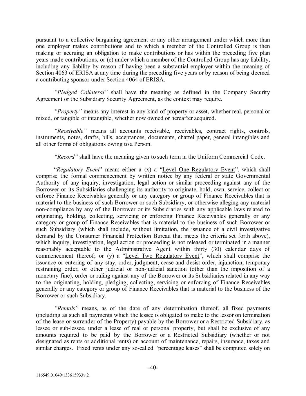 -40- 116549.01049/133615933v.2 pursuant to a collective bargaining agreement or any other arrangement under which more than one employer makes contributions and to which a member of the Controlled Group is then making or accruing an obligation to make contributions or has within the preceding five plan years made contributions, or (c) under which a member of the Controlled Group has any liability, including any liability by reason of having been a substantial employer within the meaning of Section 4063 of ERISA at any time during the preceding five years or by reason of being deemed a contributing sponsor under Section 4064 of ERISA. “Pledged Collateral” shall have the meaning as defined in the Company Security Agreement or the Subsidiary Security Agreement, as the context may require. “Property” means any interest in any kind of property or asset, whether real, personal or mixed, or tangible or intangible, whether now owned or hereafter acquired. “Receivable” means all accounts receivable, receivables, contract rights, controls, instruments, notes, drafts, bills, acceptances, documents, chattel paper, general intangibles and all other forms of obligations owing to a Person. “Record” shall have the meaning given to such term in the Uniform Commercial Code. “Regulatory Event” mean: either a (x) a “Level One Regulatory Event”, which shall comprise the formal commencement by written notice by any federal or state Governmental Authority of any inquiry, investigation, legal action or similar proceeding against any of the Borrower or its Subsidiaries challenging its authority to originate, hold, own, service, collect or enforce Finance Receivables generally or any category or group of Finance Receivables that is material to the business of such Borrower or such Subsidiary, or otherwise alleging any material non-compliance by any of the Borrower or its Subsidiaries with any applicable laws related to originating, holding, collecting, servicing or enforcing Finance Receivables generally or any category or group of Finance Receivables that is material to the business of such Borrower or such Subsidiary (which shall include, without limitation, the issuance of a civil investigative demand by the Consumer Financial Protection Bureau that meets the criteria set forth above), which inquiry, investigation, legal action or proceeding is not released or terminated in a manner reasonably acceptable to the Administrative Agent within thirty (30) calendar days of commencement thereof; or (y) a “Level Two Regulatory Event”, which shall comprise the issuance or entering of any stay, order, judgment, cease and desist order, injunction, temporary restraining order, or other judicial or non-judicial sanction (other than the imposition of a monetary fine), order or ruling against any of the Borrower or its Subsidiaries related in any way to the originating, holding, pledging, collecting, servicing or enforcing of Finance Receivables generally or any category or group of Finance Receivables that is material to the business of the Borrower or such Subsidiary. “Rentals” means, as of the date of any determination thereof, all fixed payments (including as such all payments which the lessee is obligated to make to the lessor on termination of the lease or surrender of the Property) payable by the Borrower or a Restricted Subsidiary, as lessee or sub-lessee, under a lease of real or personal property, but shall be exclusive of any amounts required to be paid by the Borrower or a Restricted Subsidiary (whether or not designated as rents or additional rents) on account of maintenance, repairs, insurance, taxes and similar charges. Fixed rents under any so-called “percentage leases” shall be computed solely on