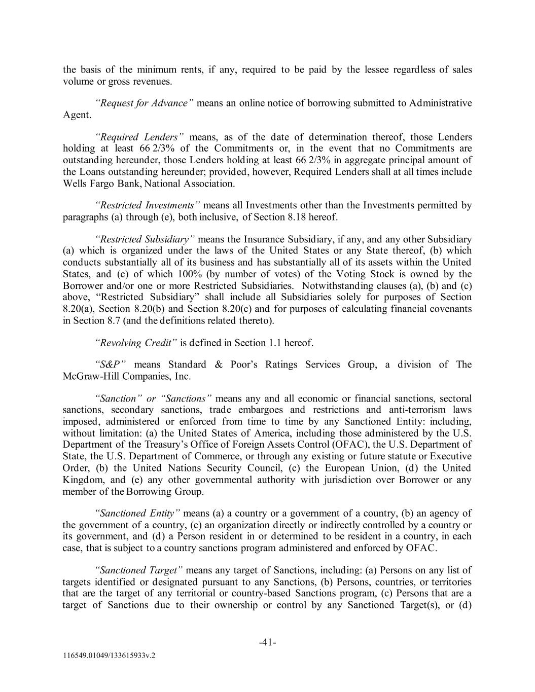 -41- 116549.01049/133615933v.2 the basis of the minimum rents, if any, required to be paid by the lessee regardless of sales volume or gross revenues. “Request for Advance” means an online notice of borrowing submitted to Administrative Agent. “Required Lenders” means, as of the date of determination thereof, those Lenders holding at least 66 2/3% of the Commitments or, in the event that no Commitments are outstanding hereunder, those Lenders holding at least 66 2/3% in aggregate principal amount of the Loans outstanding hereunder; provided, however, Required Lenders shall at all times include Wells Fargo Bank, National Association. “Restricted Investments” means all Investments other than the Investments permitted by paragraphs (a) through (e), both inclusive, of Section 8.18 hereof. “Restricted Subsidiary” means the Insurance Subsidiary, if any, and any other Subsidiary (a) which is organized under the laws of the United States or any State thereof, (b) which conducts substantially all of its business and has substantially all of its assets within the United States, and (c) of which 100% (by number of votes) of the Voting Stock is owned by the Borrower and/or one or more Restricted Subsidiaries. Notwithstanding clauses (a), (b) and (c) above, “Restricted Subsidiary” shall include all Subsidiaries solely for purposes of Section 8.20(a), Section 8.20(b) and Section 8.20(c) and for purposes of calculating financial covenants in Section 8.7 (and the definitions related thereto). “Revolving Credit” is defined in Section 1.1 hereof. “S&P” means Standard & Poor’s Ratings Services Group, a division of The McGraw-Hill Companies, Inc. “Sanction” or “Sanctions” means any and all economic or financial sanctions, sectoral sanctions, secondary sanctions, trade embargoes and restrictions and anti-terrorism laws imposed, administered or enforced from time to time by any Sanctioned Entity: including, without limitation: (a) the United States of America, including those administered by the U.S. Department of the Treasury’s Office of Foreign Assets Control (OFAC), the U.S. Department of State, the U.S. Department of Commerce, or through any existing or future statute or Executive Order, (b) the United Nations Security Council, (c) the European Union, (d) the United Kingdom, and (e) any other governmental authority with jurisdiction over Borrower or any member of the Borrowing Group. “Sanctioned Entity” means (a) a country or a government of a country, (b) an agency of the government of a country, (c) an organization directly or indirectly controlled by a country or its government, and (d) a Person resident in or determined to be resident in a country, in each case, that is subject to a country sanctions program administered and enforced by OFAC. “Sanctioned Target” means any target of Sanctions, including: (a) Persons on any list of targets identified or designated pursuant to any Sanctions, (b) Persons, countries, or territories that are the target of any territorial or country-based Sanctions program, (c) Persons that are a target of Sanctions due to their ownership or control by any Sanctioned Target(s), or (d)