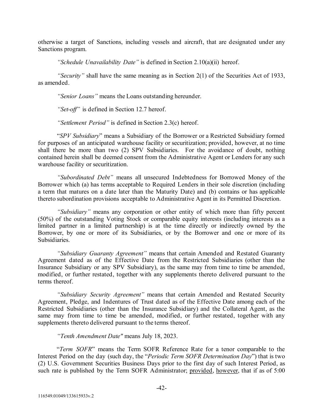 -42- 116549.01049/133615933v.2 otherwise a target of Sanctions, including vessels and aircraft, that are designated under any Sanctions program. “Schedule Unavailability Date” is defined in Section 2.10(a)(ii) hereof. “Security” shall have the same meaning as in Section 2(1) of the Securities Act of 1933, as amended. “Senior Loans” means the Loans outstanding hereunder. “Set-off” is defined in Section 12.7 hereof. “Settlement Period” is defined in Section 2.3(c) hereof. “SPV Subsidiary” means a Subsidiary of the Borrower or a Restricted Subsidiary formed for purposes of an anticipated warehouse facility or securitization; provided, however, at no time shall there be more than two (2) SPV Subsidiaries. For the avoidance of doubt, nothing contained herein shall be deemed consent from the Administrative Agent or Lenders for any such warehouse facility or securitization. “Subordinated Debt” means all unsecured Indebtedness for Borrowed Money of the Borrower which (a) has terms acceptable to Required Lenders in their sole discretion (including a term that matures on a date later than the Maturity Date) and (b) contains or has applicable thereto subordination provisions acceptable to Administrative Agent in its Permitted Discretion. “Subsidiary” means any corporation or other entity of which more than fifty percent (50%) of the outstanding Voting Stock or comparable equity interests (including interests as a limited partner in a limited partnership) is at the time directly or indirectly owned by the Borrower, by one or more of its Subsidiaries, or by the Borrower and one or more of its Subsidiaries. “Subsidiary Guaranty Agreement” means that certain Amended and Restated Guaranty Agreement dated as of the Effective Date from the Restricted Subsidiaries (other than the Insurance Subsidiary or any SPV Subsidiary), as the same may from time to time be amended, modified, or further restated, together with any supplements thereto delivered pursuant to the terms thereof. “Subsidiary Security Agreement” means that certain Amended and Restated Security Agreement, Pledge, and Indentures of Trust dated as of the Effective Date among each of the Restricted Subsidiaries (other than the Insurance Subsidiary) and the Collateral Agent, as the same may from time to time be amended, modified, or further restated, together with any supplements thereto delivered pursuant to the terms thereof. “Tenth Amendment Date" means July 18, 2023. “Term SOFR” means the Term SOFR Reference Rate for a tenor comparable to the Interest Period on the day (such day, the “Periodic Term SOFR Determination Day”) that is two (2) U.S. Government Securities Business Days prior to the first day of such Interest Period, as such rate is published by the Term SOFR Administrator; provided, however, that if as of 5:00