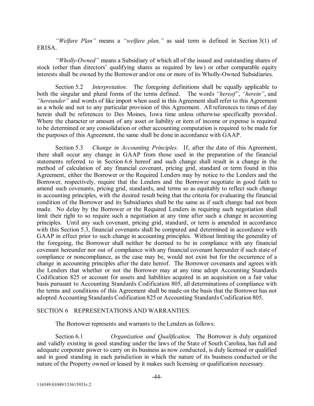 -44- 116549.01049/133615933v.2 “Welfare Plan” means a “welfare plan,” as said term is defined in Section 3(1) of ERISA. “Wholly-Owned” means a Subsidiary of which all of the issued and outstanding shares of stock (other than directors’ qualifying shares as required by law) or other comparable equity interests shall be owned by the Borrower and/or one or more of its Wholly-Owned Subsidiaries. Section 5.2 Interpretation. The foregoing definitions shall be equally applicable to both the singular and plural forms of the terms defined. The words “hereof”, “herein”, and “hereunder” and words of like import when used in this Agreement shall refer to this Agreement as a whole and not to any particular provision of this Agreement. All references to times of day herein shall be references to Des Moines, Iowa time unless otherwise specifically provided. Where the character or amount of any asset or liability or item of income or expense is required to be determined or any consolidation or other accounting computation is required to be made for the purposes of this Agreement, the same shall be done in accordance with GAAP. Section 5.3 Change in Accounting Principles. If, after the date of this Agreement, there shall occur any change in GAAP from those used in the preparation of the financial statements referred to in Section 6.6 hereof and such change shall result in a change in the method of calculation of any financial covenant, pricing grid, standard or term found in this Agreement, either the Borrower or the Required Lenders may by notice to the Lenders and the Borrower, respectively, require that the Lenders and the Borrower negotiate in good faith to amend such covenants, pricing grid, standards, and terms so as equitably to reflect such change in accounting principles, with the desired result being that the criteria for evaluating the financial condition of the Borrower and its Subsidiaries shall be the same as if such change had not been made. No delay by the Borrower or the Required Lenders in requiring such negotiation shall limit their right to so require such a negotiation at any time after such a change in accounting principles. Until any such covenant, pricing grid, standard, or term is amended in accordance with this Section 5.3, financial covenants shall be computed and determined in accordance with GAAP in effect prior to such change in accounting principles. Without limiting the generality of the foregoing, the Borrower shall neither be deemed to be in compliance with any financial covenant hereunder nor out of compliance with any financial covenant hereunder if such state of compliance or noncompliance, as the case may be, would not exist but for the occurrence of a change in accounting principles after the date hereof. The Borrower covenants and agrees with the Lenders that whether or not the Borrower may at any time adopt Accounting Standards Codification 825 or account for assets and liabilities acquired in an acquisition on a fair value basis pursuant to Accounting Standards Codification 805, all determinations of compliance with the terms and conditions of this Agreement shall be made on the basis that the Borrower has not adopted Accounting Standards Codification 825 or Accounting Standards Codification 805. SECTION 6 REPRESENTATIONS AND WARRANTIES. The Borrower represents and warrants to the Lenders as follows: Section 6.1 Organization and Qualification. The Borrower is duly organized and validly existing in good standing under the laws of the State of South Carolina, has full and adequate corporate power to carry on its business as now conducted, is duly licensed or qualified and in good standing in each jurisdiction in which the nature of its business conducted or the nature of the Property owned or leased by it makes such licensing or qualification necessary.