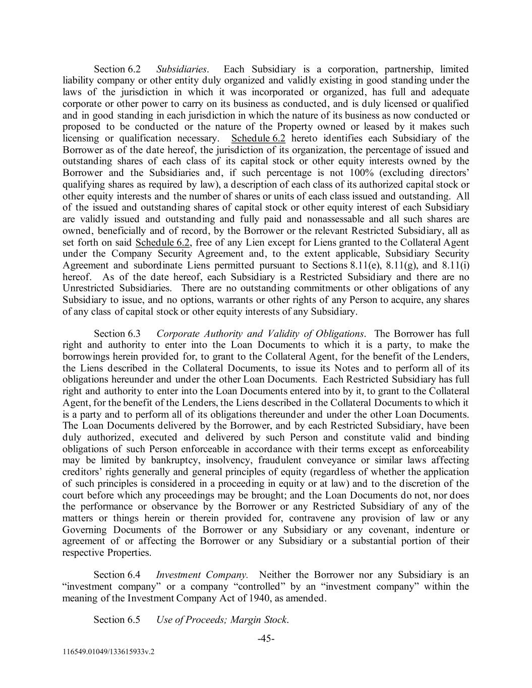 -45- 116549.01049/133615933v.2 Section 6.2 Subsidiaries. Each Subsidiary is a corporation, partnership, limited liability company or other entity duly organized and validly existing in good standing under the laws of the jurisdiction in which it was incorporated or organized, has full and adequate corporate or other power to carry on its business as conducted, and is duly licensed or qualified and in good standing in each jurisdiction in which the nature of its business as now conducted or proposed to be conducted or the nature of the Property owned or leased by it makes such licensing or qualification necessary. Schedule 6.2 hereto identifies each Subsidiary of the Borrower as of the date hereof, the jurisdiction of its organization, the percentage of issued and outstanding shares of each class of its capital stock or other equity interests owned by the Borrower and the Subsidiaries and, if such percentage is not 100% (excluding directors’ qualifying shares as required by law), a description of each class of its authorized capital stock or other equity interests and the number of shares or units of each class issued and outstanding. All of the issued and outstanding shares of capital stock or other equity interest of each Subsidiary are validly issued and outstanding and fully paid and nonassessable and all such shares are owned, beneficially and of record, by the Borrower or the relevant Restricted Subsidiary, all as set forth on said Schedule 6.2, free of any Lien except for Liens granted to the Collateral Agent under the Company Security Agreement and, to the extent applicable, Subsidiary Security Agreement and subordinate Liens permitted pursuant to Sections 8.11(e), 8.11(g), and 8.11(i) hereof. As of the date hereof, each Subsidiary is a Restricted Subsidiary and there are no Unrestricted Subsidiaries. There are no outstanding commitments or other obligations of any Subsidiary to issue, and no options, warrants or other rights of any Person to acquire, any shares of any class of capital stock or other equity interests of any Subsidiary. Section 6.3 Corporate Authority and Validity of Obligations. The Borrower has full right and authority to enter into the Loan Documents to which it is a party, to make the borrowings herein provided for, to grant to the Collateral Agent, for the benefit of the Lenders, the Liens described in the Collateral Documents, to issue its Notes and to perform all of its obligations hereunder and under the other Loan Documents. Each Restricted Subsidiary has full right and authority to enter into the Loan Documents entered into by it, to grant to the Collateral Agent, for the benefit of the Lenders, the Liens described in the Collateral Documents to which it is a party and to perform all of its obligations thereunder and under the other Loan Documents. The Loan Documents delivered by the Borrower, and by each Restricted Subsidiary, have been duly authorized, executed and delivered by such Person and constitute valid and binding obligations of such Person enforceable in accordance with their terms except as enforceability may be limited by bankruptcy, insolvency, fraudulent conveyance or similar laws affecting creditors’ rights generally and general principles of equity (regardless of whether the application of such principles is considered in a proceeding in equity or at law) and to the discretion of the court before which any proceedings may be brought; and the Loan Documents do not, nor does the performance or observance by the Borrower or any Restricted Subsidiary of any of the matters or things herein or therein provided for, contravene any provision of law or any Governing Documents of the Borrower or any Subsidiary or any covenant, indenture or agreement of or affecting the Borrower or any Subsidiary or a substantial portion of their respective Properties. Section 6.4 Investment Company. Neither the Borrower nor any Subsidiary is an “investment company” or a company “controlled” by an “investment company” within the meaning of the Investment Company Act of 1940, as amended. Section 6.5 Use of Proceeds; Margin Stock.