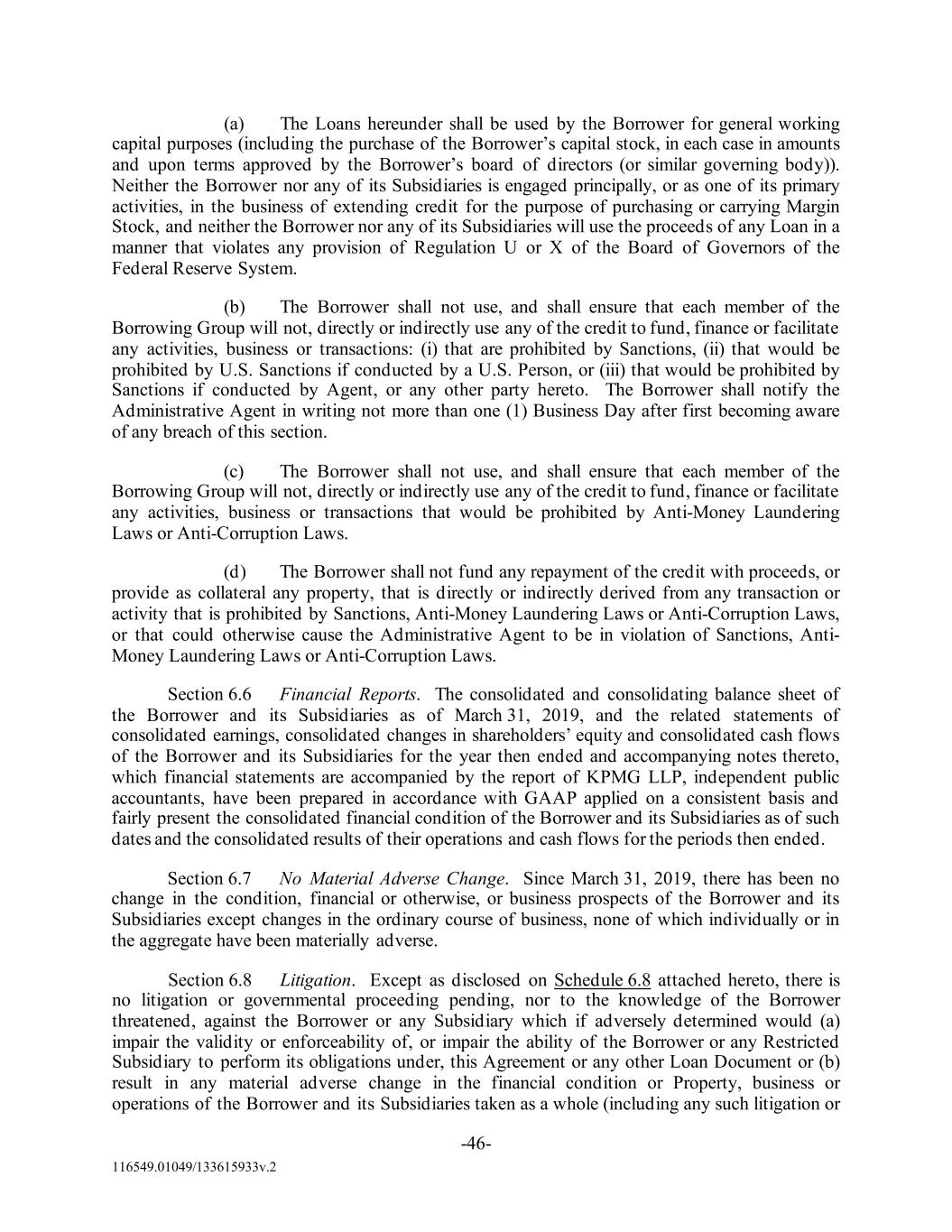 -46- 116549.01049/133615933v.2 (a) The Loans hereunder shall be used by the Borrower for general working capital purposes (including the purchase of the Borrower’s capital stock, in each case in amounts and upon terms approved by the Borrower’s board of directors (or similar governing body)). Neither the Borrower nor any of its Subsidiaries is engaged principally, or as one of its primary activities, in the business of extending credit for the purpose of purchasing or carrying Margin Stock, and neither the Borrower nor any of its Subsidiaries will use the proceeds of any Loan in a manner that violates any provision of Regulation U or X of the Board of Governors of the Federal Reserve System. (b) The Borrower shall not use, and shall ensure that each member of the Borrowing Group will not, directly or indirectly use any of the credit to fund, finance or facilitate any activities, business or transactions: (i) that are prohibited by Sanctions, (ii) that would be prohibited by U.S. Sanctions if conducted by a U.S. Person, or (iii) that would be prohibited by Sanctions if conducted by Agent, or any other party hereto. The Borrower shall notify the Administrative Agent in writing not more than one (1) Business Day after first becoming aware of any breach of this section. (c) The Borrower shall not use, and shall ensure that each member of the Borrowing Group will not, directly or indirectly use any of the credit to fund, finance or facilitate any activities, business or transactions that would be prohibited by Anti-Money Laundering Laws or Anti-Corruption Laws. (d) The Borrower shall not fund any repayment of the credit with proceeds, or provide as collateral any property, that is directly or indirectly derived from any transaction or activity that is prohibited by Sanctions, Anti-Money Laundering Laws or Anti-Corruption Laws, or that could otherwise cause the Administrative Agent to be in violation of Sanctions, Anti- Money Laundering Laws or Anti-Corruption Laws. Section 6.6 Financial Reports. The consolidated and consolidating balance sheet of the Borrower and its Subsidiaries as of March 31, 2019, and the related statements of consolidated earnings, consolidated changes in shareholders’ equity and consolidated cash flows of the Borrower and its Subsidiaries for the year then ended and accompanying notes thereto, which financial statements are accompanied by the report of KPMG LLP, independent public accountants, have been prepared in accordance with GAAP applied on a consistent basis and fairly present the consolidated financial condition of the Borrower and its Subsidiaries as of such dates and the consolidated results of their operations and cash flows for the periods then ended. Section 6.7 No Material Adverse Change. Since March 31, 2019, there has been no change in the condition, financial or otherwise, or business prospects of the Borrower and its Subsidiaries except changes in the ordinary course of business, none of which individually or in the aggregate have been materially adverse. Section 6.8 Litigation. Except as disclosed on Schedule 6.8 attached hereto, there is no litigation or governmental proceeding pending, nor to the knowledge of the Borrower threatened, against the Borrower or any Subsidiary which if adversely determined would (a) impair the validity or enforceability of, or impair the ability of the Borrower or any Restricted Subsidiary to perform its obligations under, this Agreement or any other Loan Document or (b) result in any material adverse change in the financial condition or Property, business or operations of the Borrower and its Subsidiaries taken as a whole (including any such litigation or