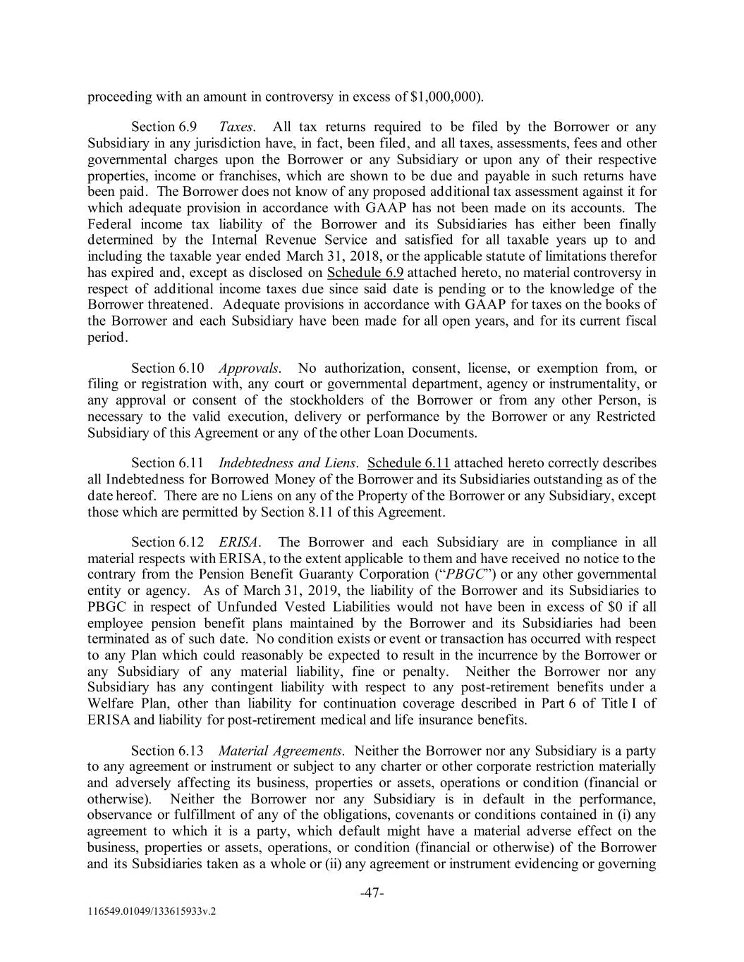 -47- 116549.01049/133615933v.2 proceeding with an amount in controversy in excess of $1,000,000). Section 6.9 Taxes. All tax returns required to be filed by the Borrower or any Subsidiary in any jurisdiction have, in fact, been filed, and all taxes, assessments, fees and other governmental charges upon the Borrower or any Subsidiary or upon any of their respective properties, income or franchises, which are shown to be due and payable in such returns have been paid. The Borrower does not know of any proposed additional tax assessment against it for which adequate provision in accordance with GAAP has not been made on its accounts. The Federal income tax liability of the Borrower and its Subsidiaries has either been finally determined by the Internal Revenue Service and satisfied for all taxable years up to and including the taxable year ended March 31, 2018, or the applicable statute of limitations therefor has expired and, except as disclosed on Schedule 6.9 attached hereto, no material controversy in respect of additional income taxes due since said date is pending or to the knowledge of the Borrower threatened. Adequate provisions in accordance with GAAP for taxes on the books of the Borrower and each Subsidiary have been made for all open years, and for its current fiscal period. Section 6.10 Approvals. No authorization, consent, license, or exemption from, or filing or registration with, any court or governmental department, agency or instrumentality, or any approval or consent of the stockholders of the Borrower or from any other Person, is necessary to the valid execution, delivery or performance by the Borrower or any Restricted Subsidiary of this Agreement or any of the other Loan Documents. Section 6.11 Indebtedness and Liens. Schedule 6.11 attached hereto correctly describes all Indebtedness for Borrowed Money of the Borrower and its Subsidiaries outstanding as of the date hereof. There are no Liens on any of the Property of the Borrower or any Subsidiary, except those which are permitted by Section 8.11 of this Agreement. Section 6.12 ERISA. The Borrower and each Subsidiary are in compliance in all material respects with ERISA, to the extent applicable to them and have received no notice to the contrary from the Pension Benefit Guaranty Corporation (“PBGC”) or any other governmental entity or agency. As of March 31, 2019, the liability of the Borrower and its Subsidiaries to PBGC in respect of Unfunded Vested Liabilities would not have been in excess of $0 if all employee pension benefit plans maintained by the Borrower and its Subsidiaries had been terminated as of such date. No condition exists or event or transaction has occurred with respect to any Plan which could reasonably be expected to result in the incurrence by the Borrower or any Subsidiary of any material liability, fine or penalty. Neither the Borrower nor any Subsidiary has any contingent liability with respect to any post-retirement benefits under a Welfare Plan, other than liability for continuation coverage described in Part 6 of Title I of ERISA and liability for post-retirement medical and life insurance benefits. Section 6.13 Material Agreements. Neither the Borrower nor any Subsidiary is a party to any agreement or instrument or subject to any charter or other corporate restriction materially and adversely affecting its business, properties or assets, operations or condition (financial or otherwise). Neither the Borrower nor any Subsidiary is in default in the performance, observance or fulfillment of any of the obligations, covenants or conditions contained in (i) any agreement to which it is a party, which default might have a material adverse effect on the business, properties or assets, operations, or condition (financial or otherwise) of the Borrower and its Subsidiaries taken as a whole or (ii) any agreement or instrument evidencing or governing